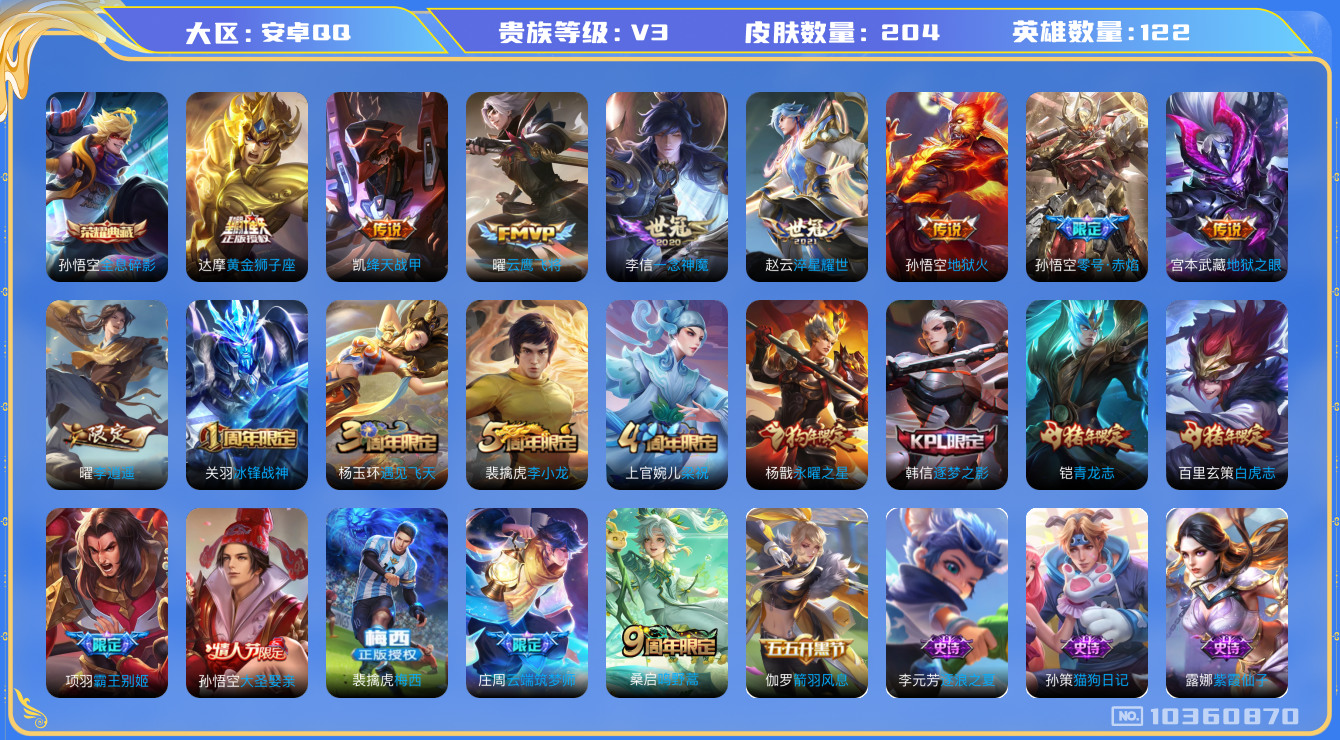 贵族等级:v3皮肤数:55生肖限定1 英雄数:74