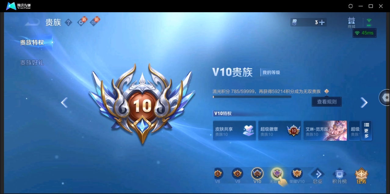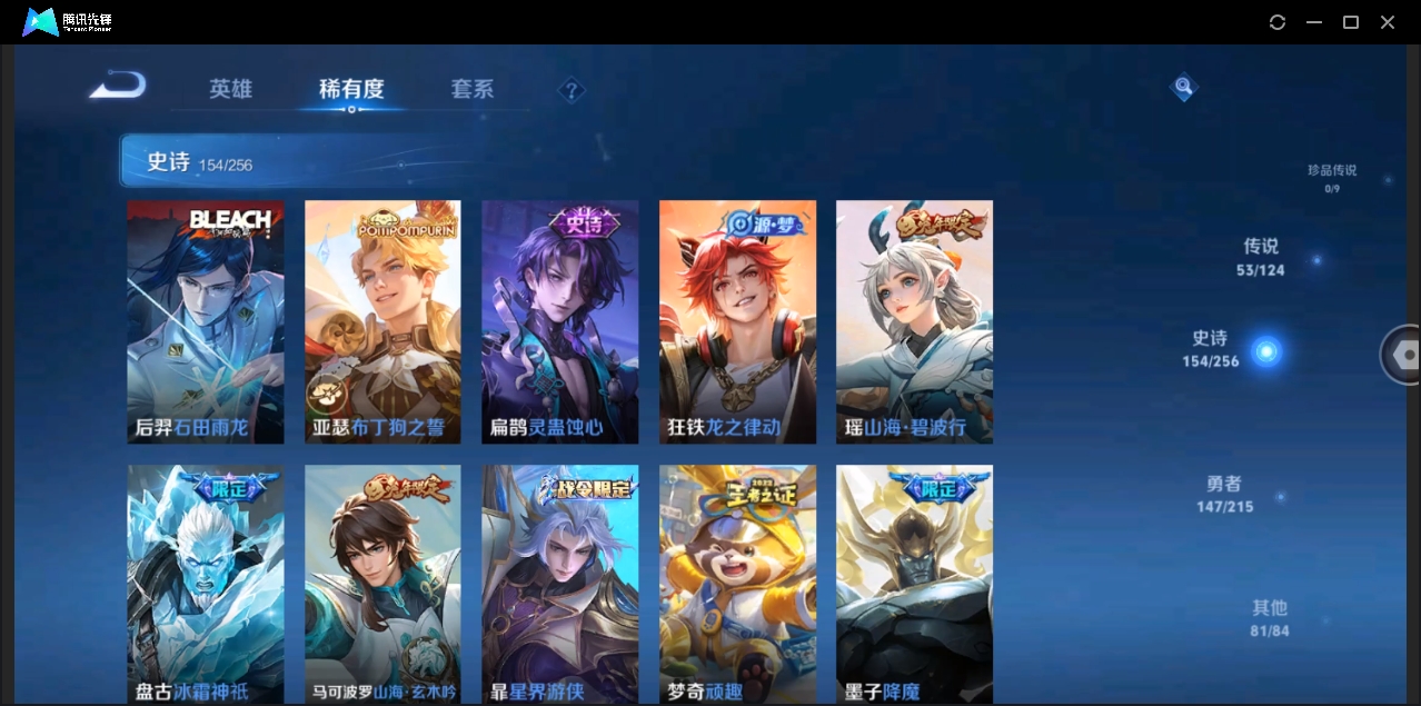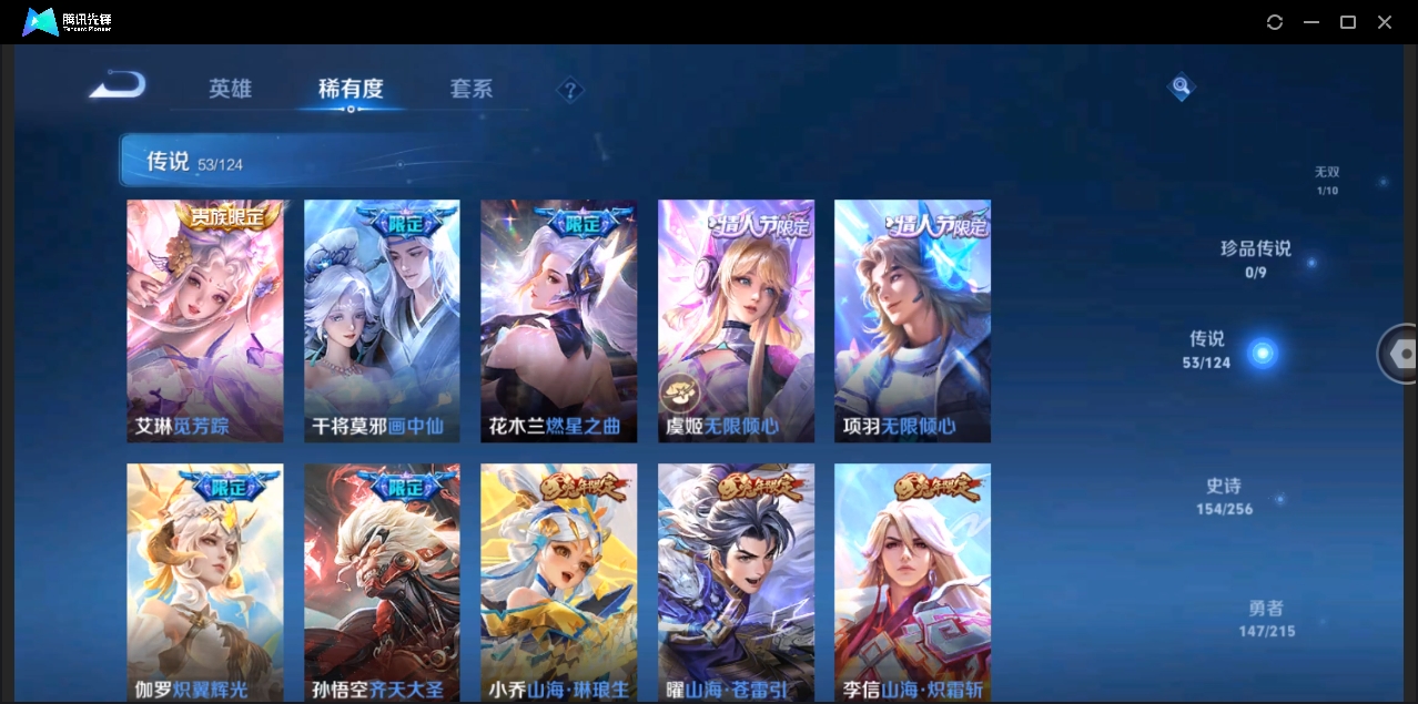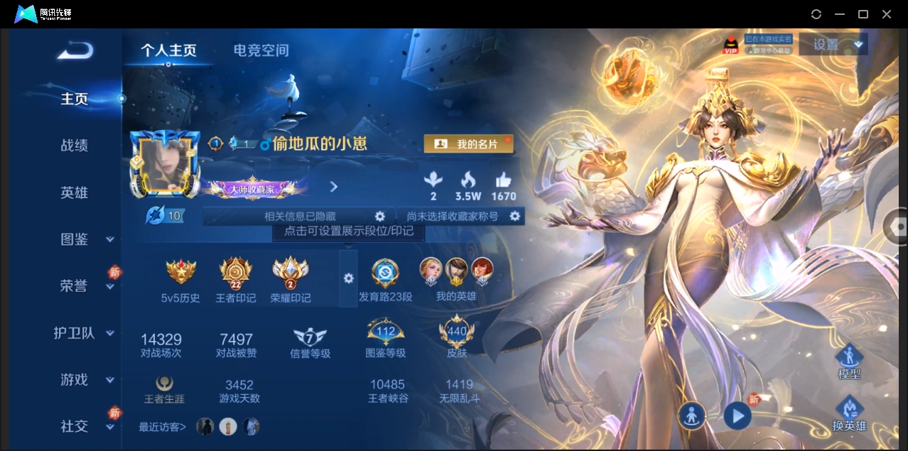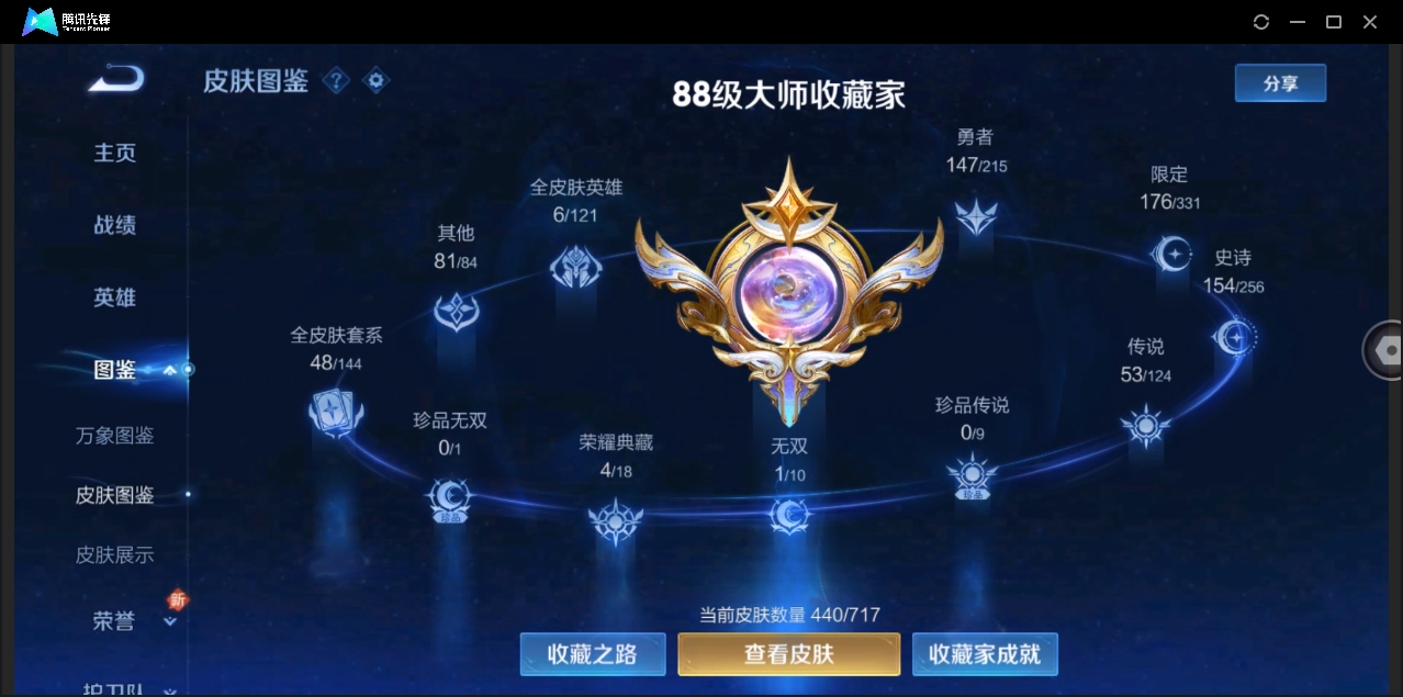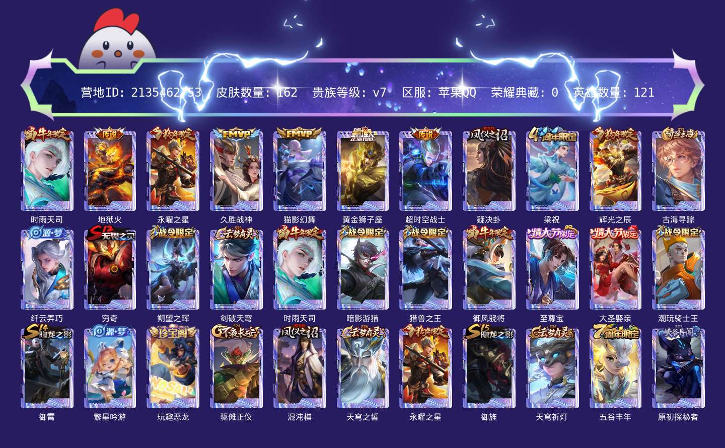 贵族等级:v7皮肤数:162生肖限定6 传说品质7 情人节限定3 英雄数:121