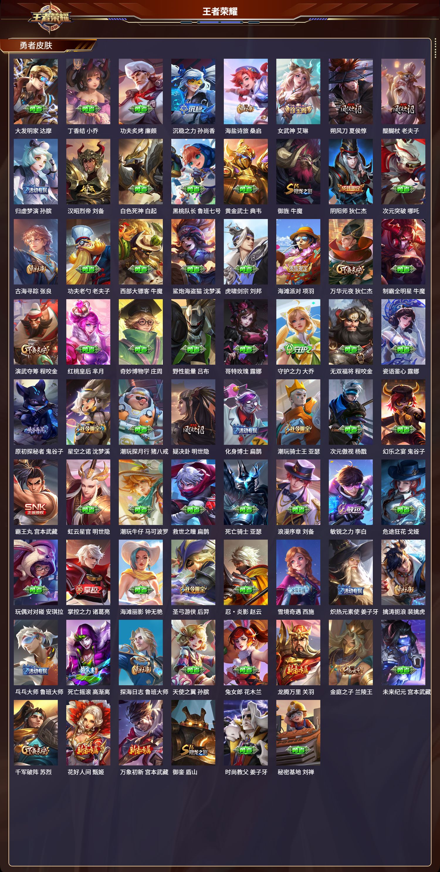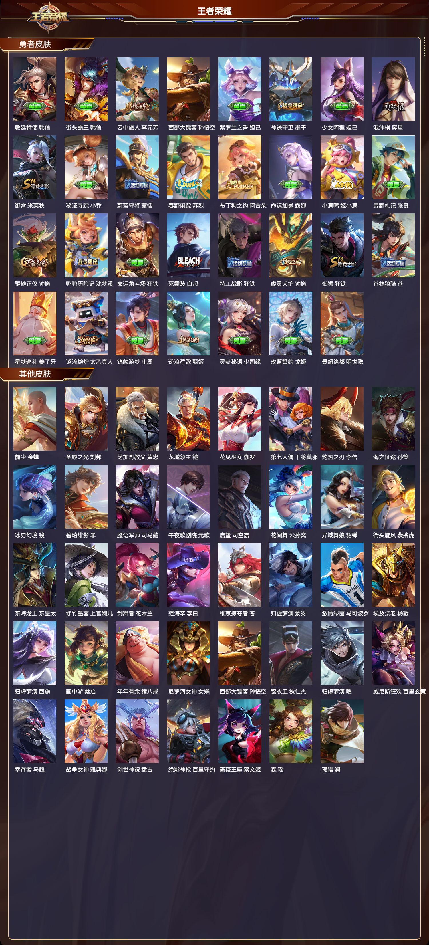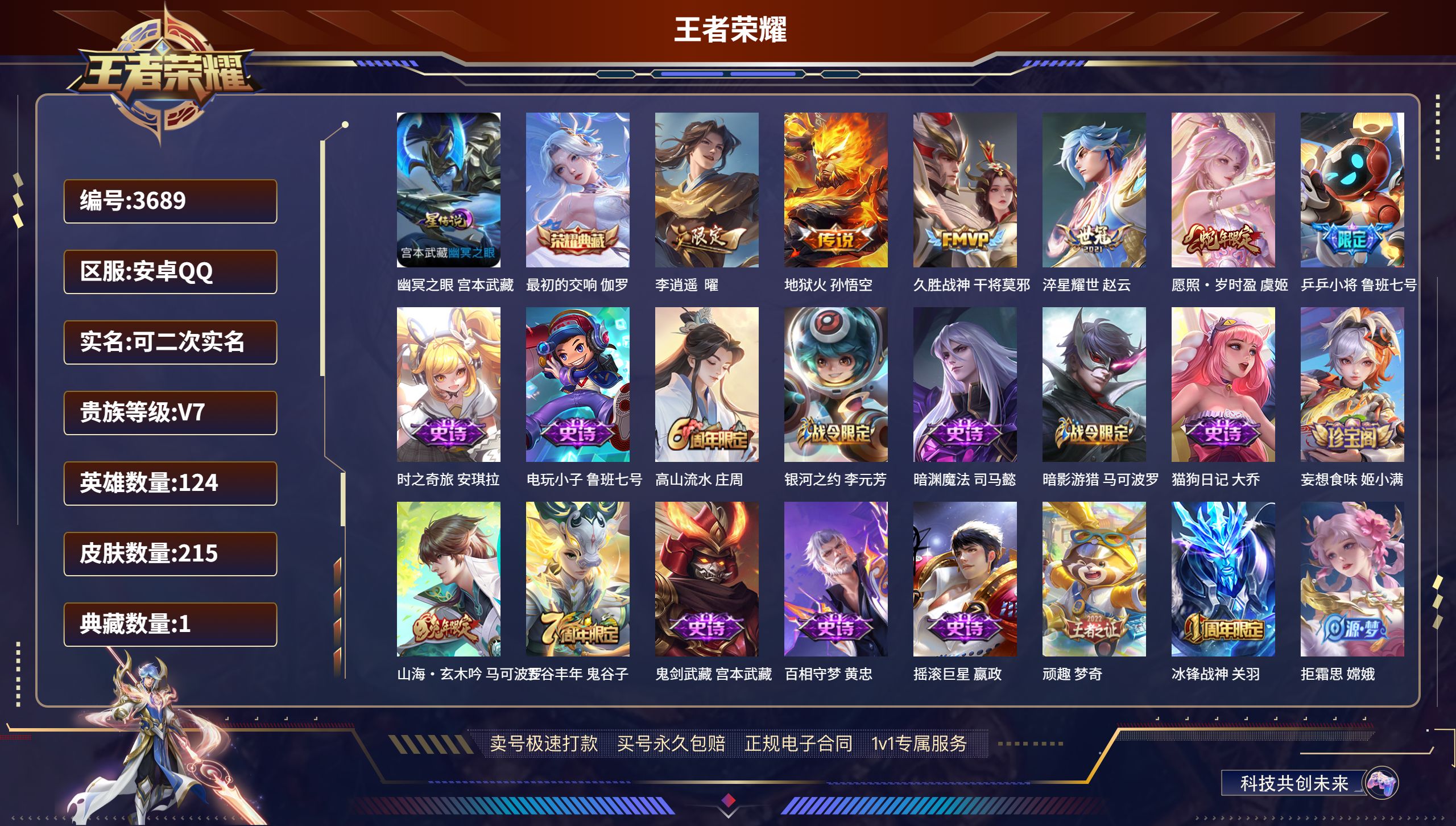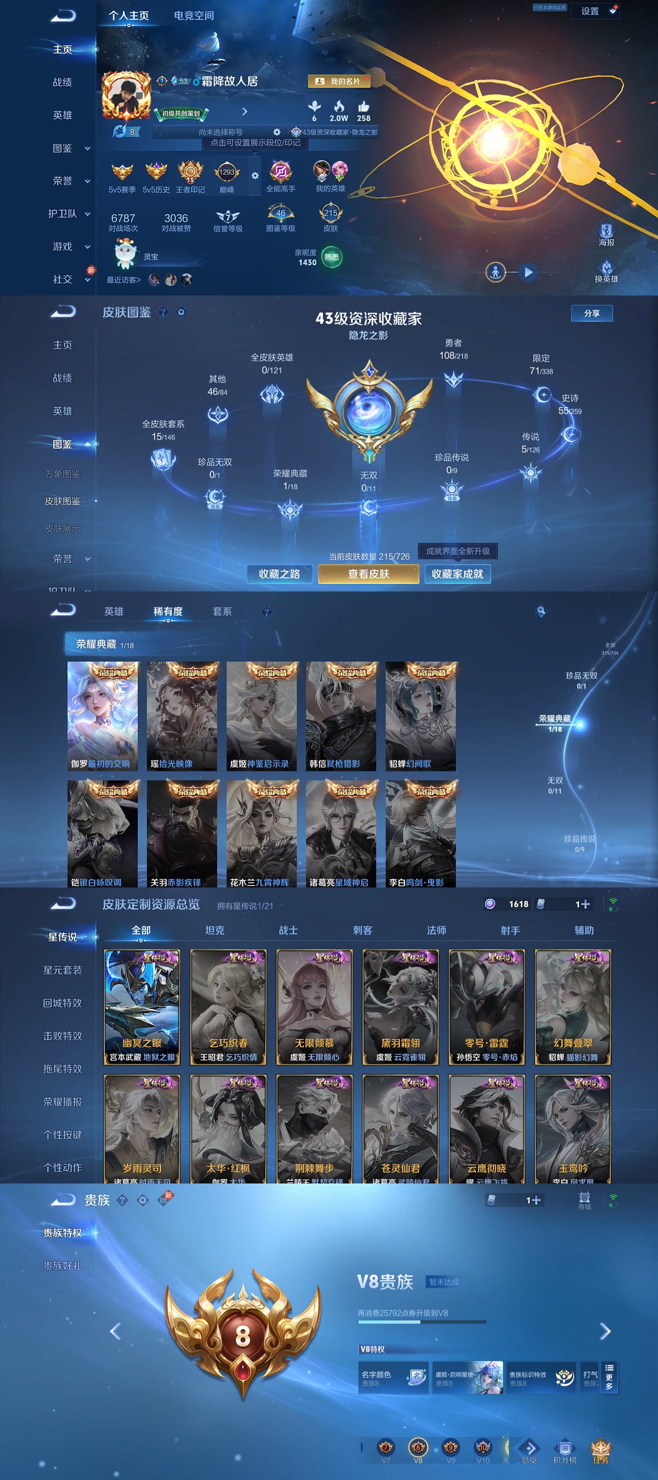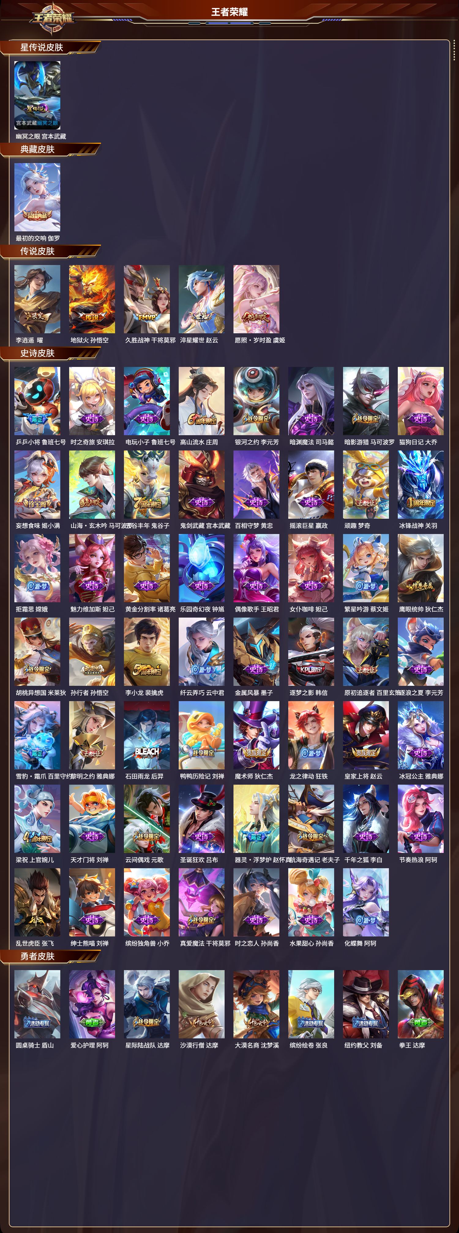 贵族等级:v3皮肤数:77荣耀典藏1 传说品质1 英雄数:117