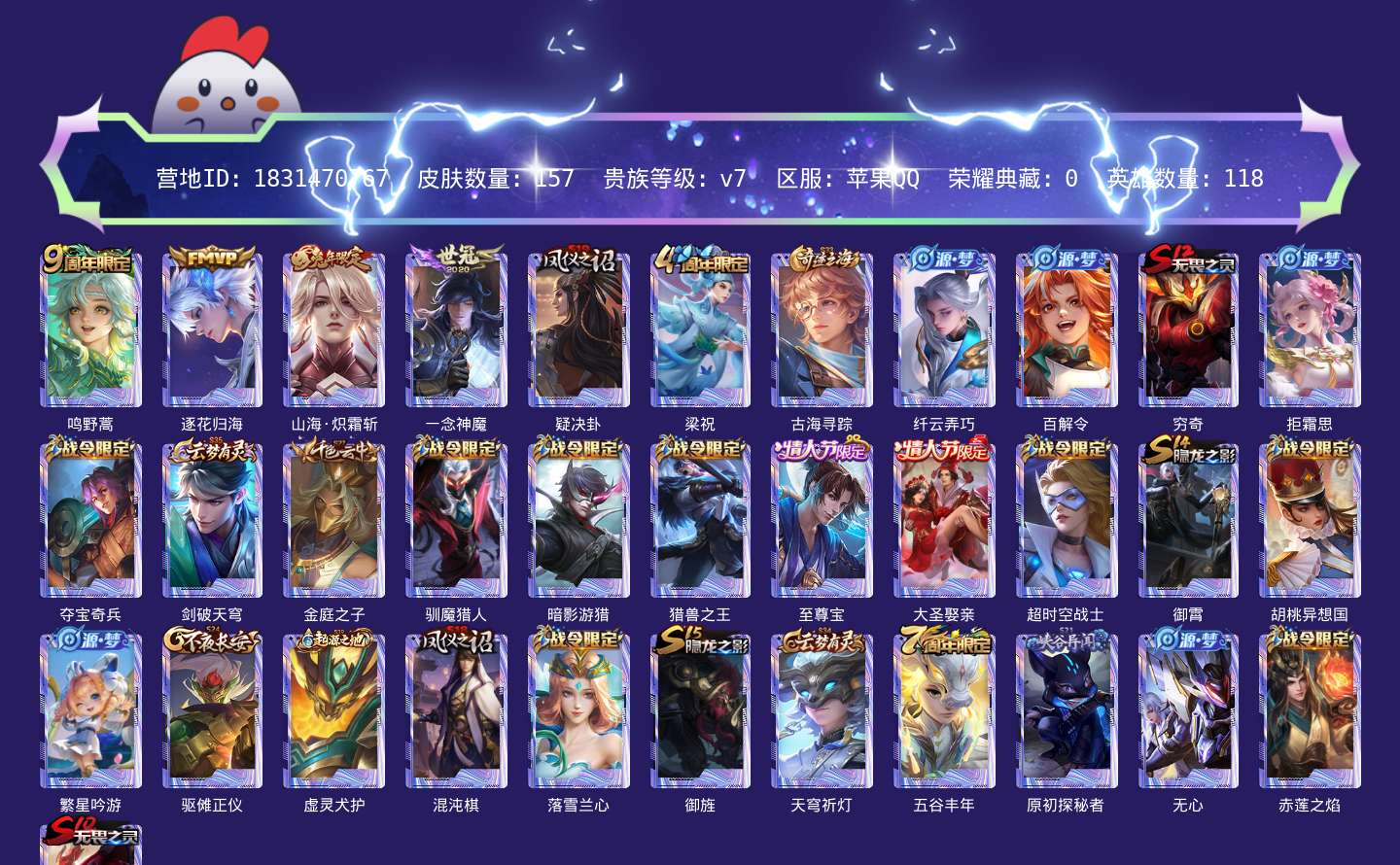 贵族等级:v7皮肤数:157传说品质3 情人节限定2 生肖限定1 英雄数:118