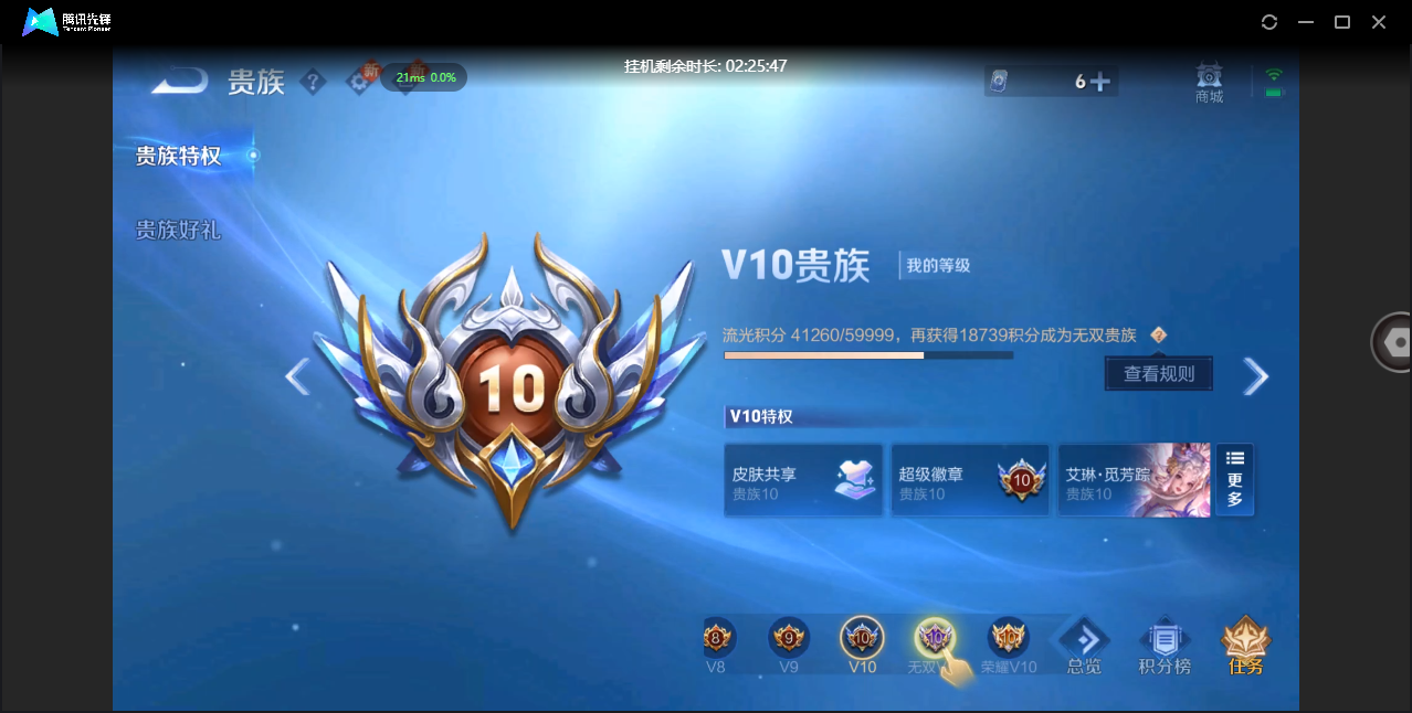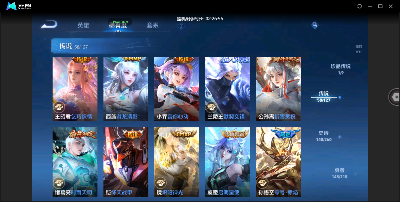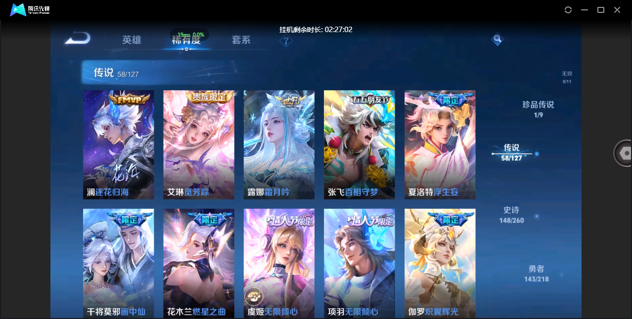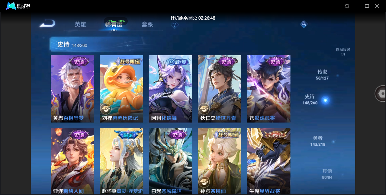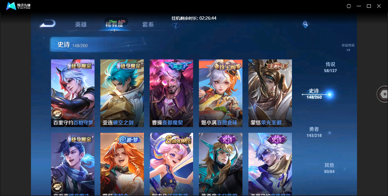 贵族等级:v6皮肤数:80传说品质5 情人节限定1 生肖限定1 英雄数:100