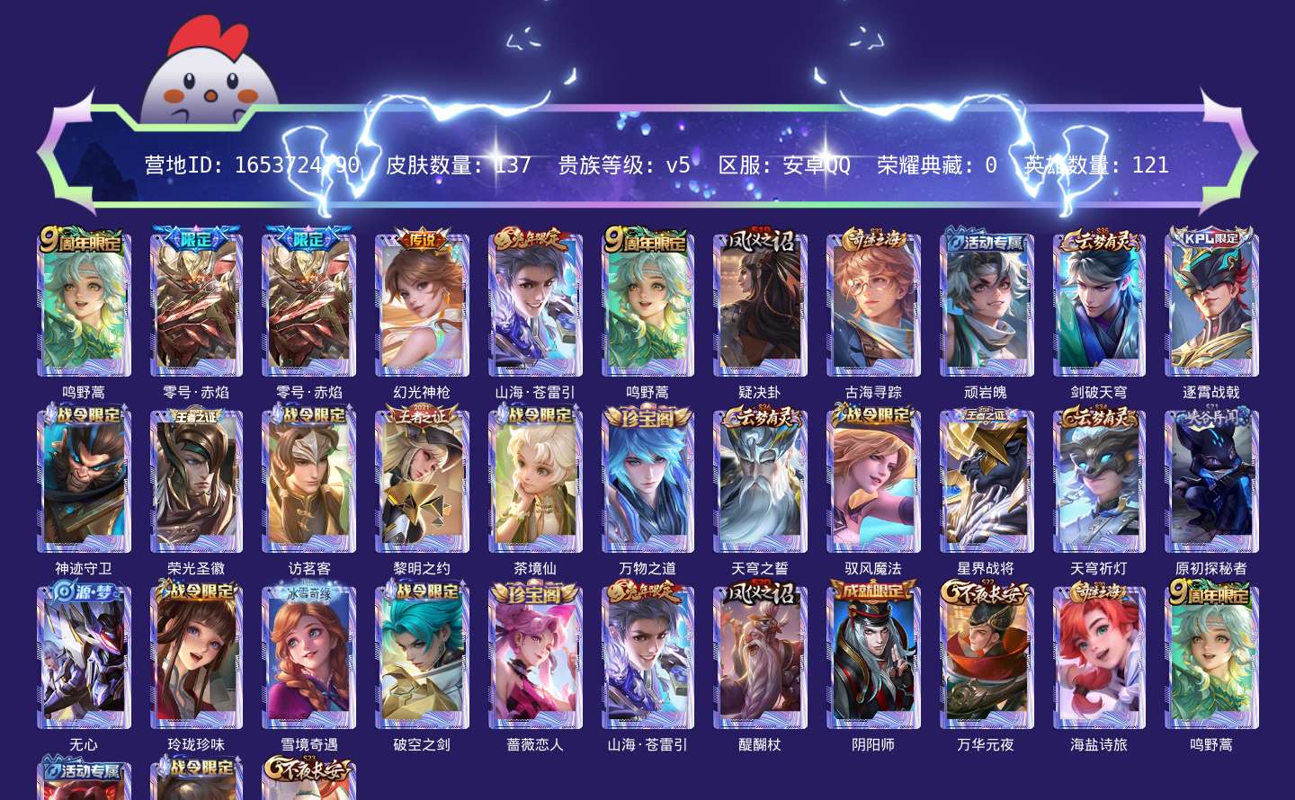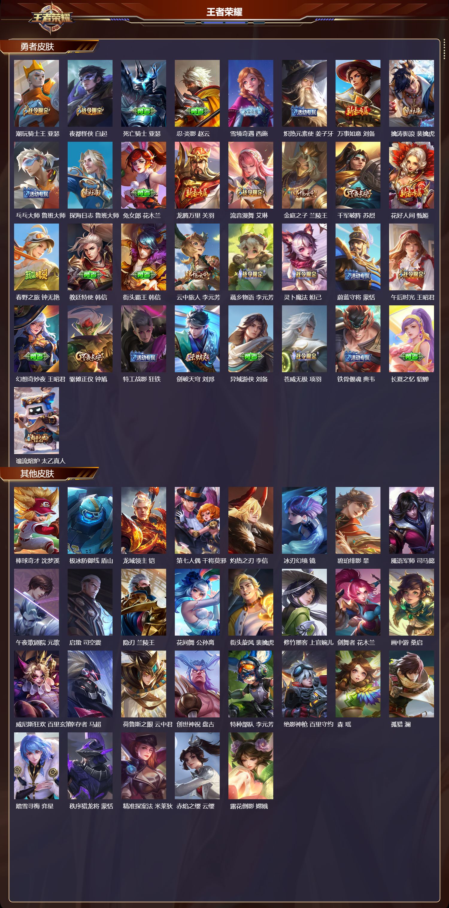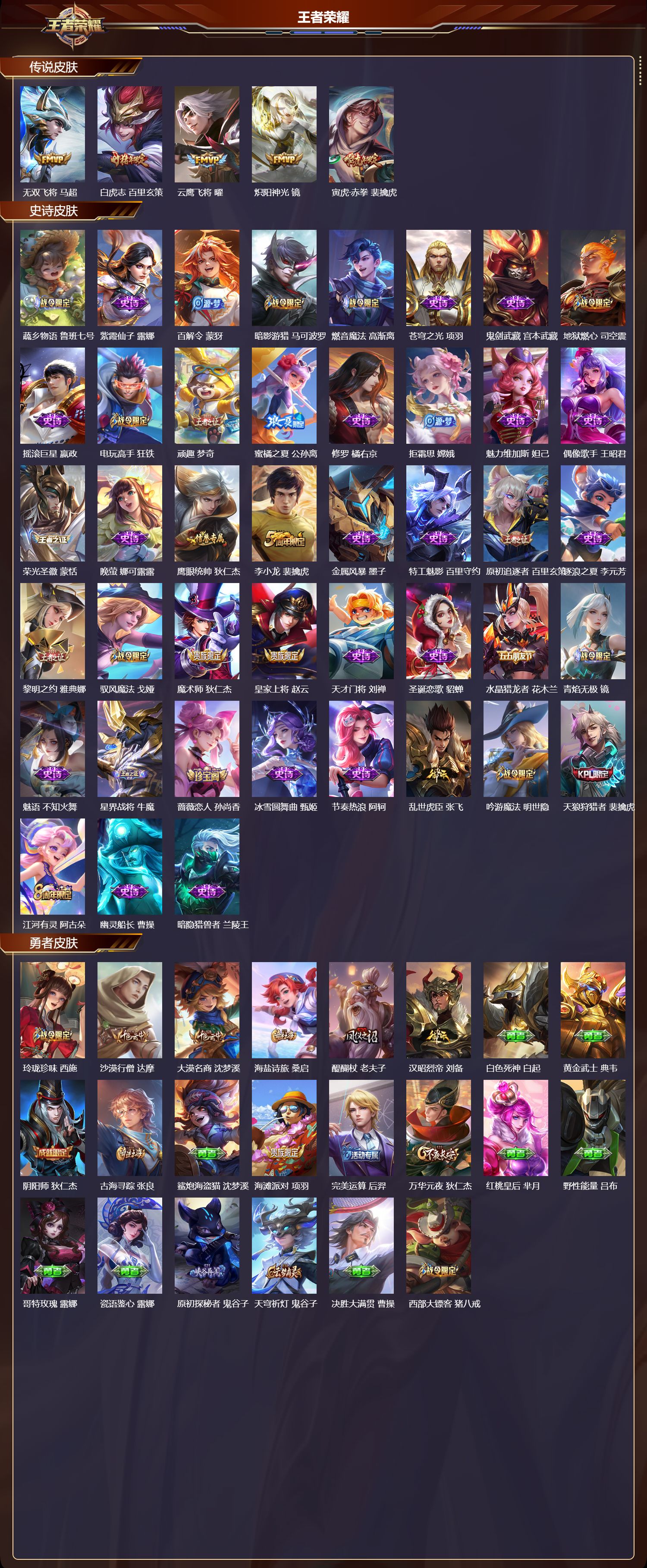 贵族等级:v5皮肤数:137传说品质3 生肖限定1 英雄数:121