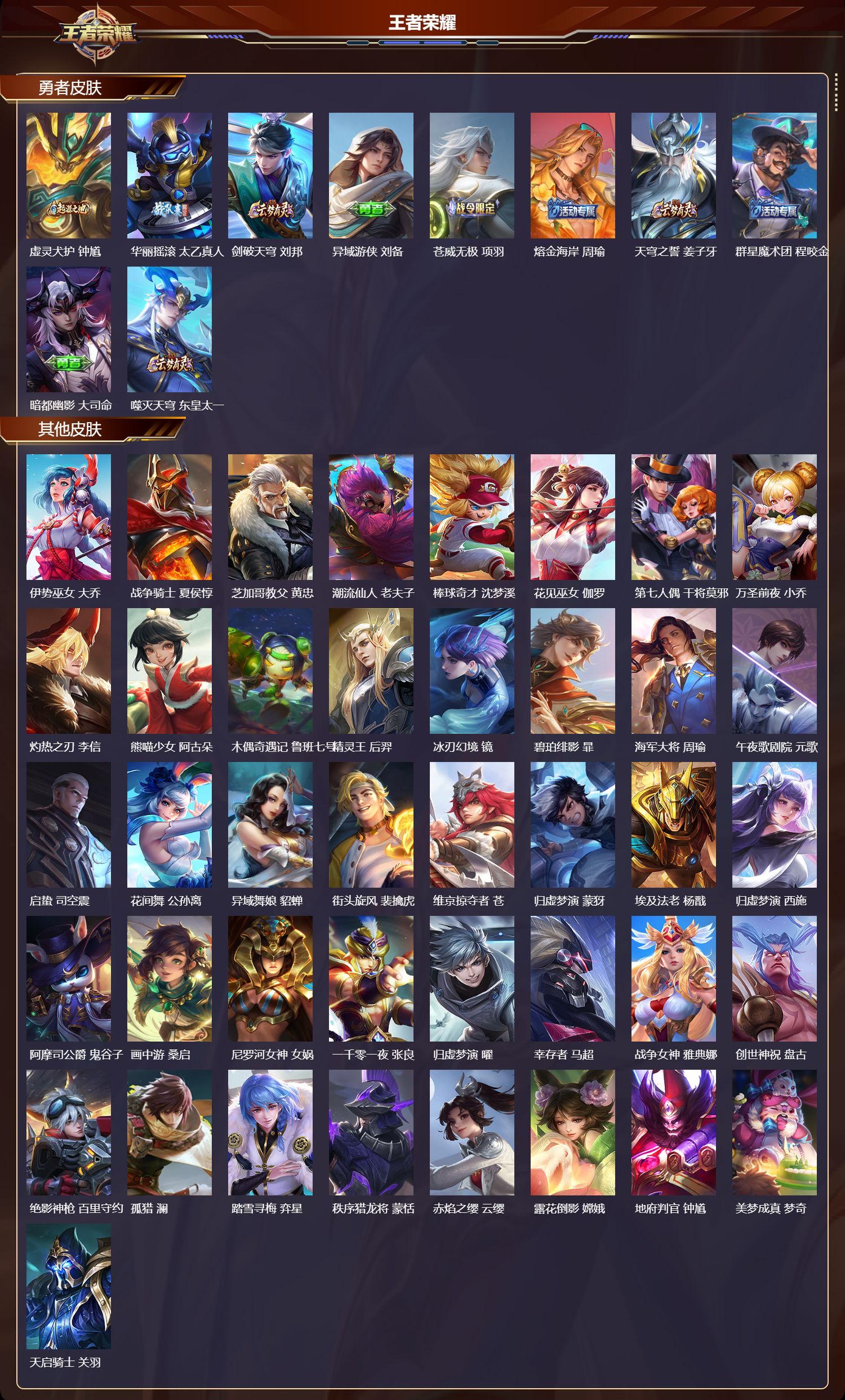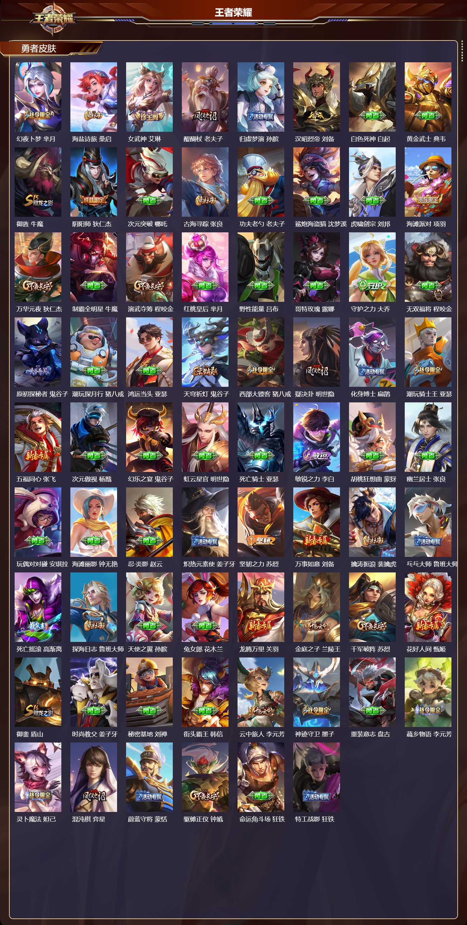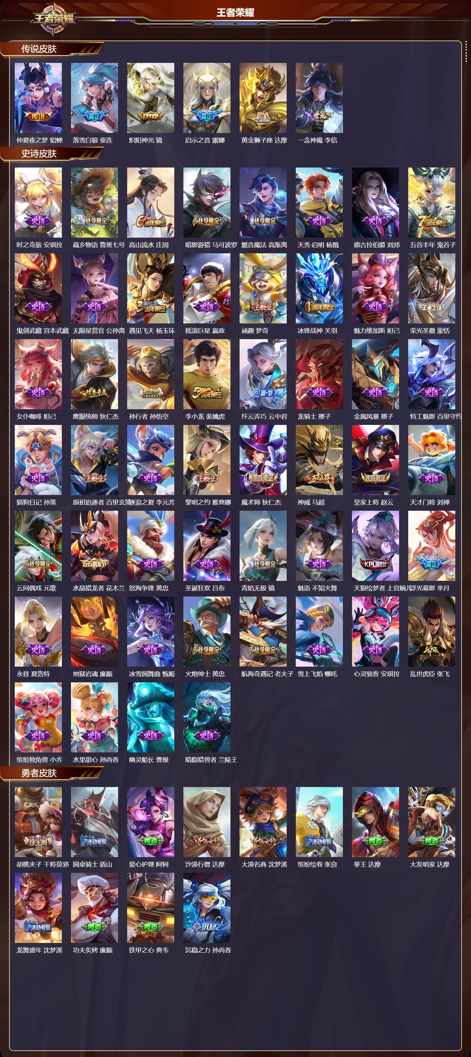 贵族等级:v5皮肤数:53传说品质4 生肖限定1 珍品传说1 英雄数:70