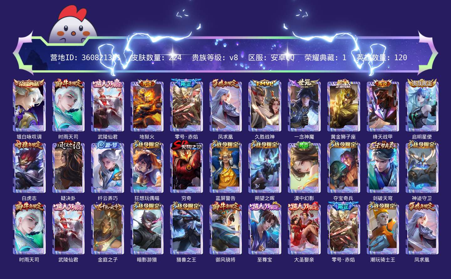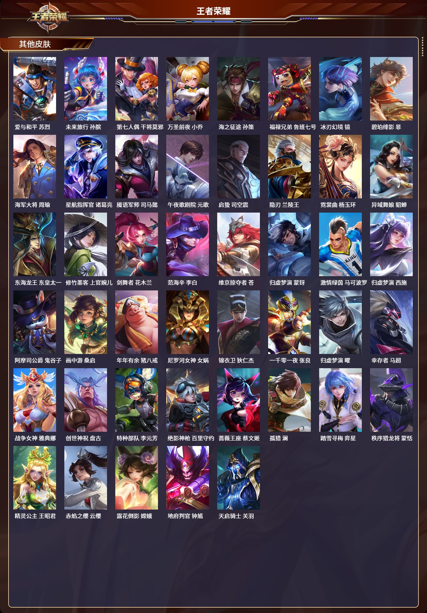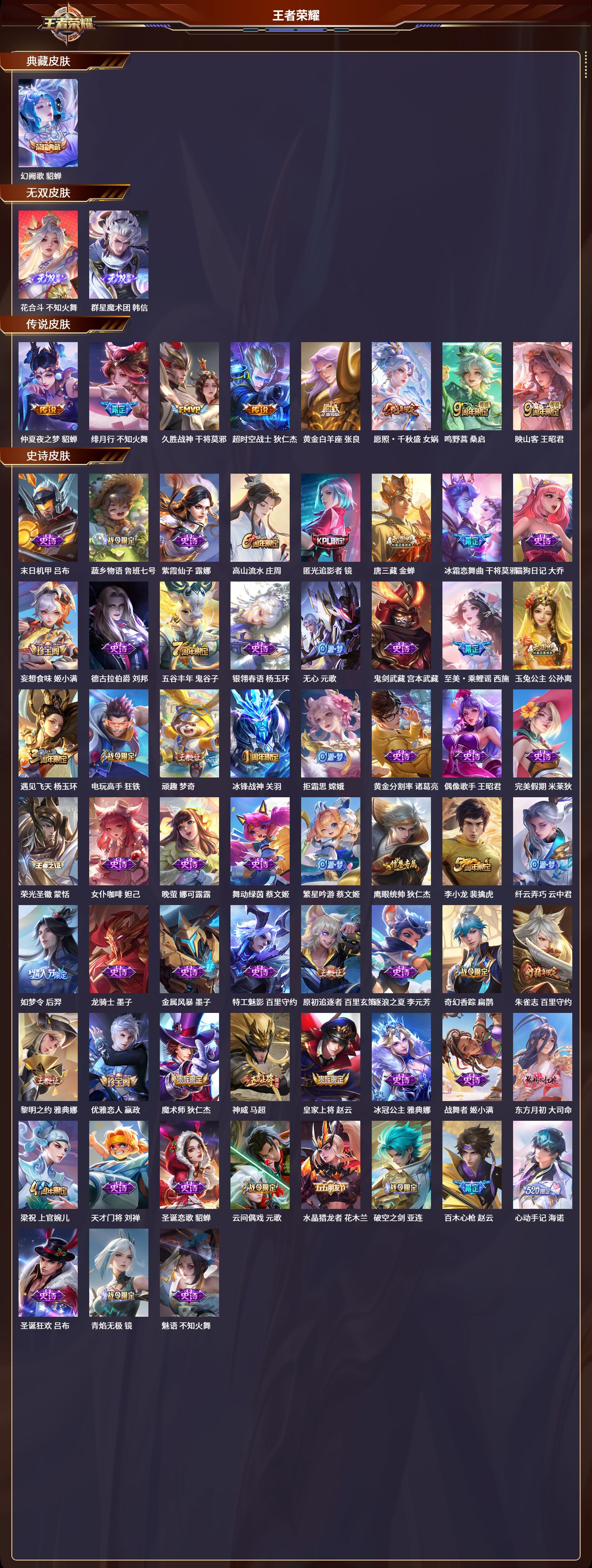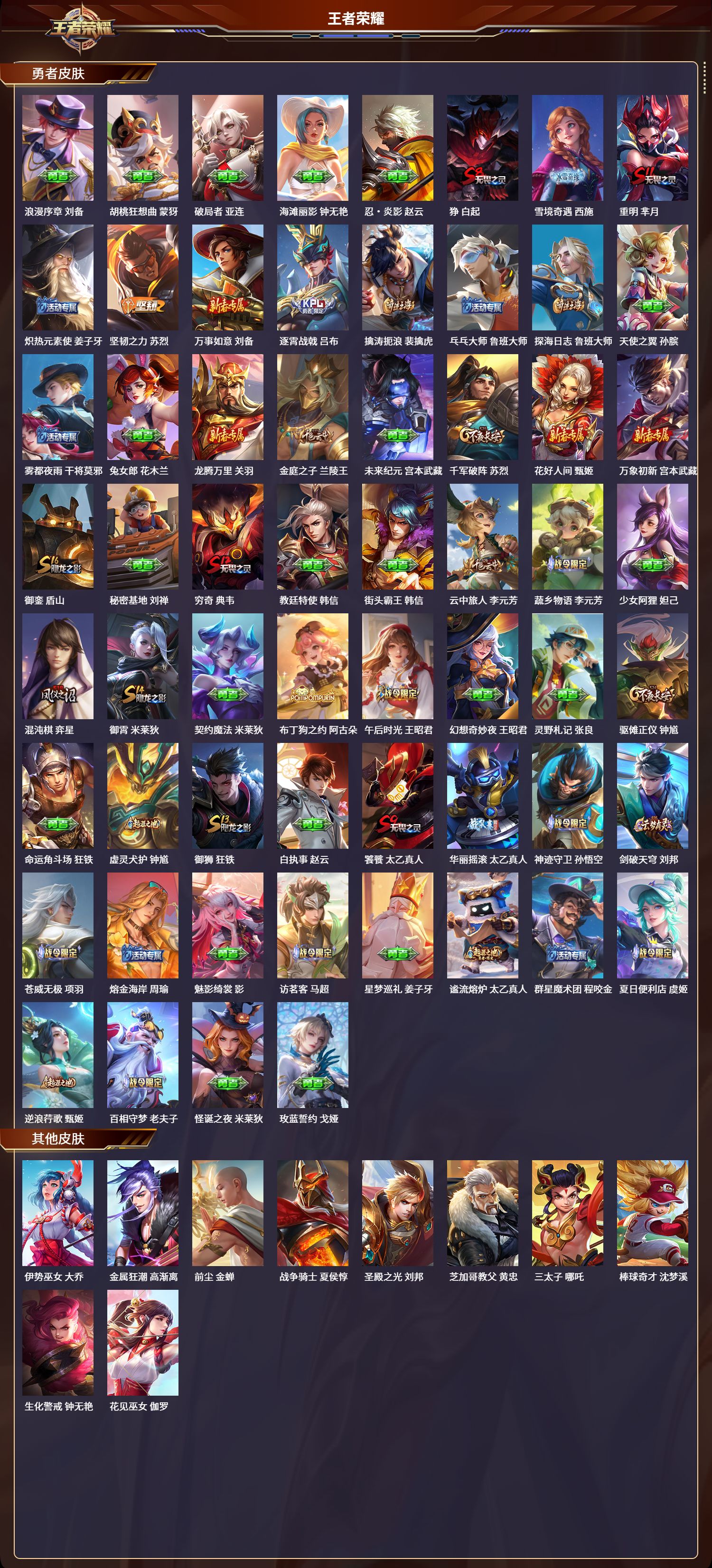 贵族等级:v8皮肤数:224传说品质11 生肖限定7 情人节限定3 荣耀典藏1 英雄数:120