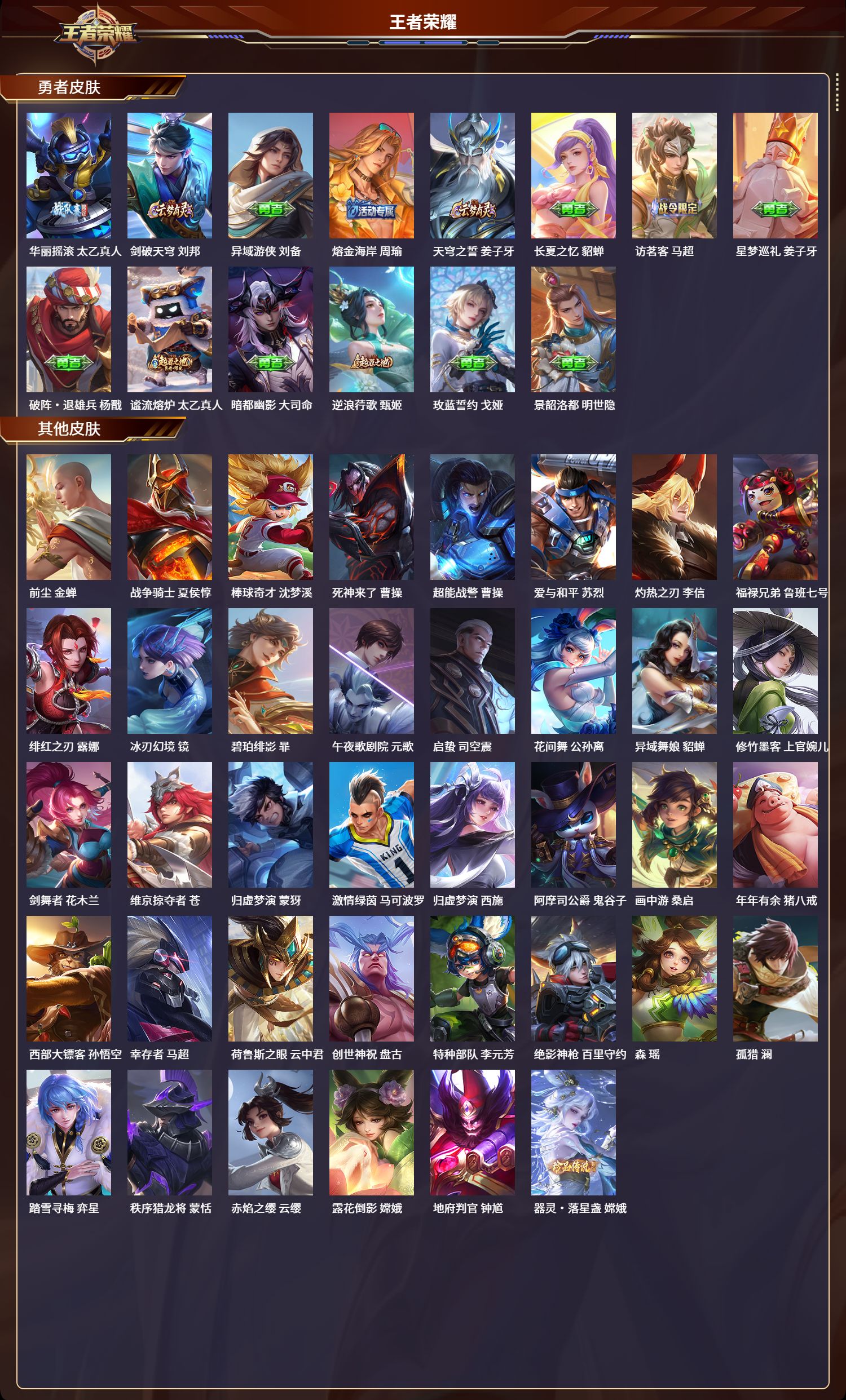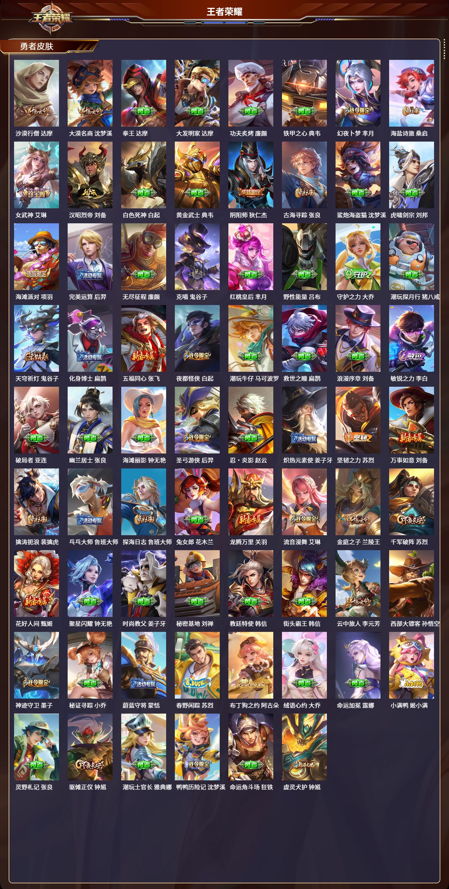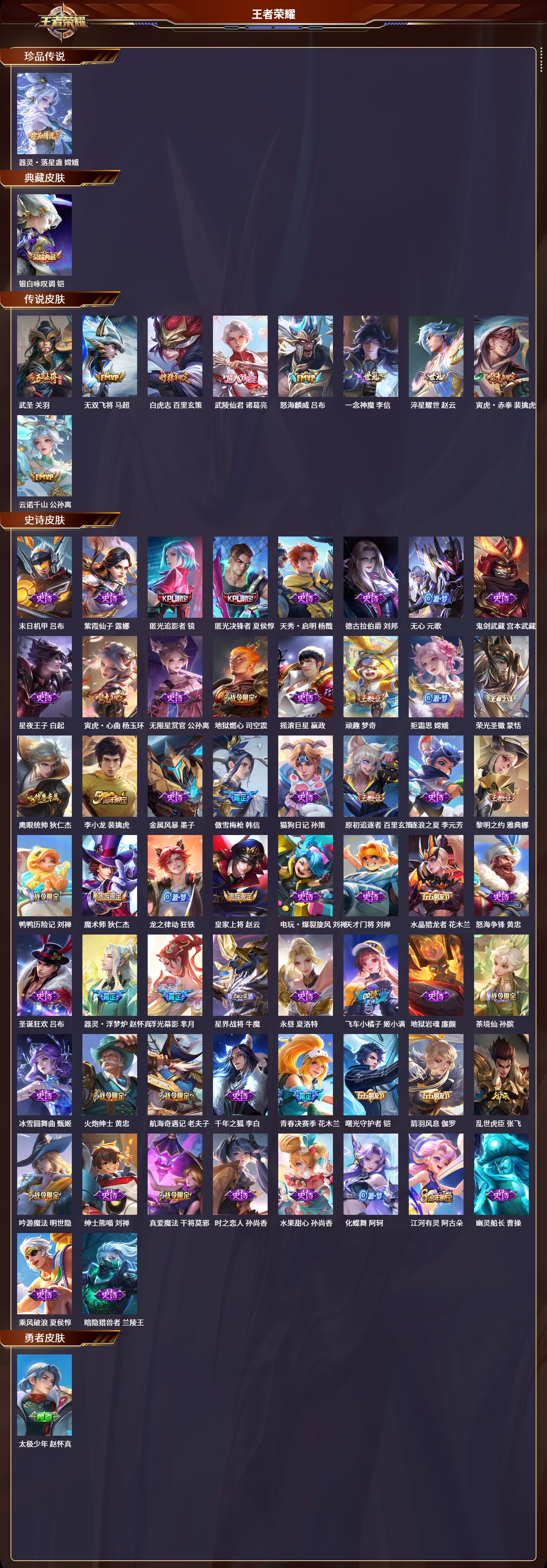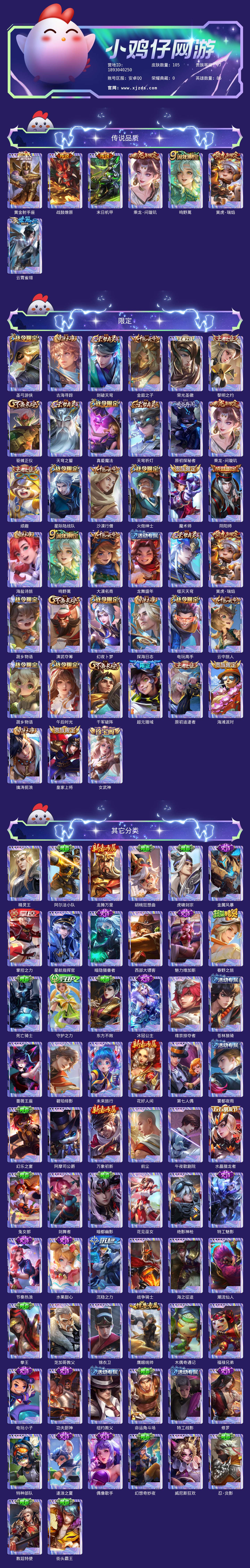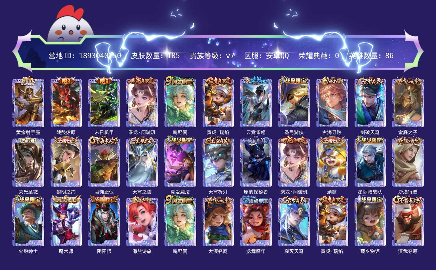 贵族等级:v7皮肤数:105传说品质7 生肖限定2 英雄数:86