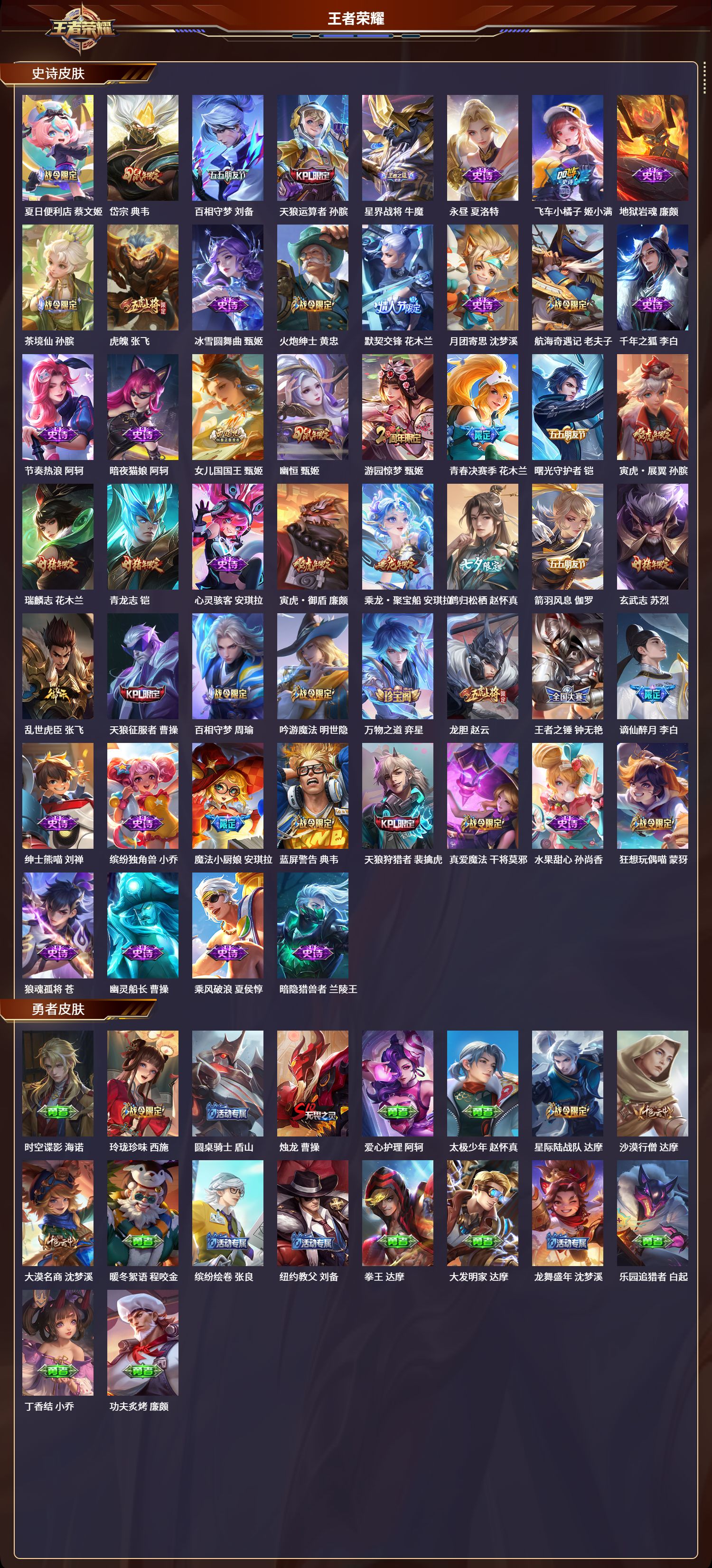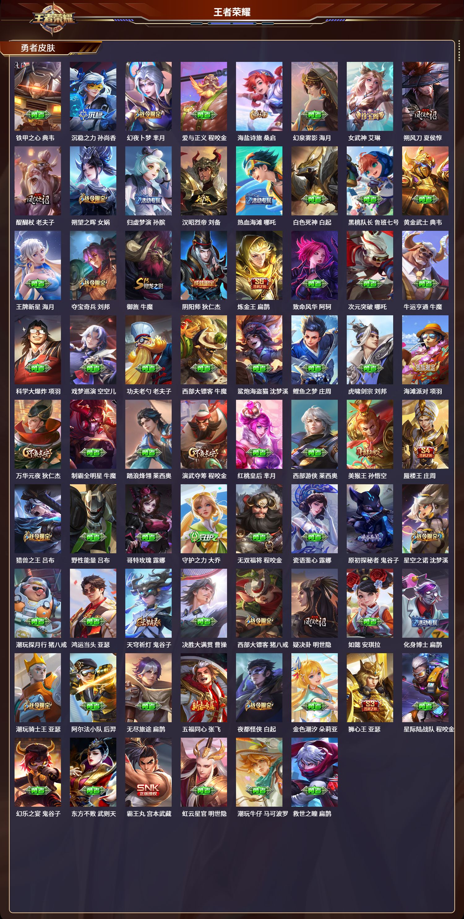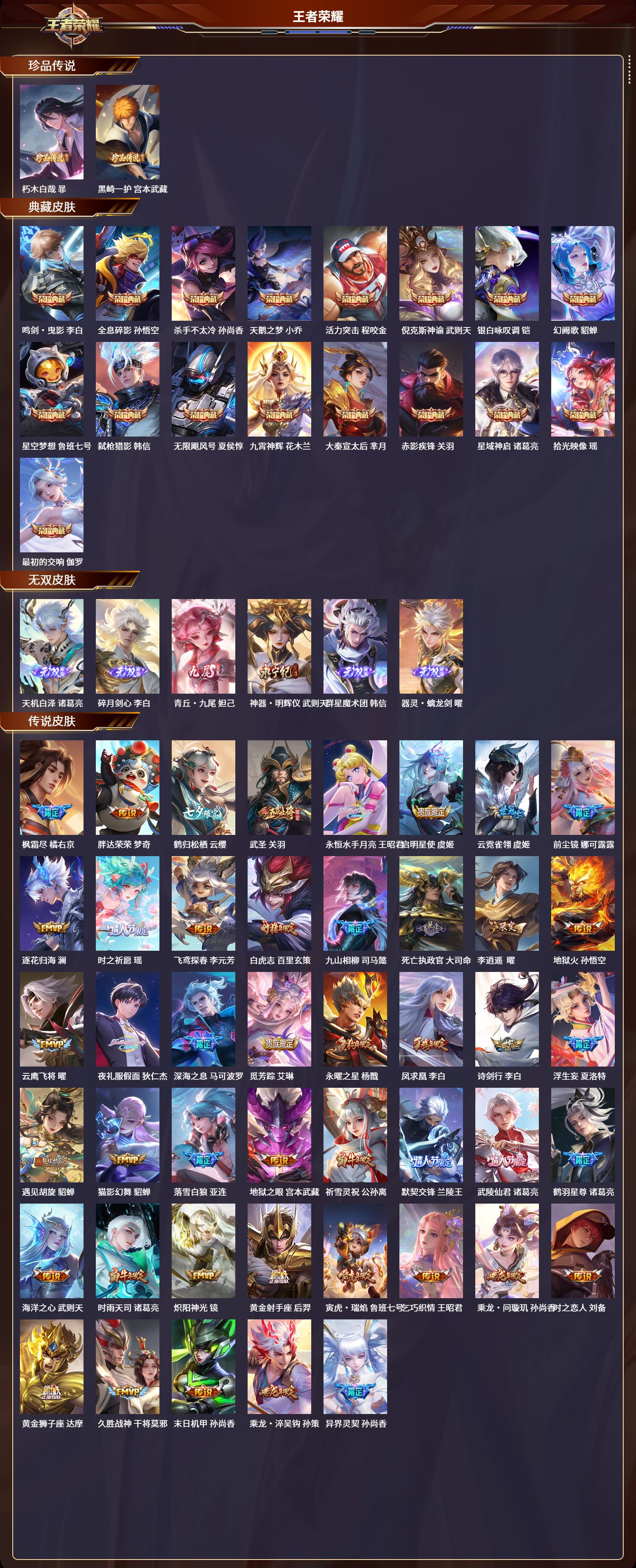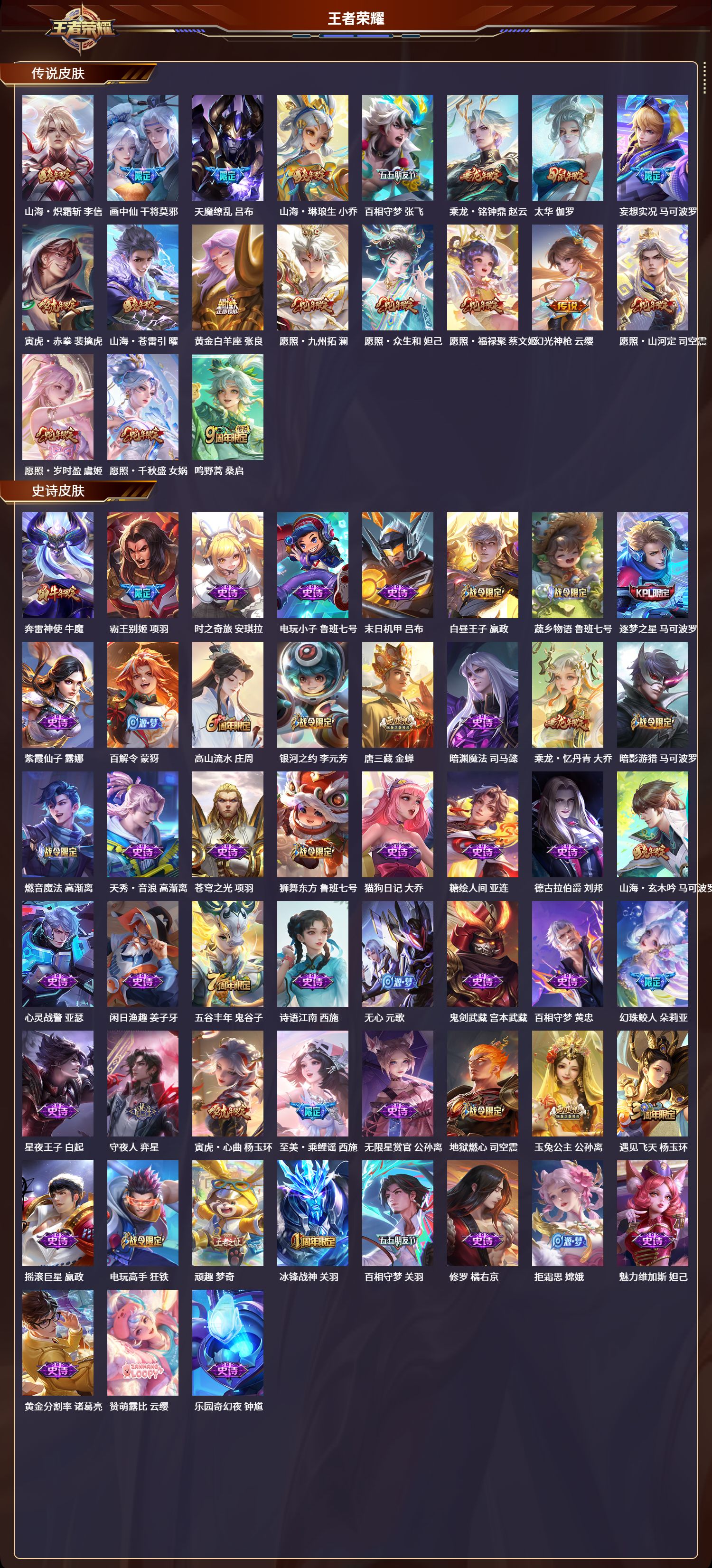 【1典藏18传说1星元V8】安卓Q-185皮肤-120英雄 【典藏皮肤】 神鉴启示录 【传说皮肤】 浮生妄 鹤羽星尊 燃星之曲 炽翼辉光 冥王哈迪斯 画中仙 无限倾心 无限倾心 山海·苍雷引 齐天大圣 山海·炽霜斩 诗剑行 星穹之声 音你闪耀 时之恋人 启明星使 淬星耀世 怒海麟威 【史诗皮肤】 天狼溯光者 玫瑰异探 银翎春语 孙行者 山海·玄木吟 青焰无极 山海·碧波行 夏日便利店 苍威无