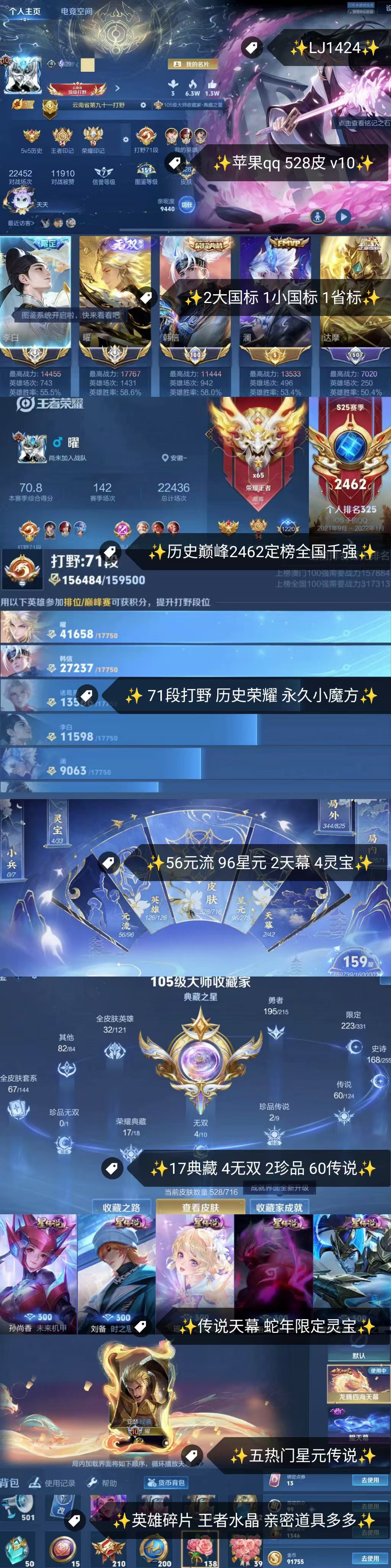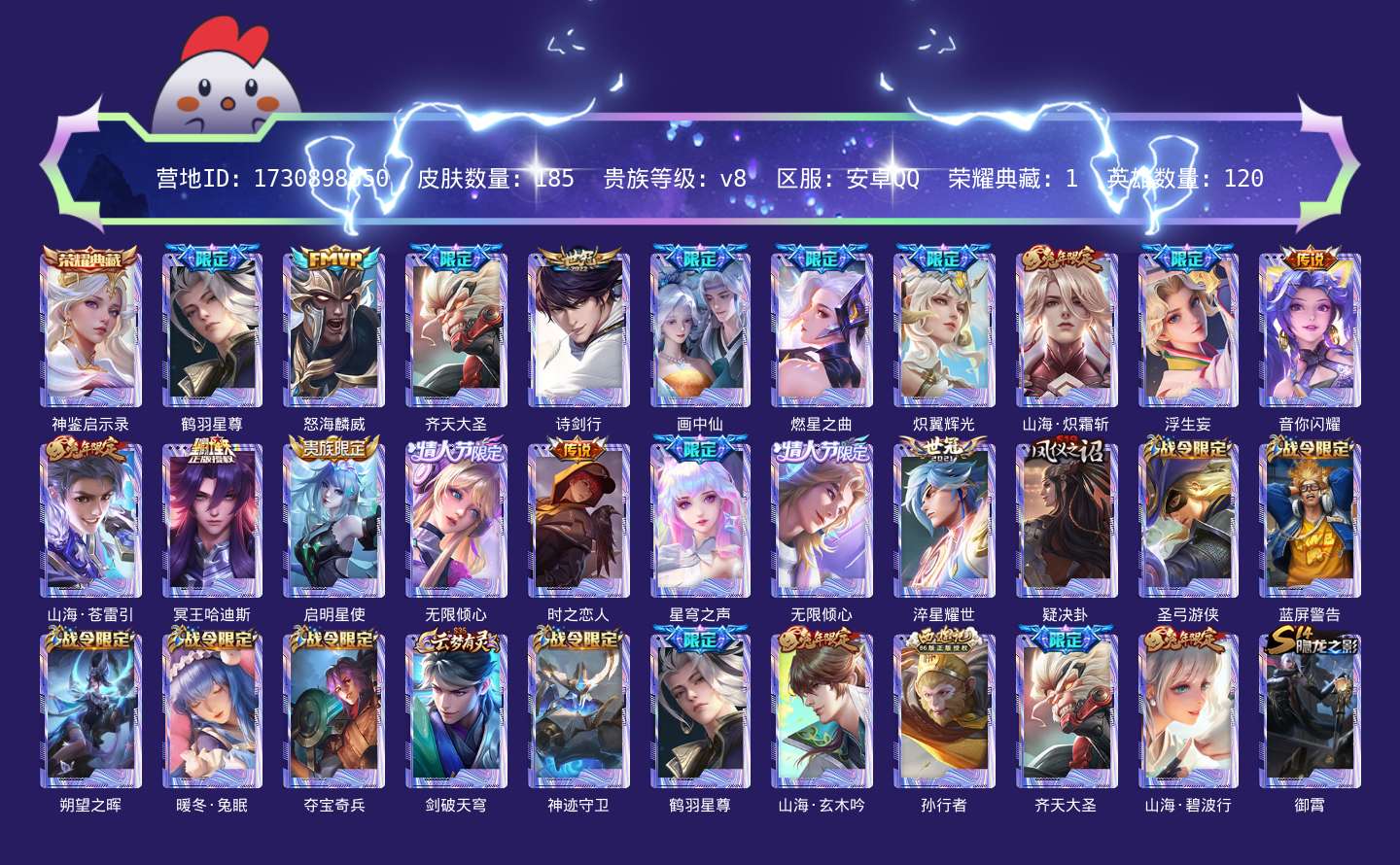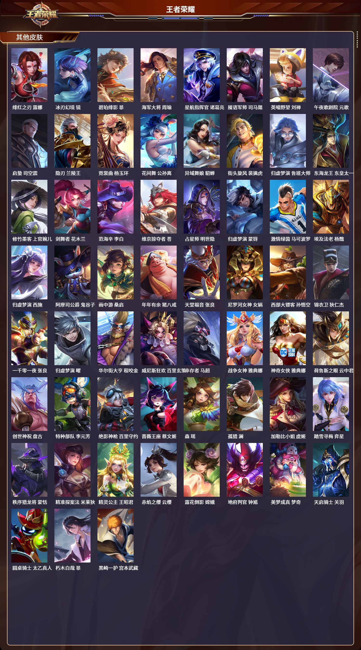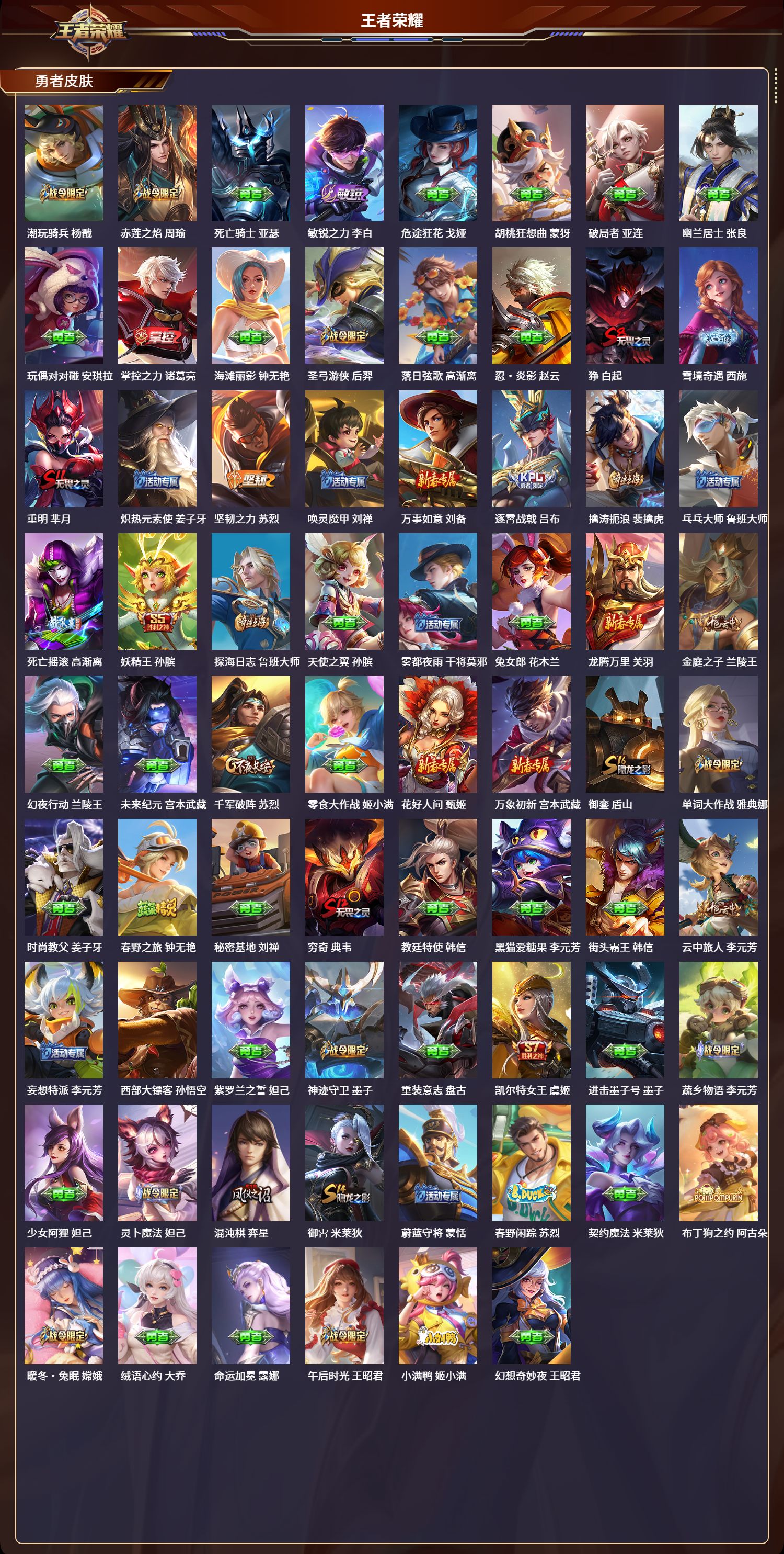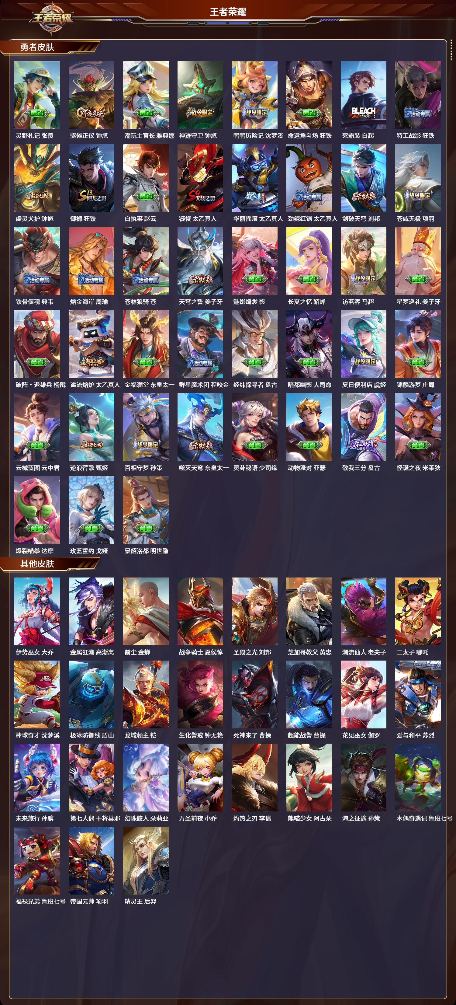 【1典藏18传说1星元V8】安卓Q-185皮肤-120英雄 【典藏皮肤】 神鉴启示录 【传说皮肤】 浮生妄 鹤羽星尊 燃星之曲 炽翼辉光 冥王哈迪斯 画中仙 无限倾心 无限倾心 山海·苍雷引 齐天大圣 山海·炽霜斩 诗剑行 星穹之声 音你闪耀 时之恋人 启明星使 淬星耀世 怒海麟威 【史诗皮肤】 天狼溯光者 玫瑰异探 银翎春语 孙行者 山海·玄木吟 青焰无极 山海·碧波行 夏日便利店 苍威无
