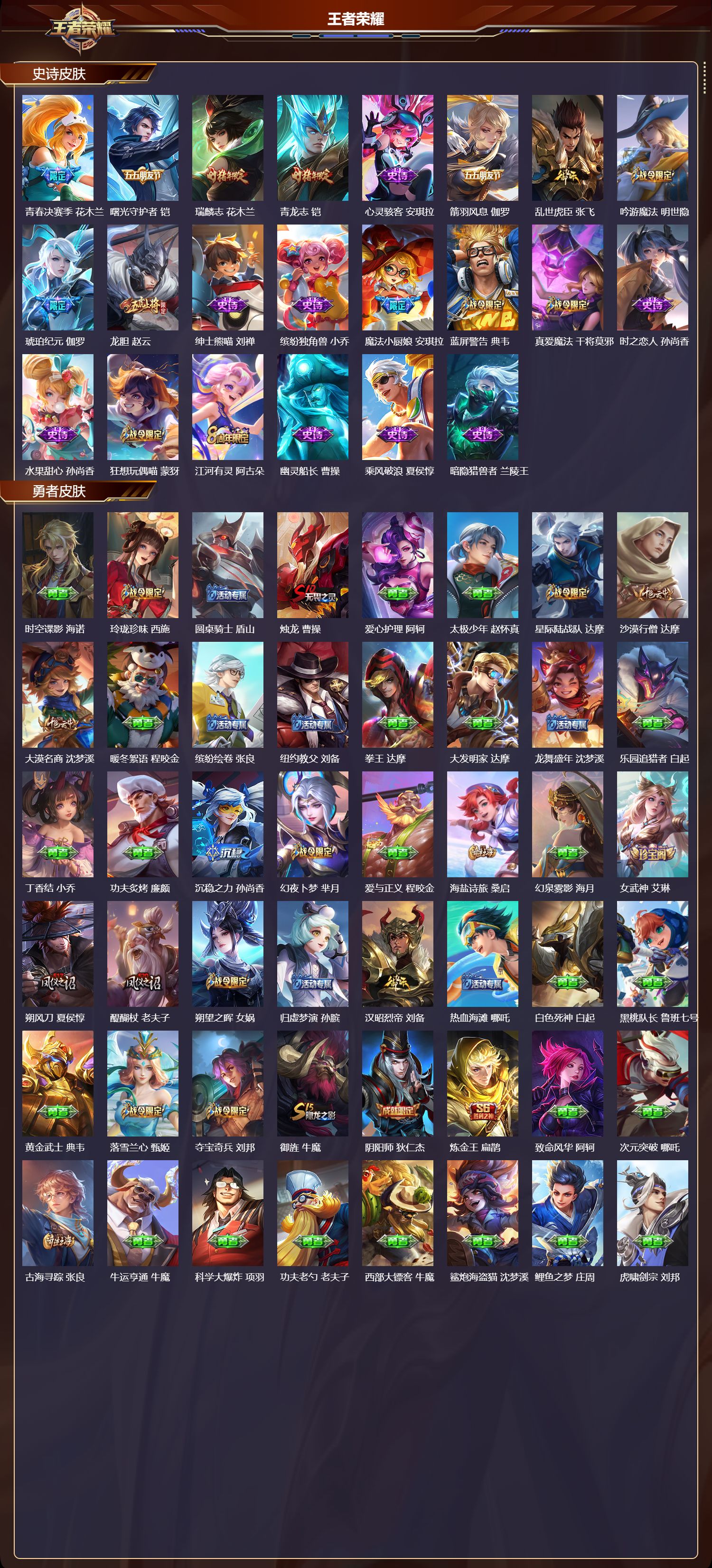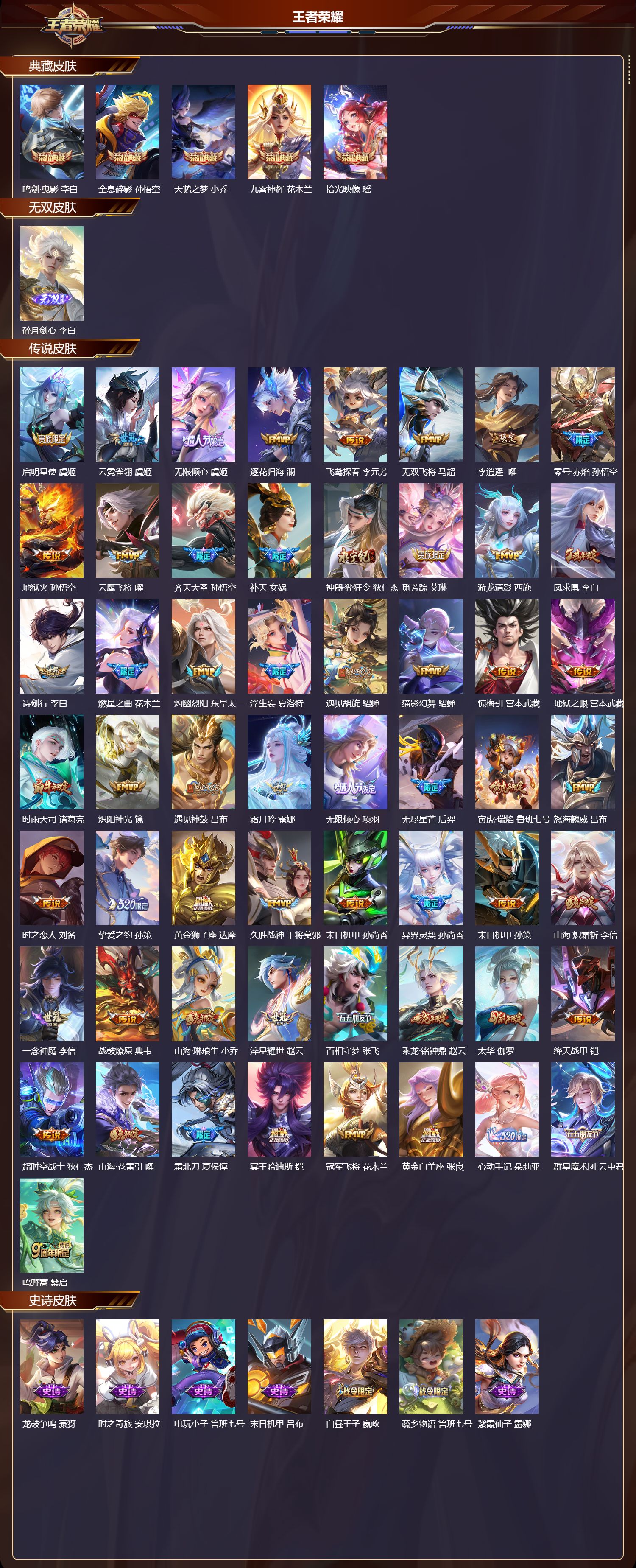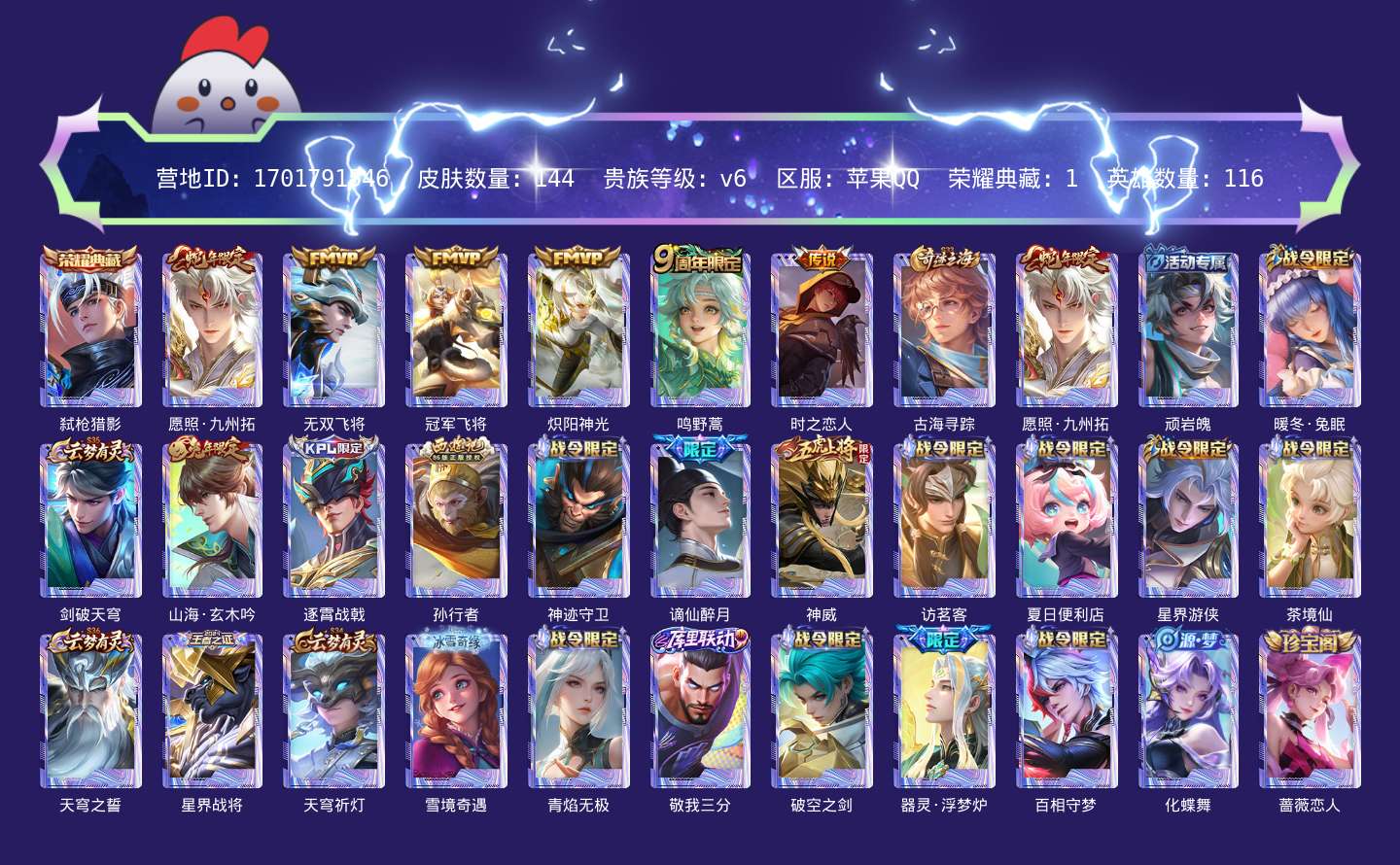 贵族等级:v6皮肤数:144传说品质6 生肖限定2 荣耀典藏1 英雄数:116