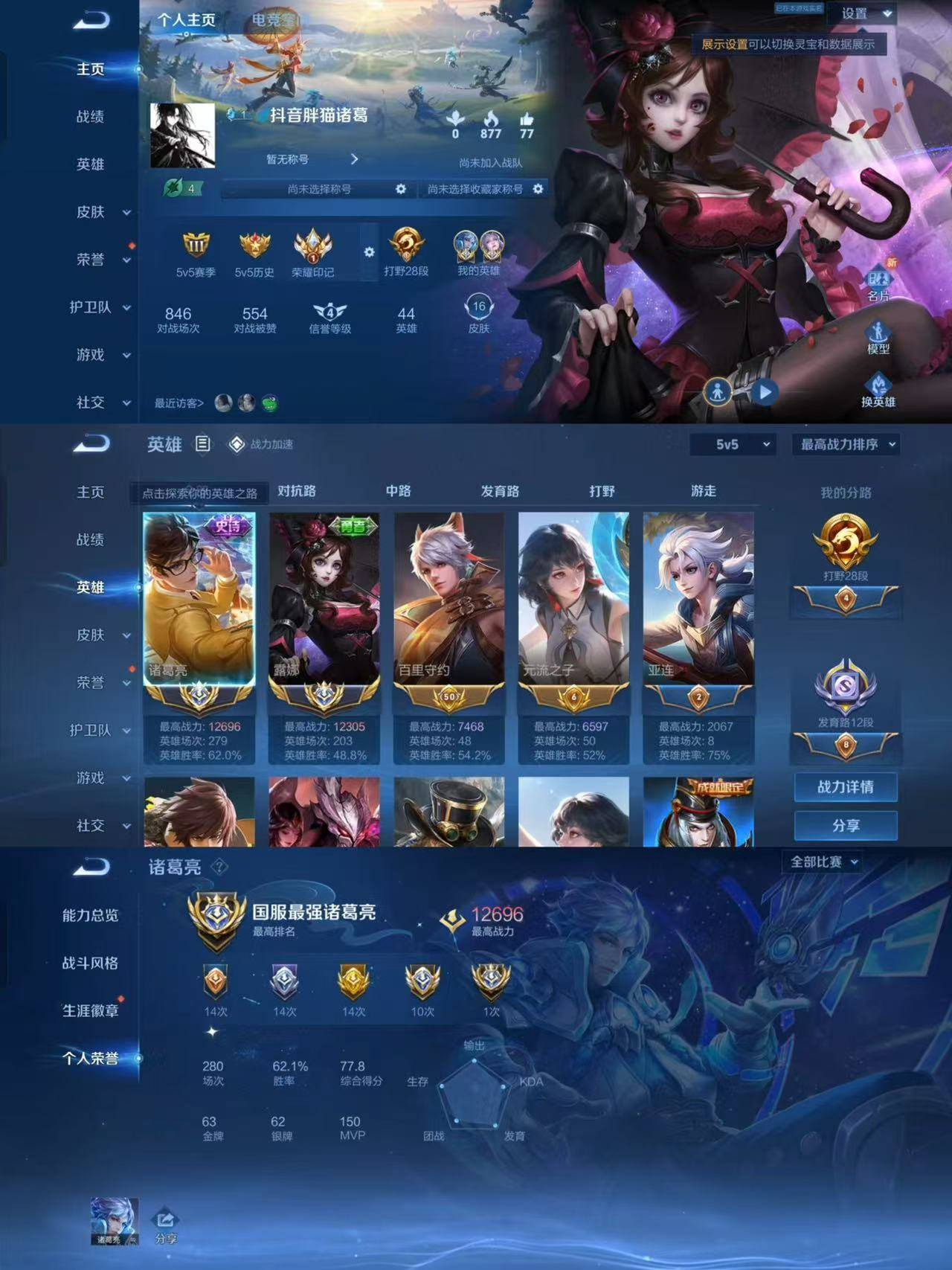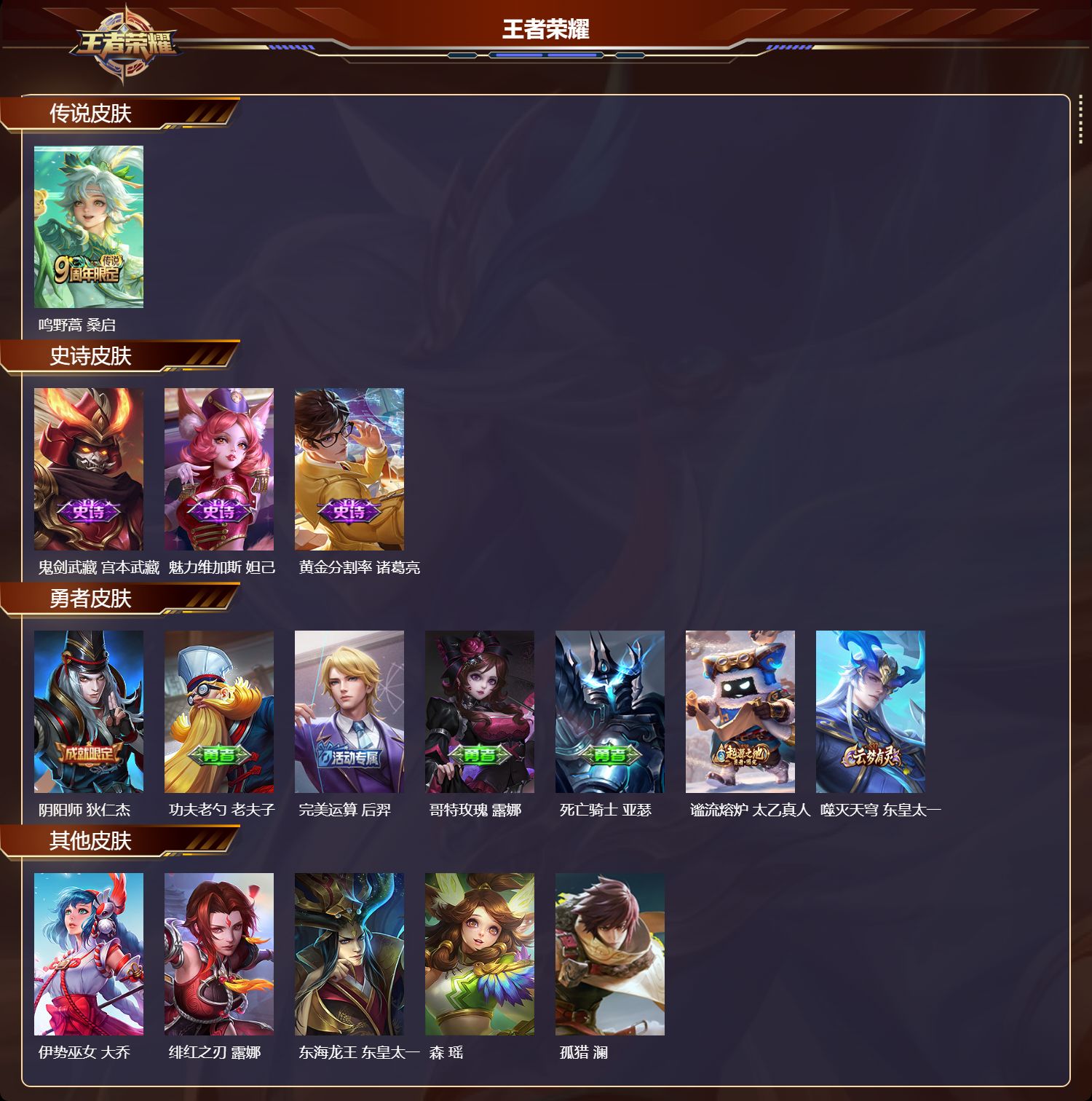 贵族等级:v7皮肤数:224传说品质10 生肖限定5 情人节限定1 英雄数:122