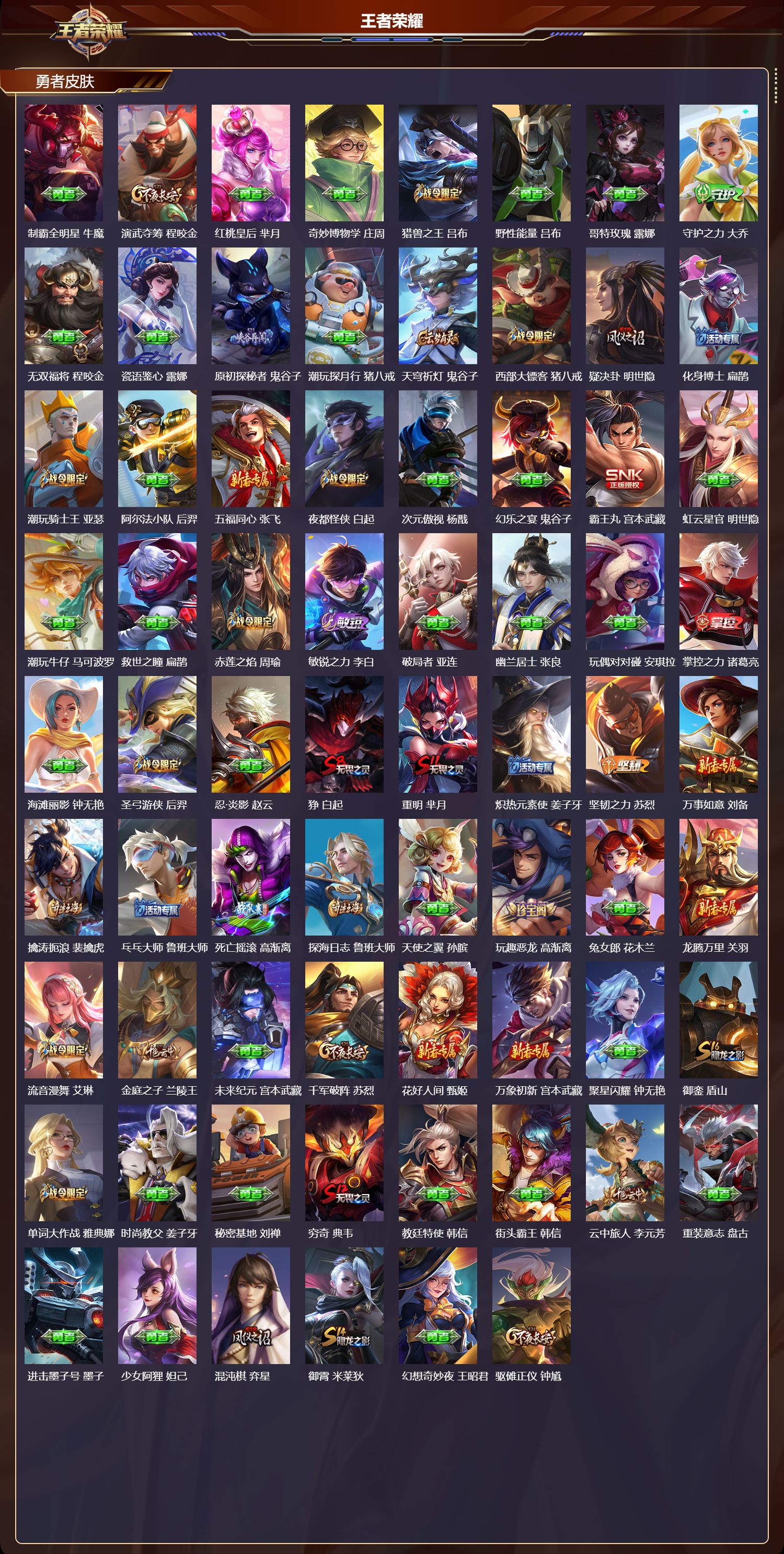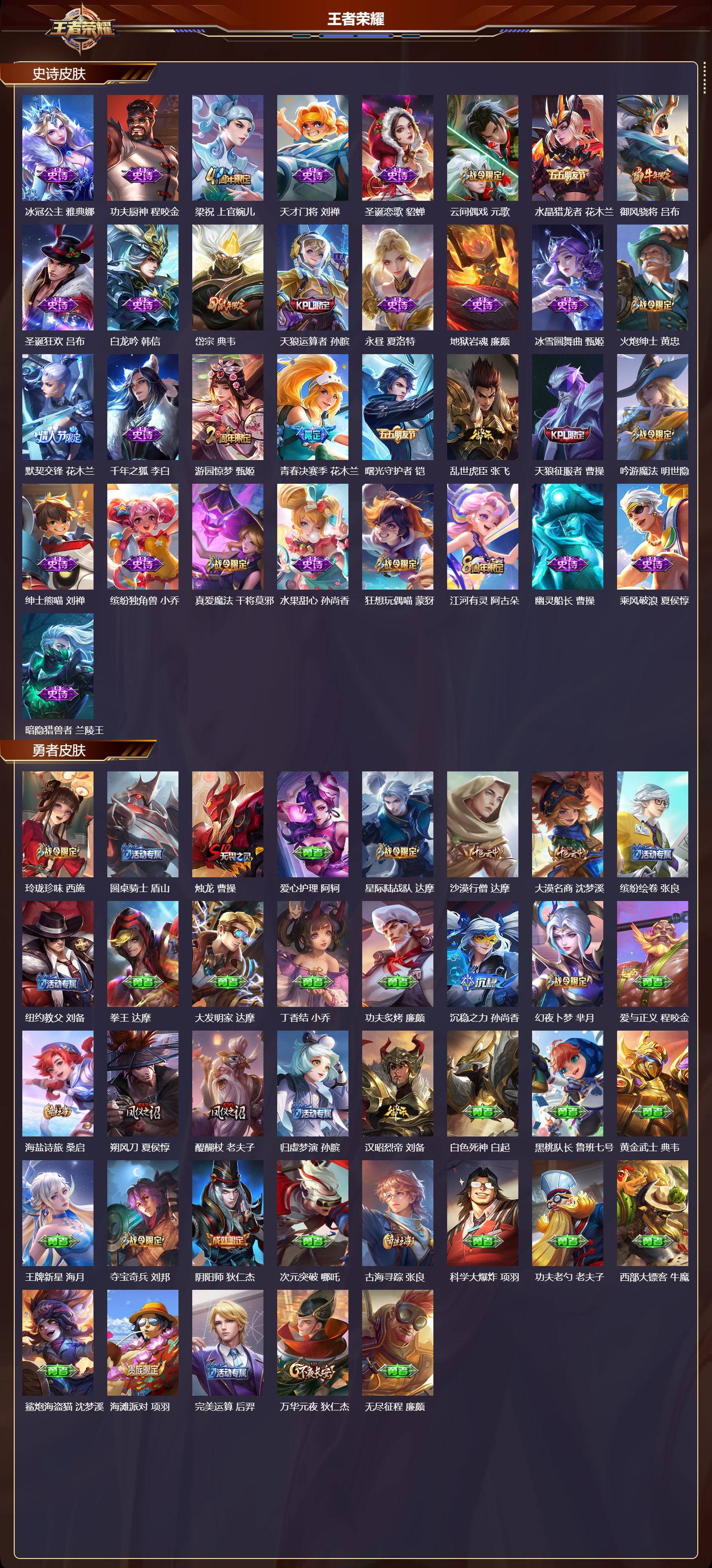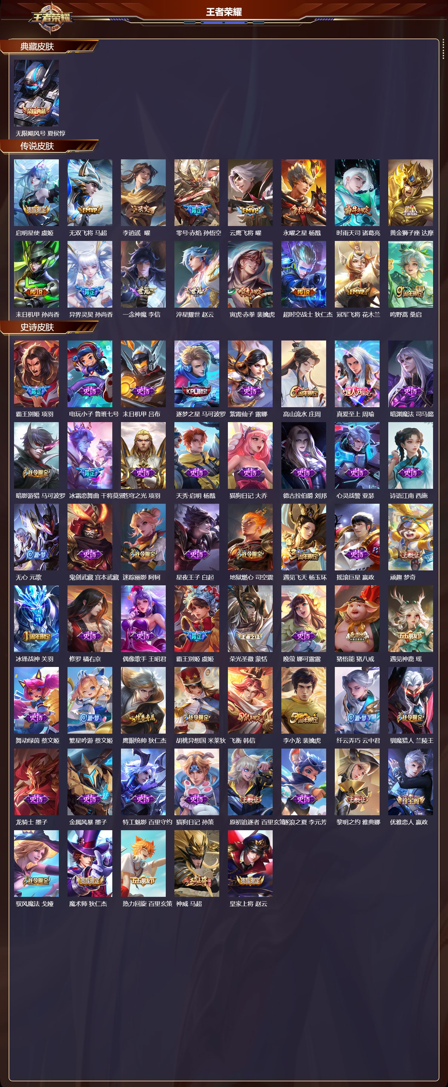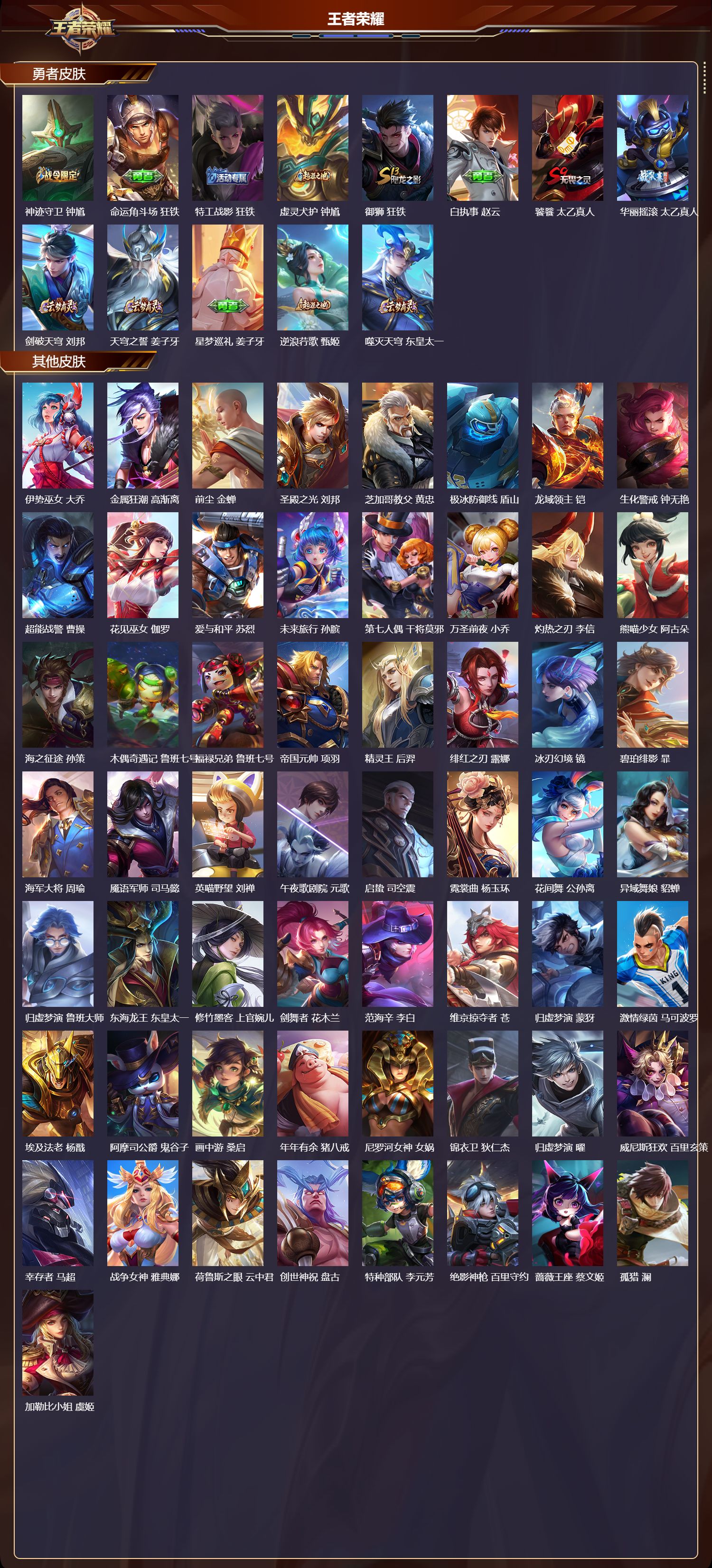 贵族等级:v8皮肤数:268传说品质20 情人节限定5 生肖限定3 荣耀典藏1 英雄数:119