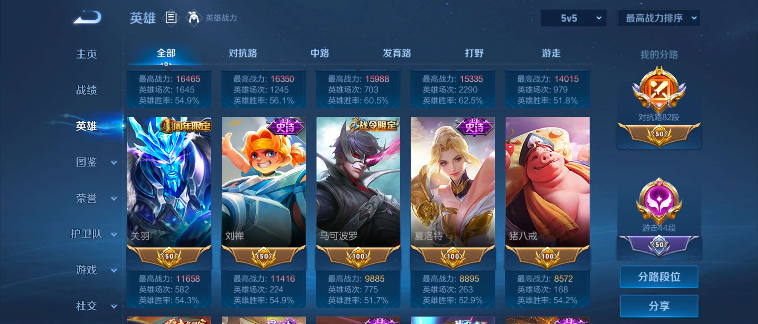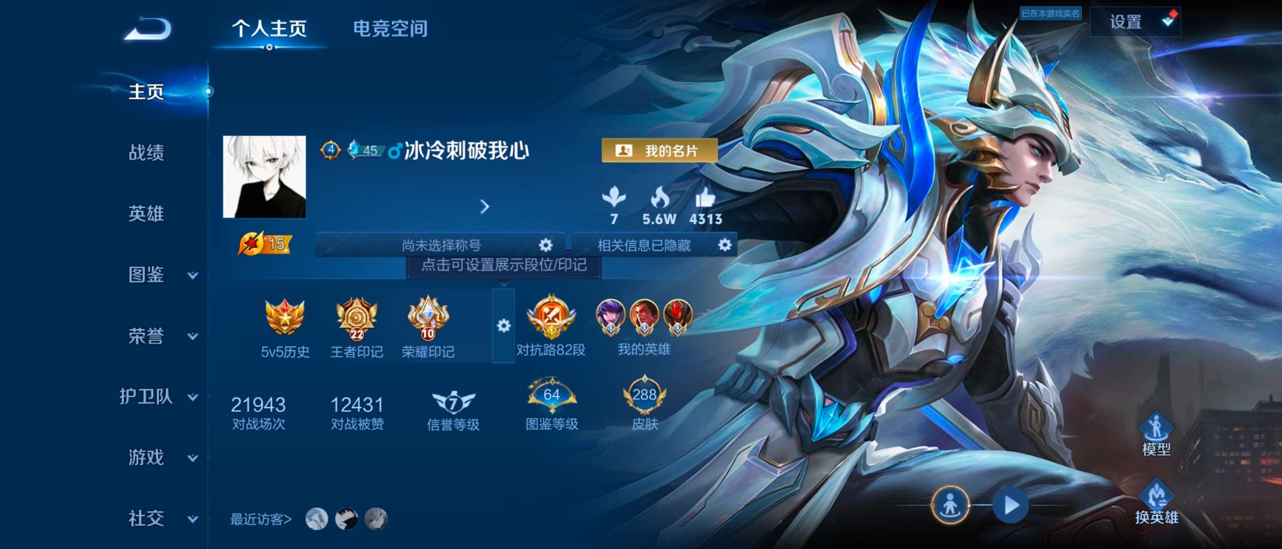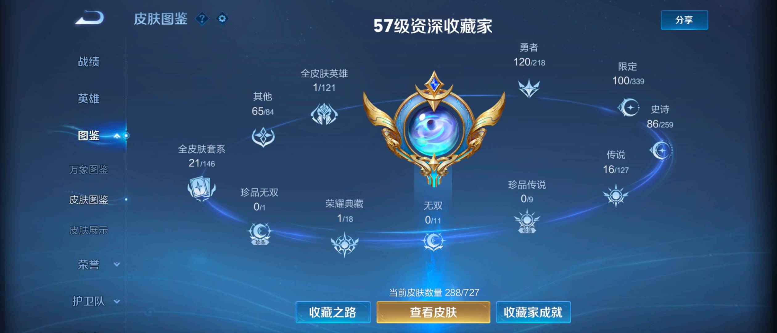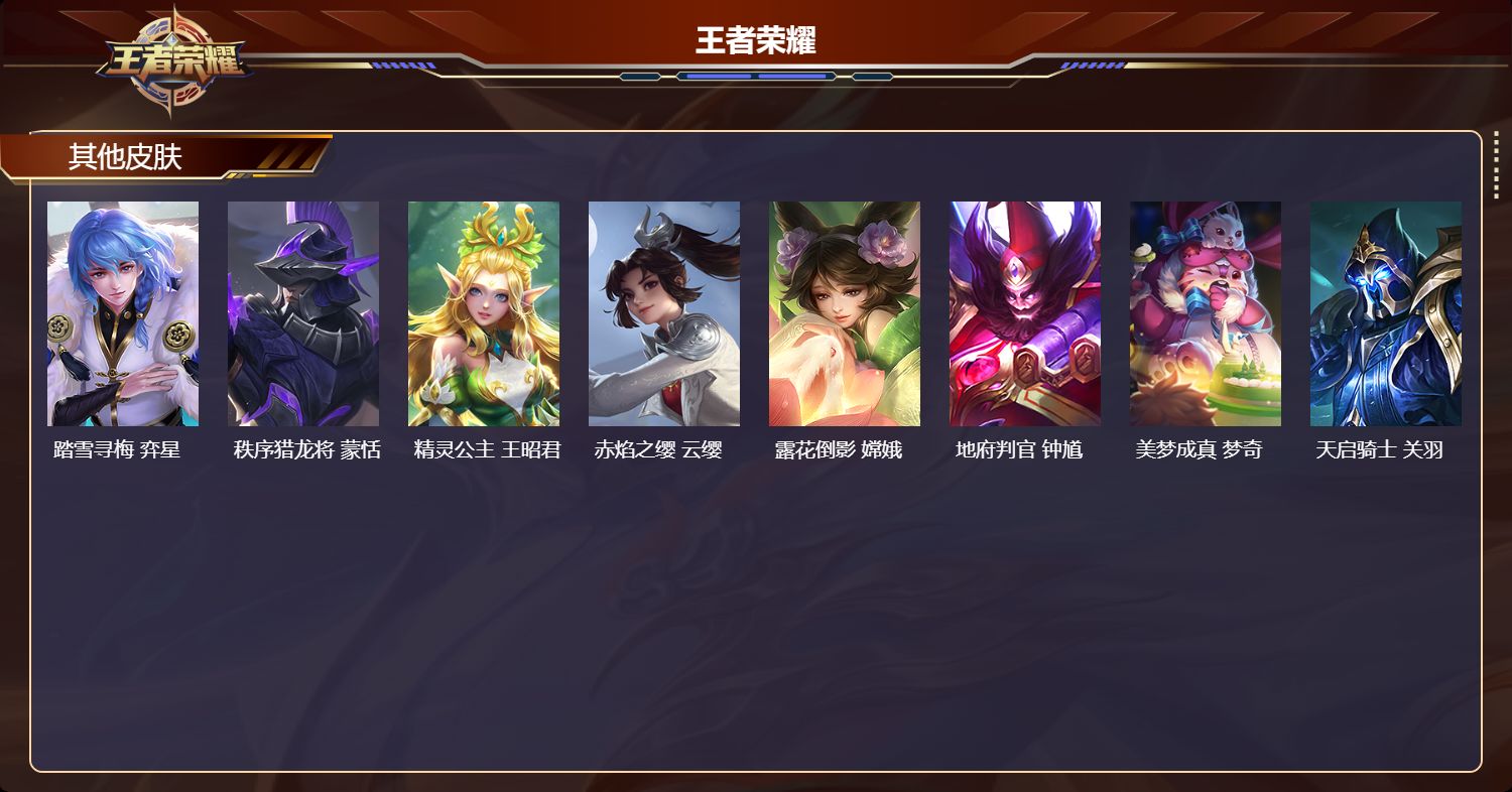 贵族等级:v8皮肤数:268传说品质20 情人节限定5 生肖限定3 荣耀典藏1 英雄数:119