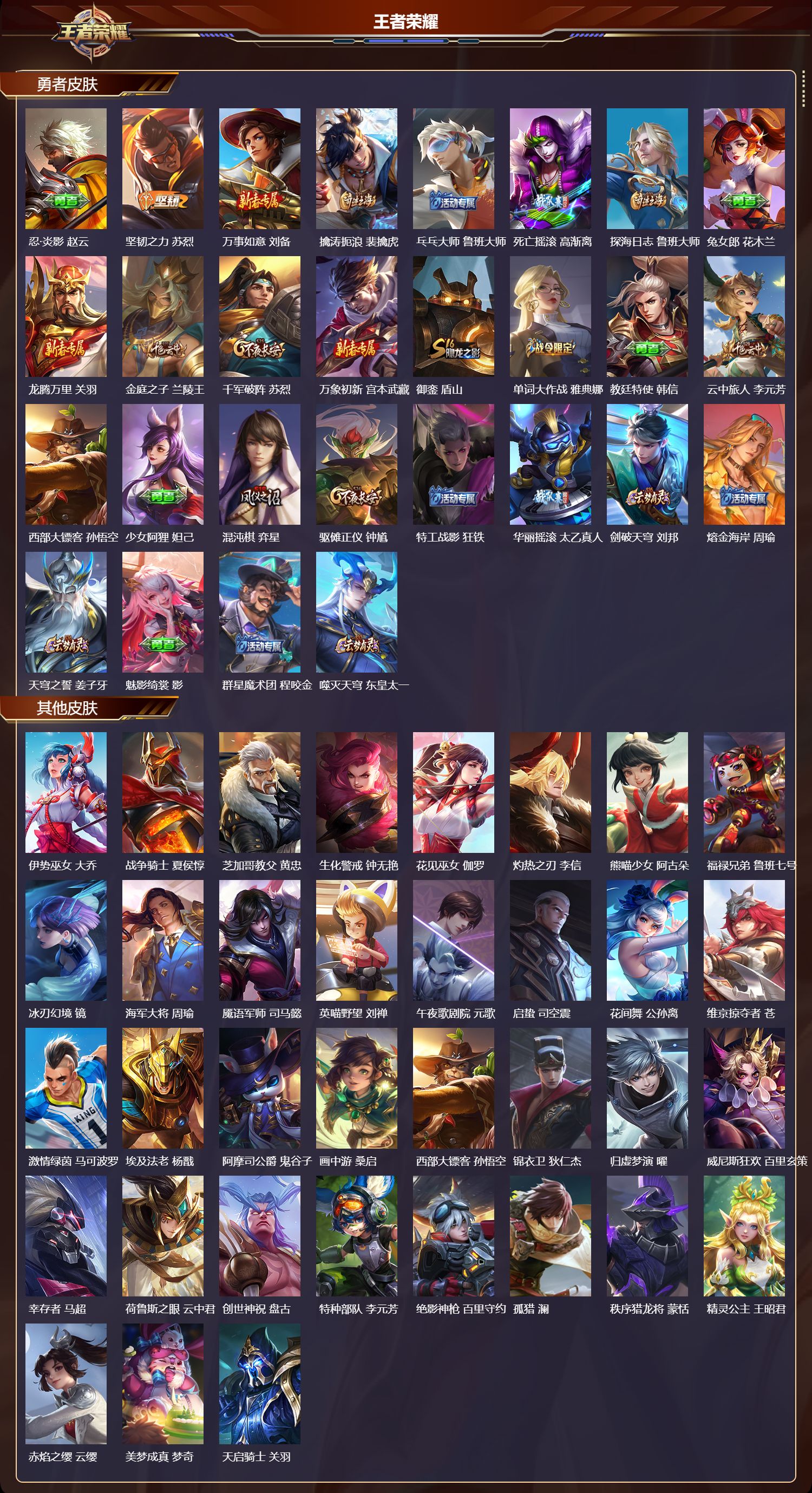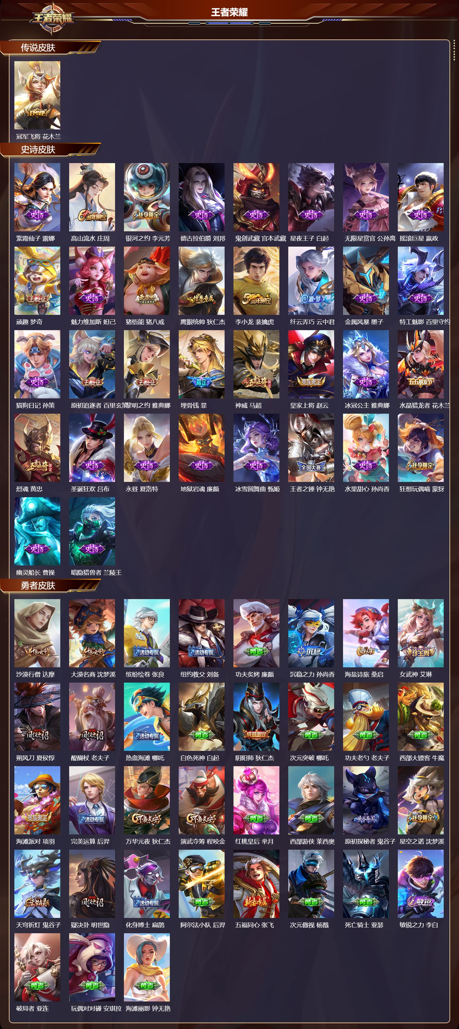 贵族等级:v7皮肤数:244传说品质17 生肖限定6 情人节限定3 荣耀典藏1 珍品传说1 英雄数:122
