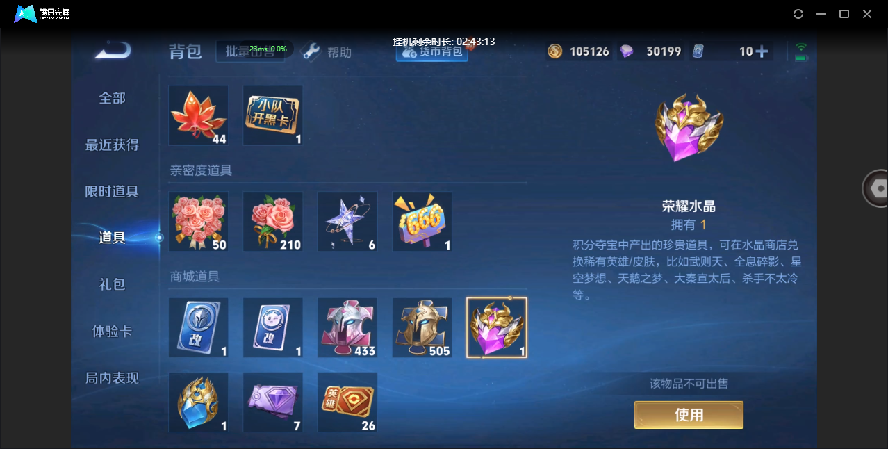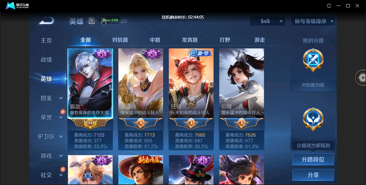 贵族等级:v7皮肤数:105传说品质13 生肖限定5 珍品传说2 荣耀典藏1 英雄数:101