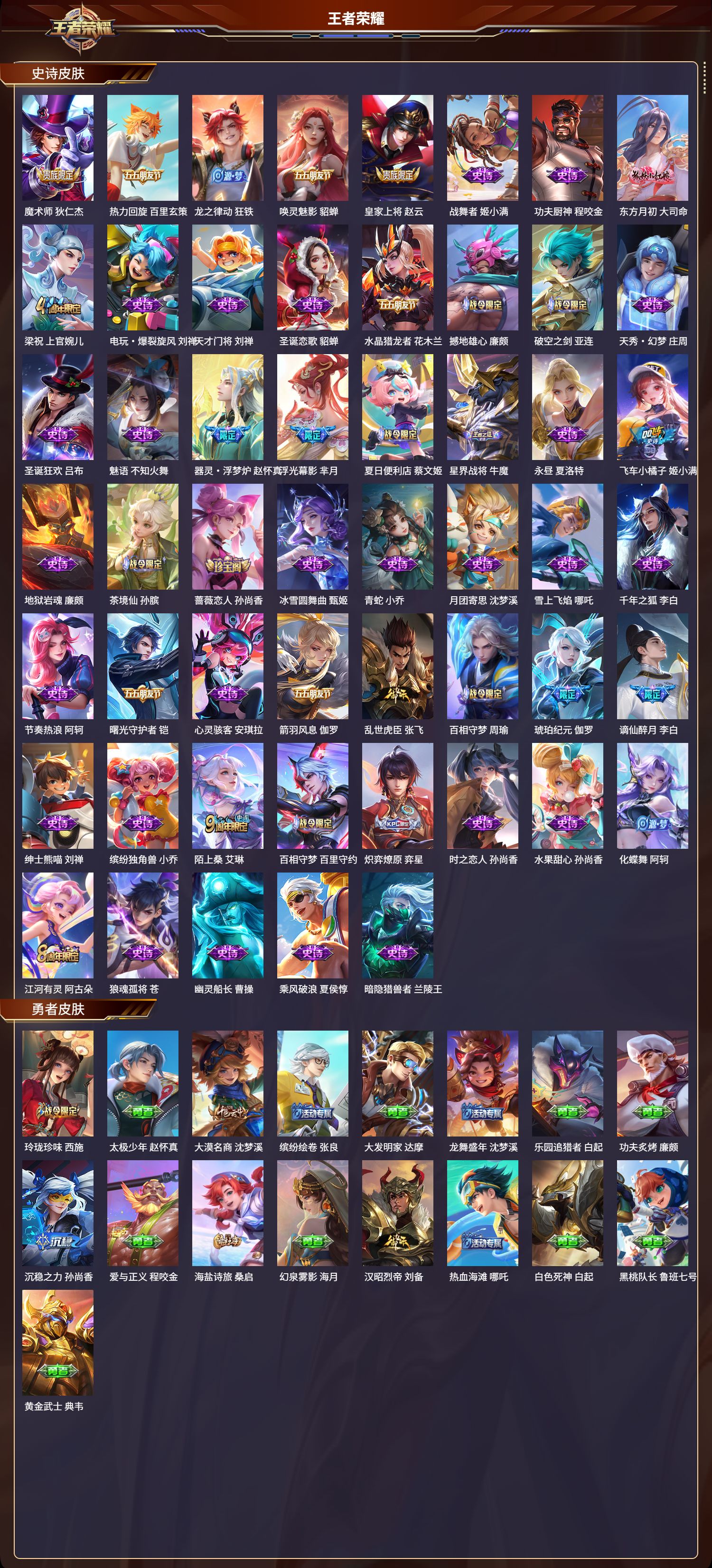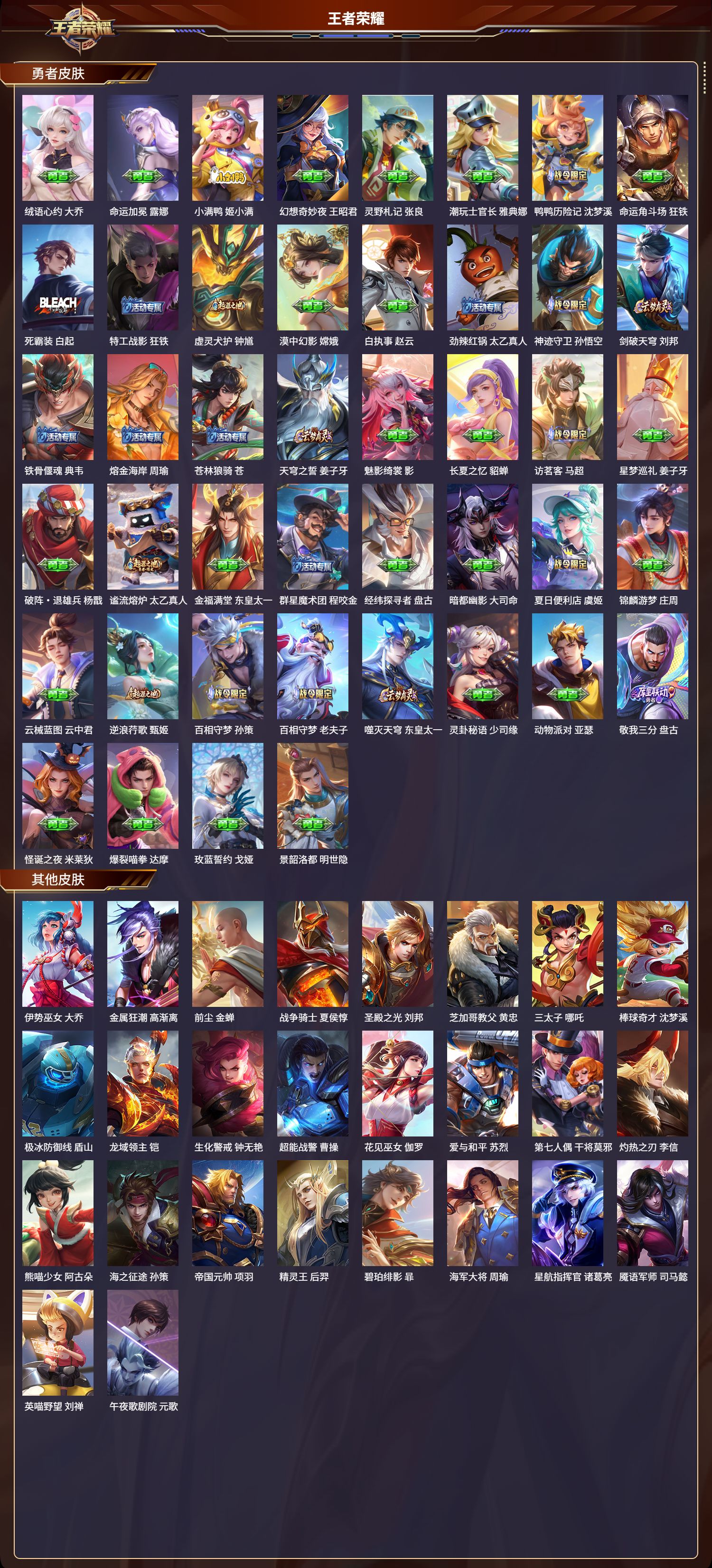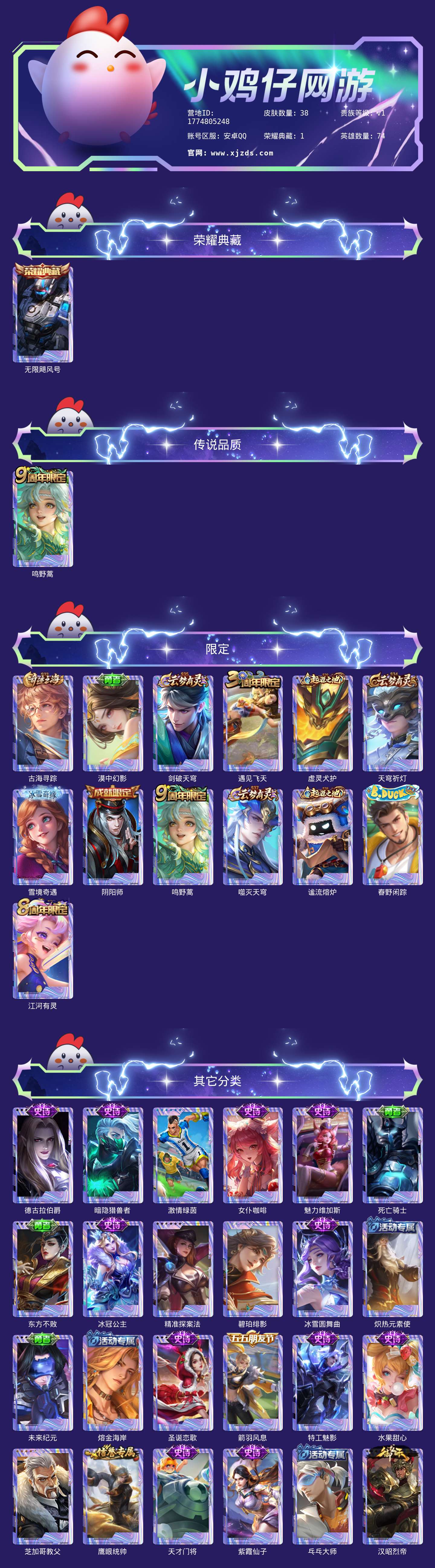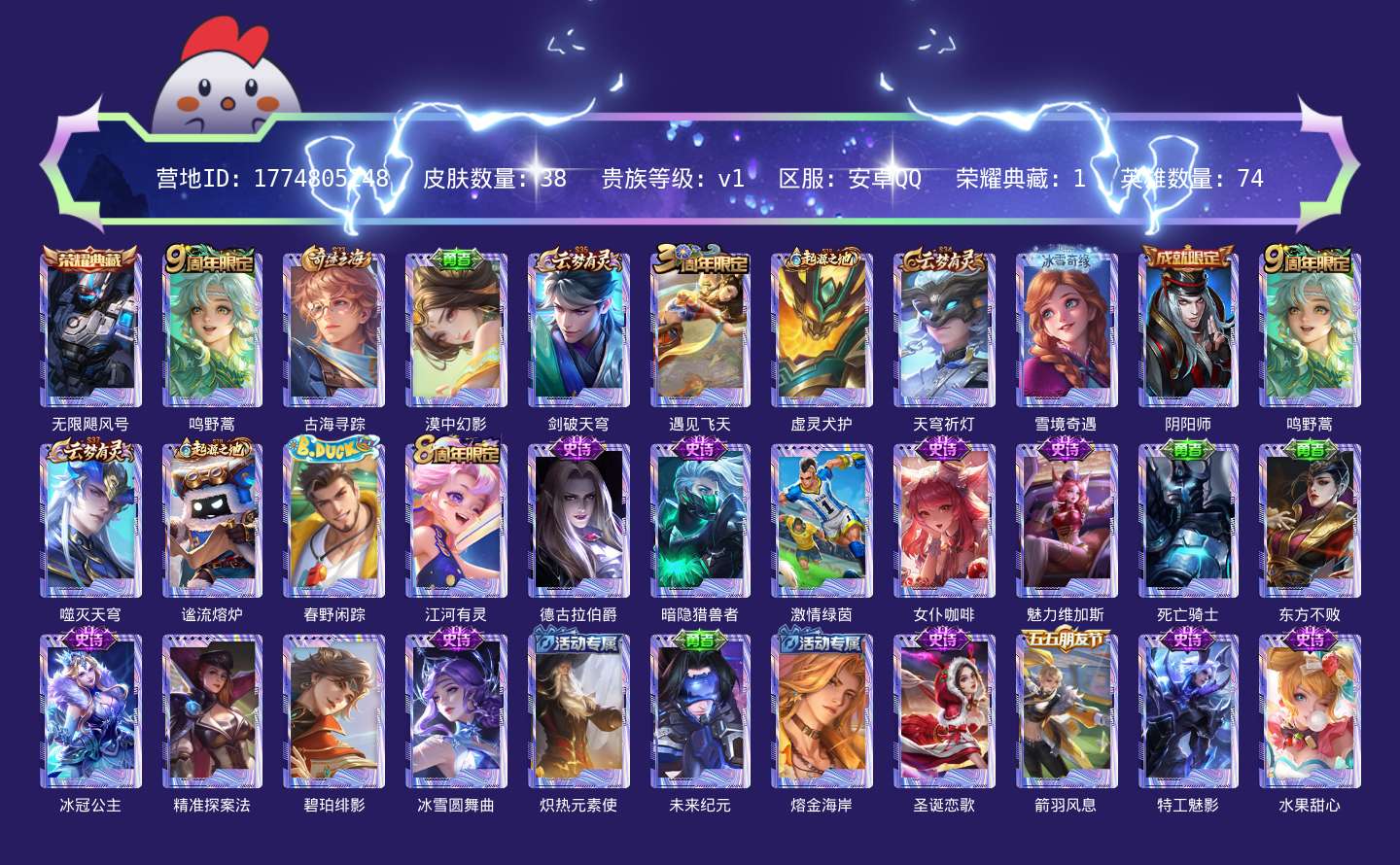 贵族等级:v1皮肤数:38荣耀典藏1 传说品质1 英雄数:74