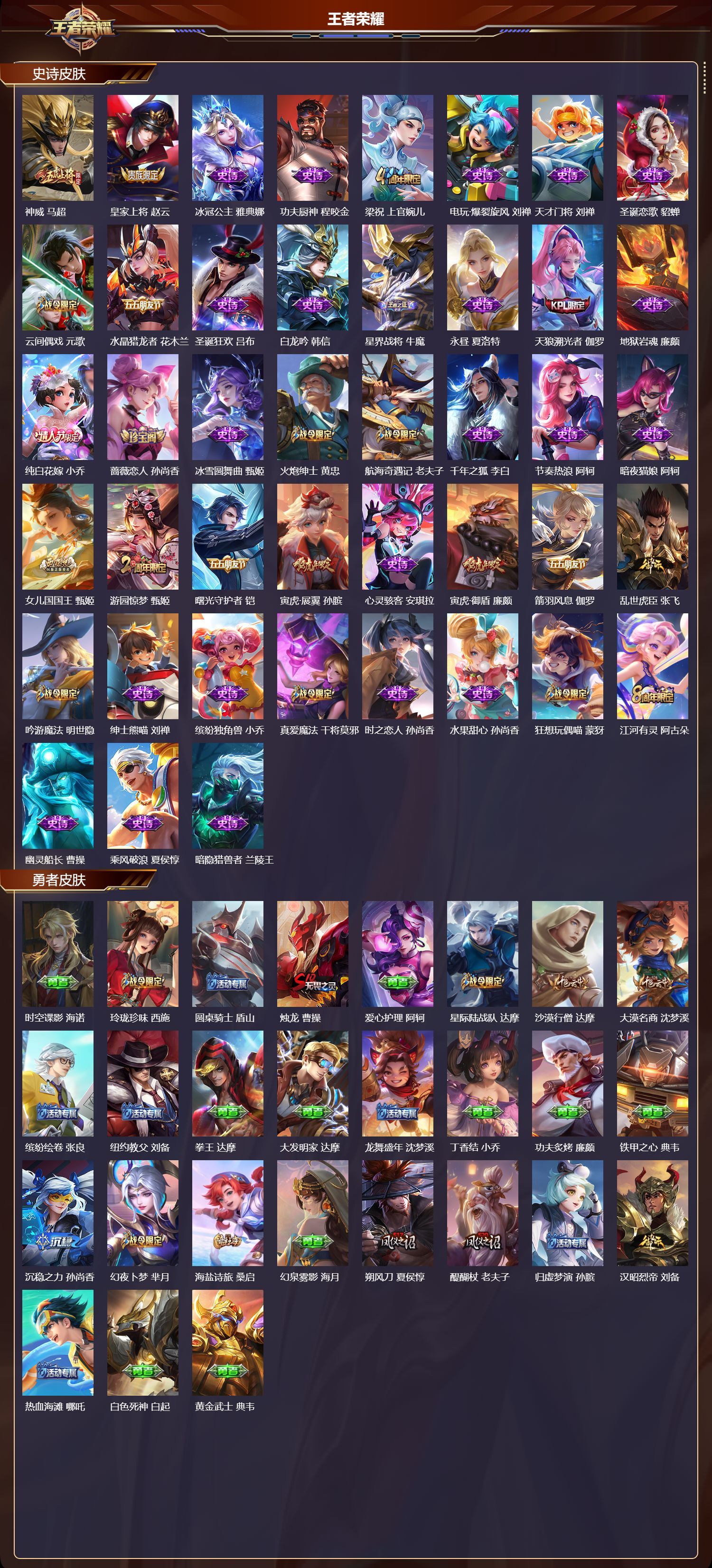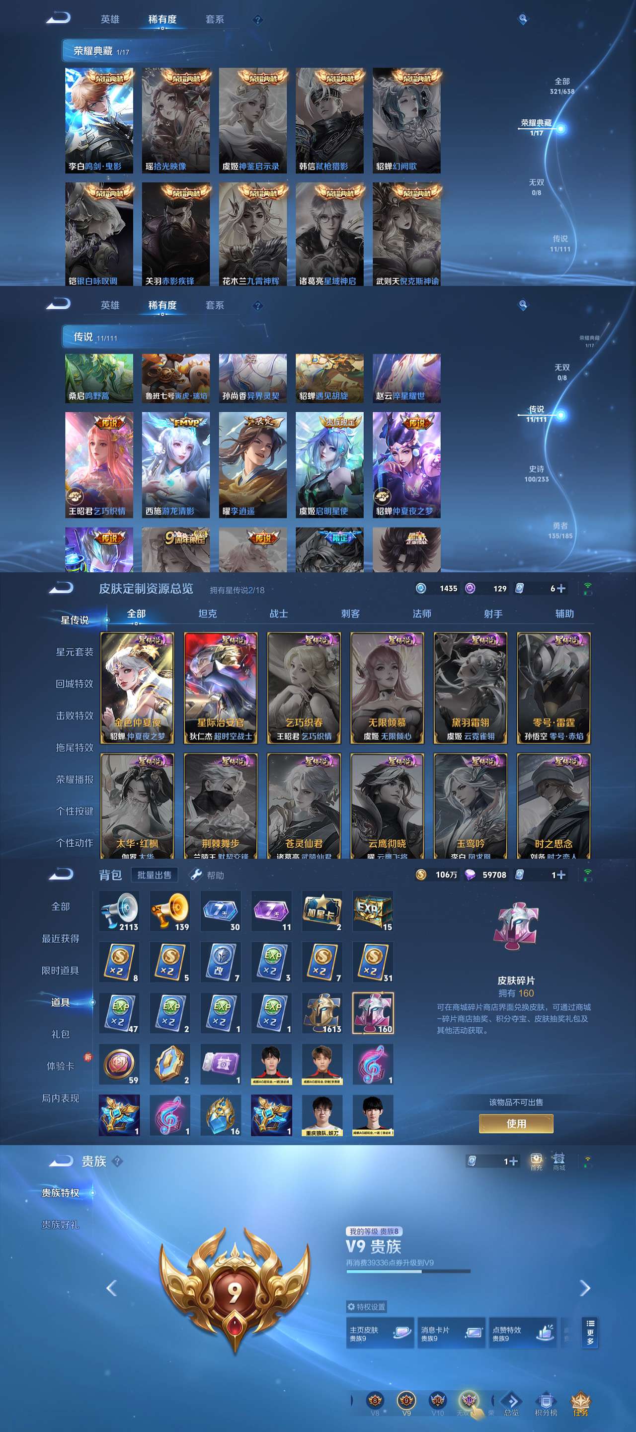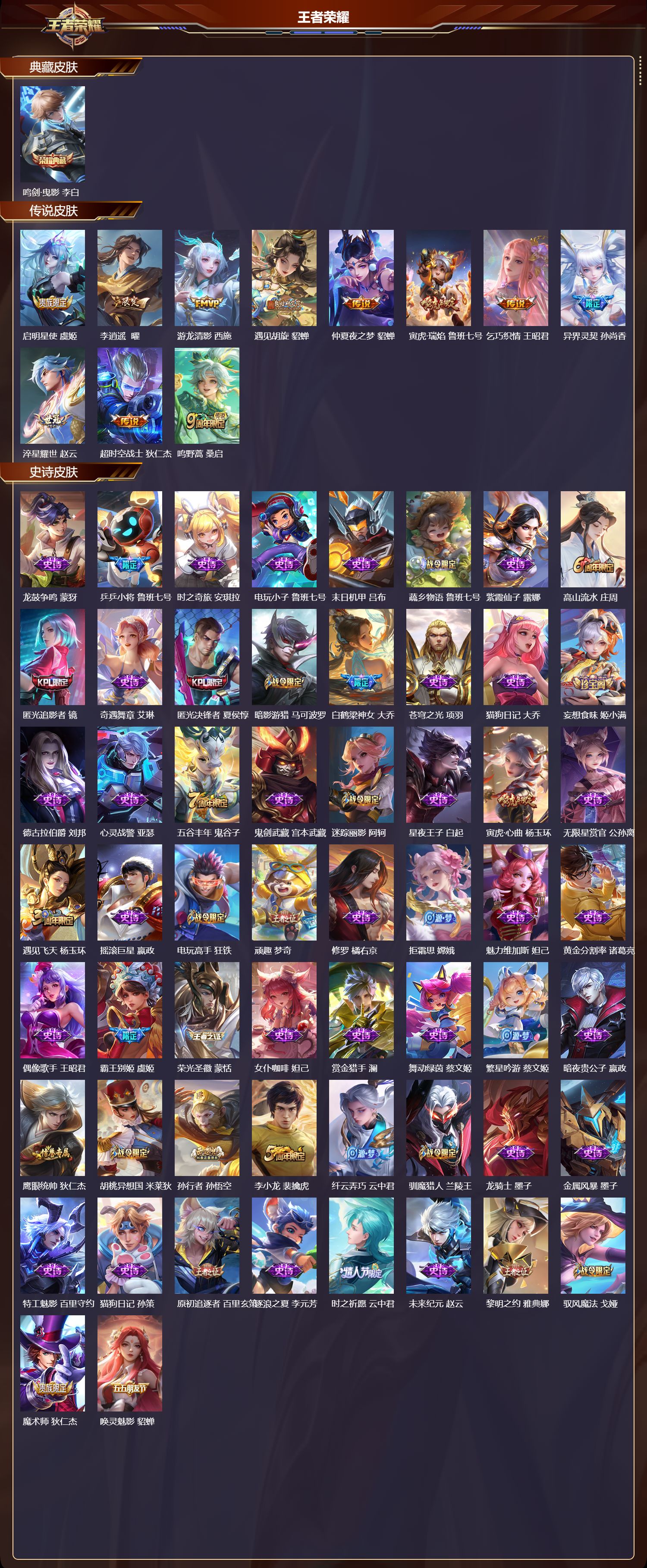 贵族等级:v6皮肤数:169传说品质5 生肖限定1 荣耀典藏1 英雄数:122