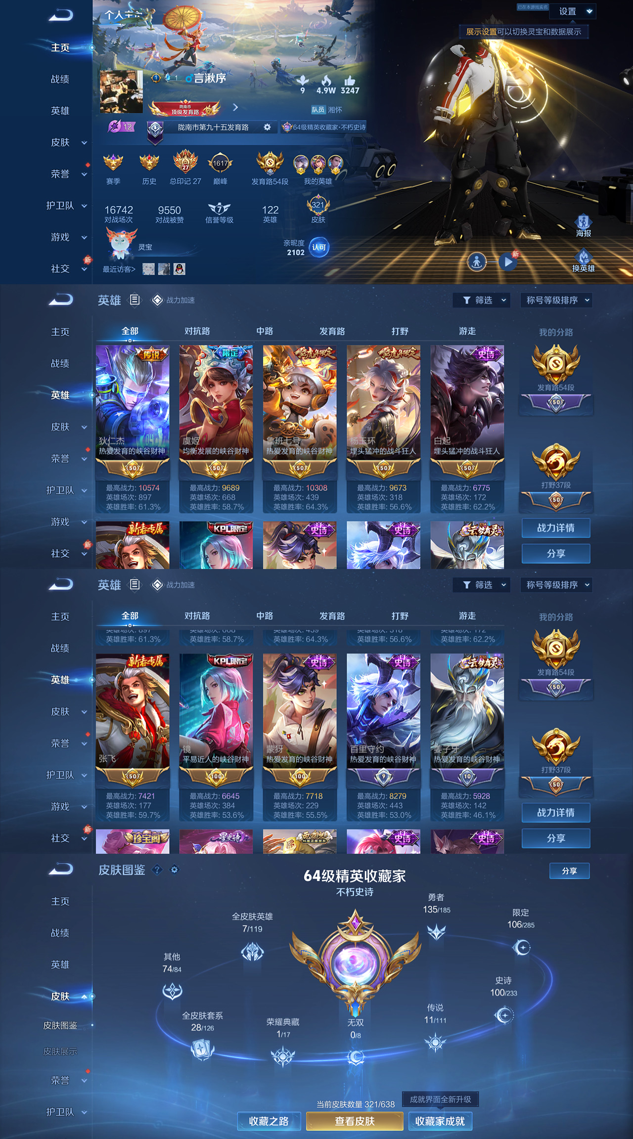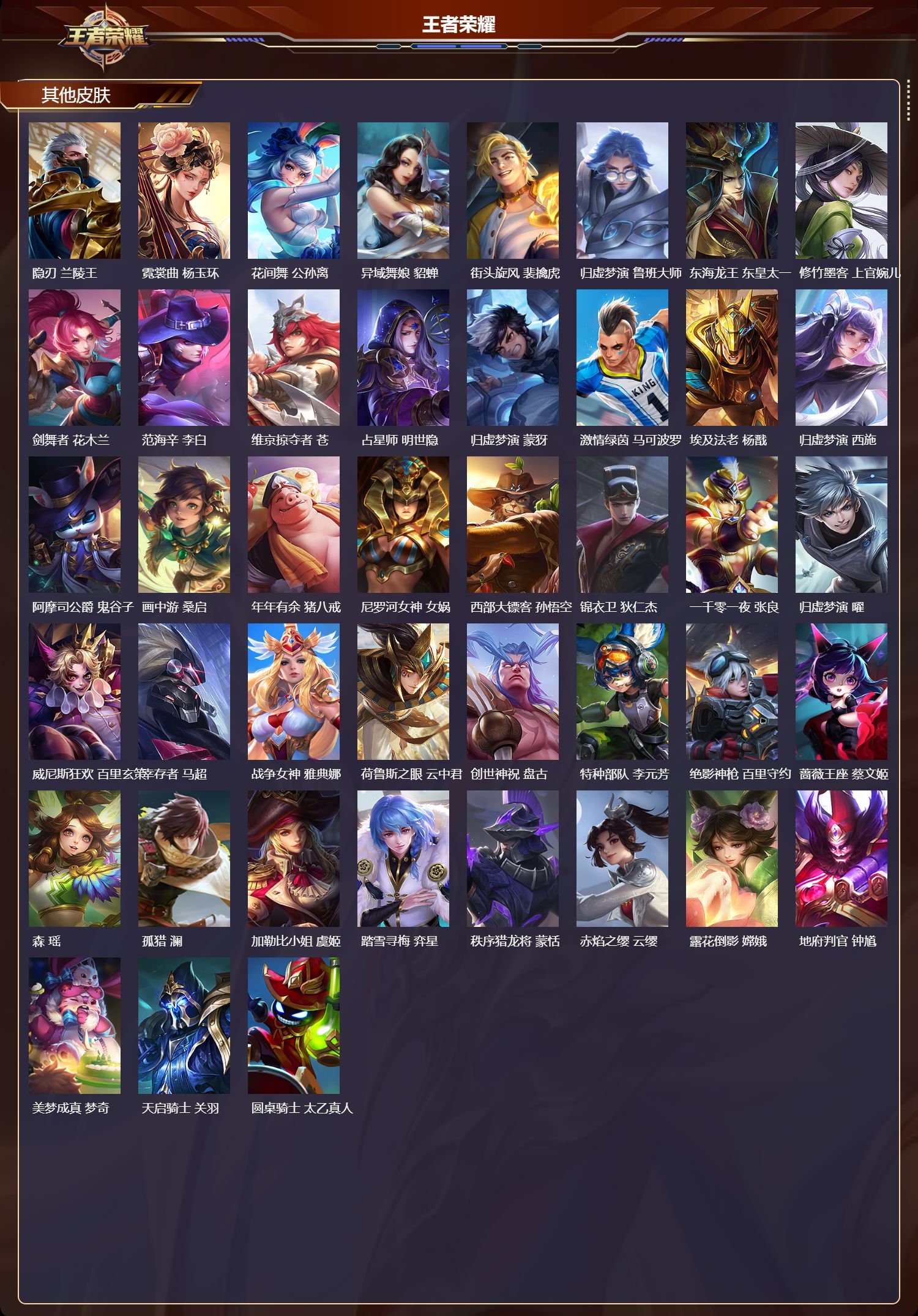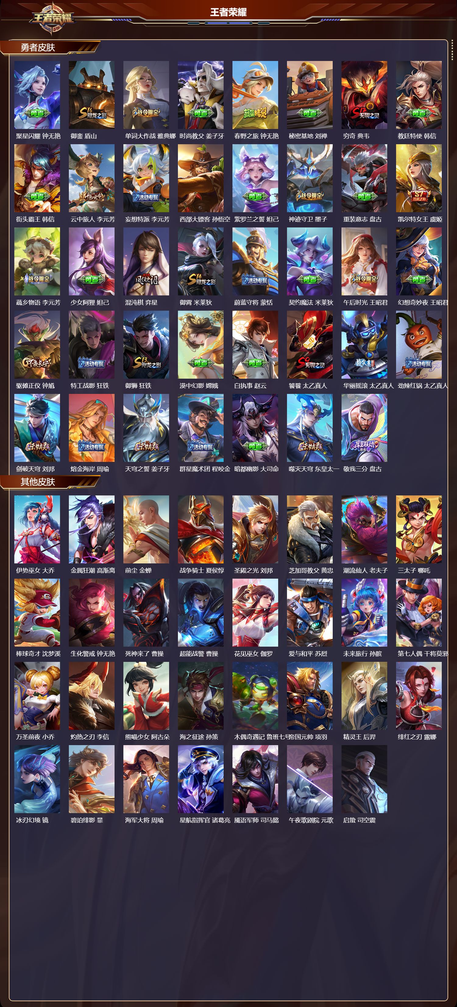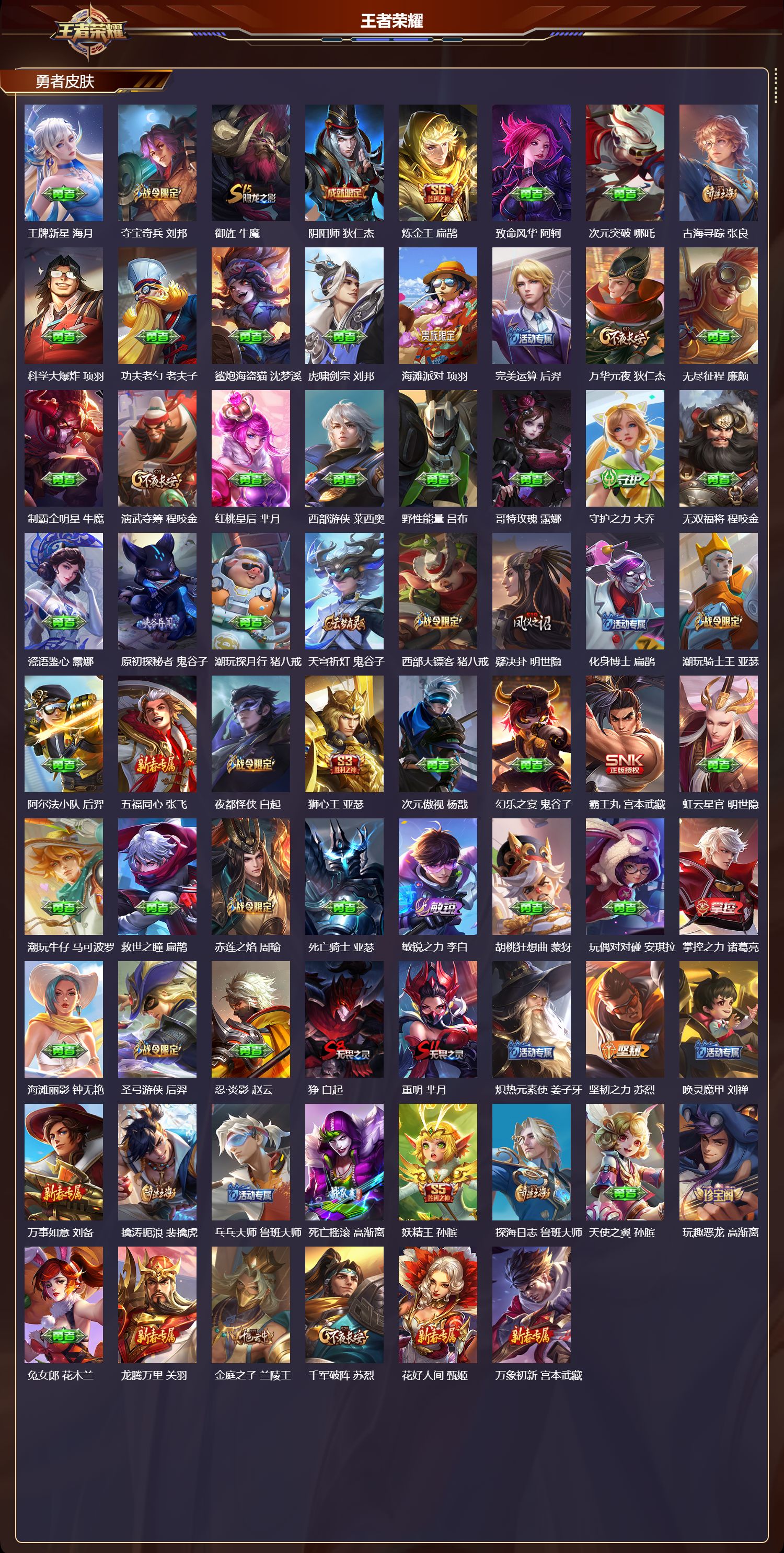 贵族等级:v6皮肤数:169传说品质5 生肖限定1 荣耀典藏1 英雄数:122