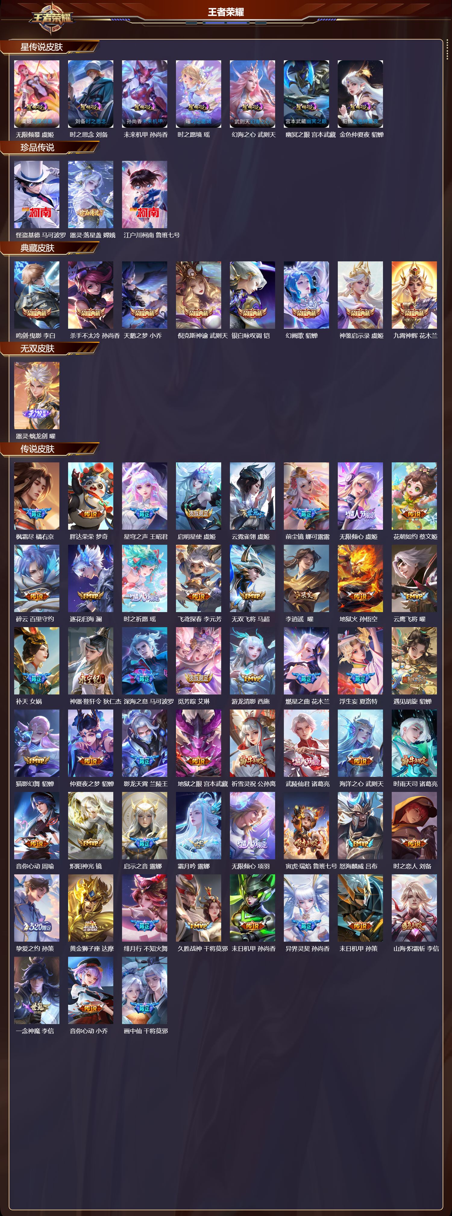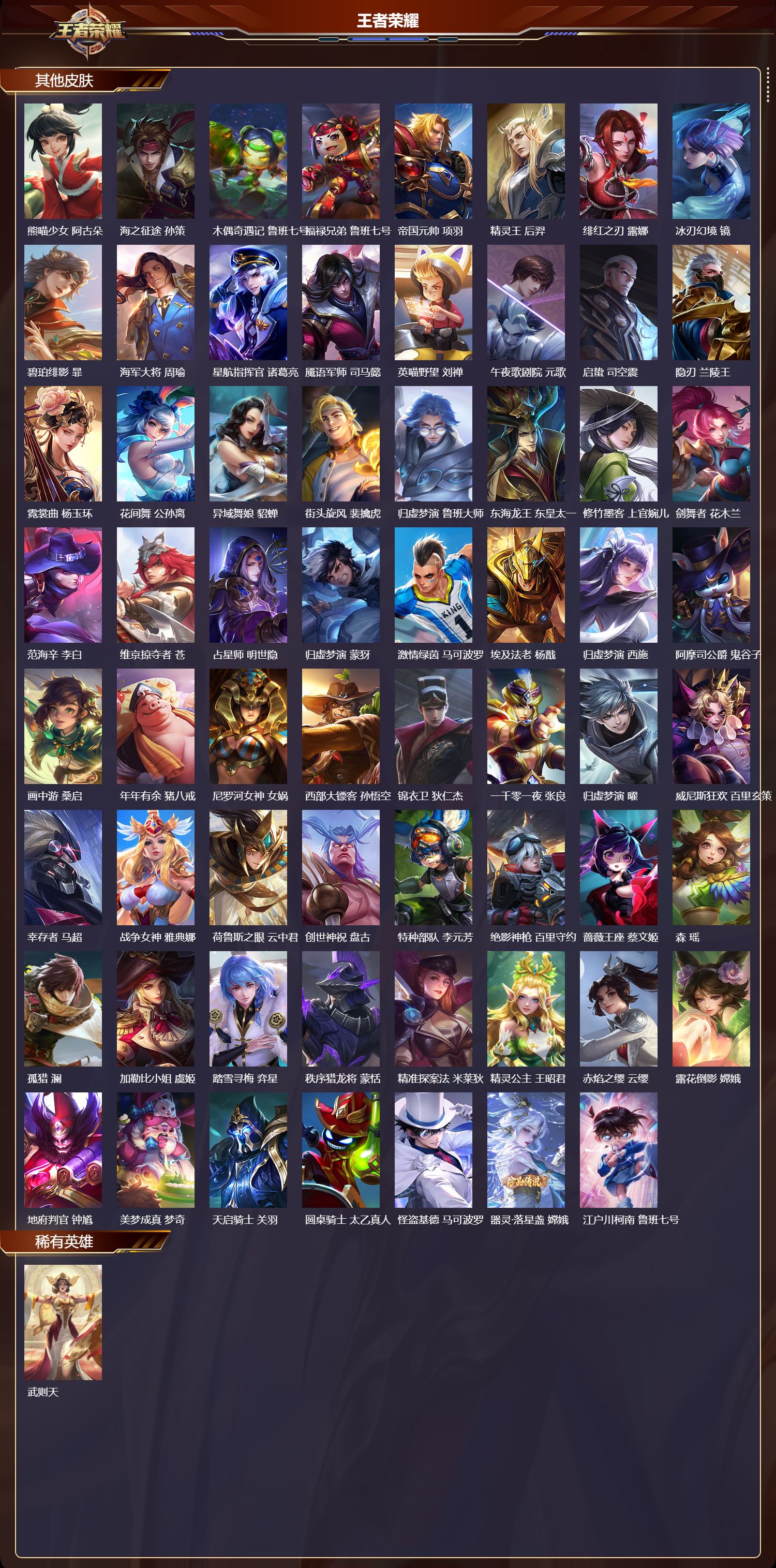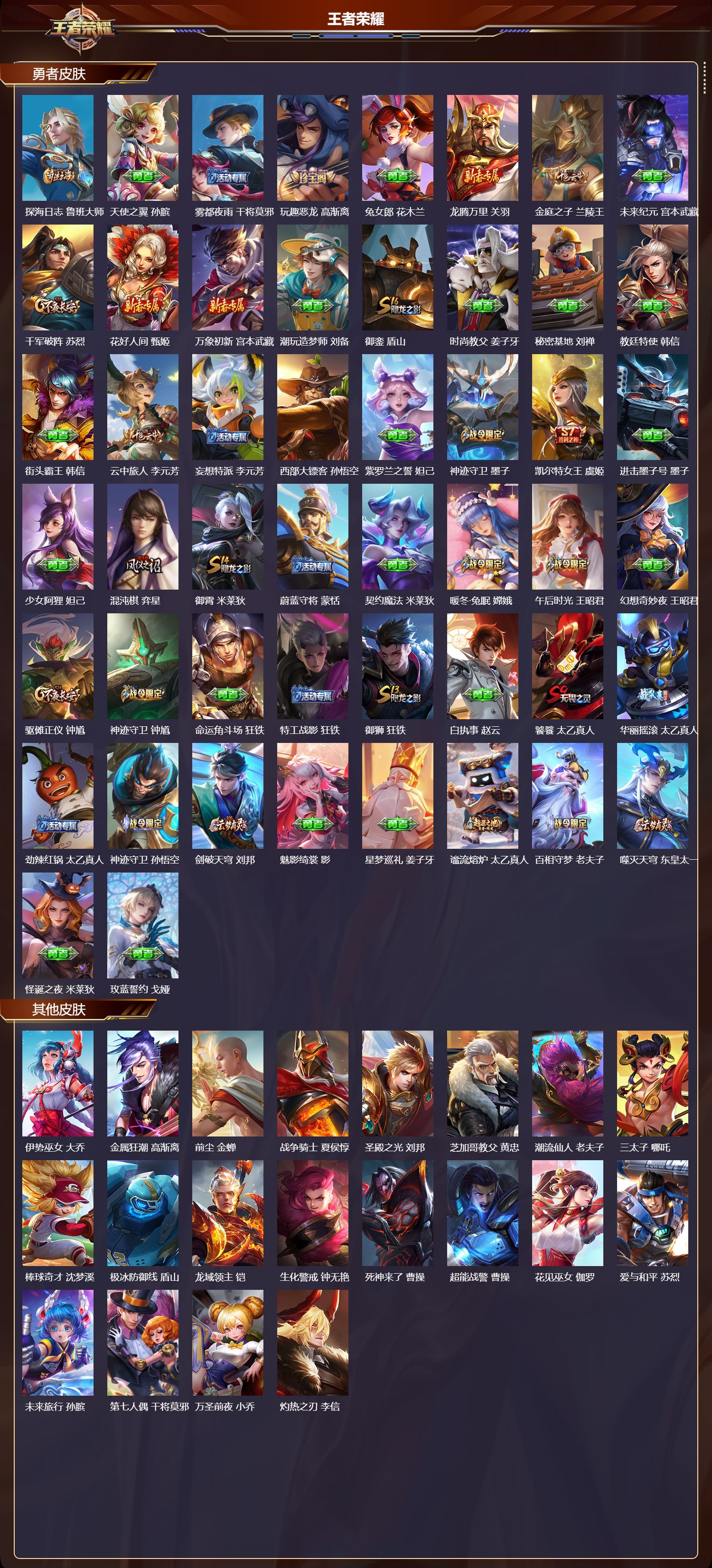 贵族等级:v8皮肤数:204荣耀典藏2 传说品质13 生肖限定5 情人节限定1 英雄数:120