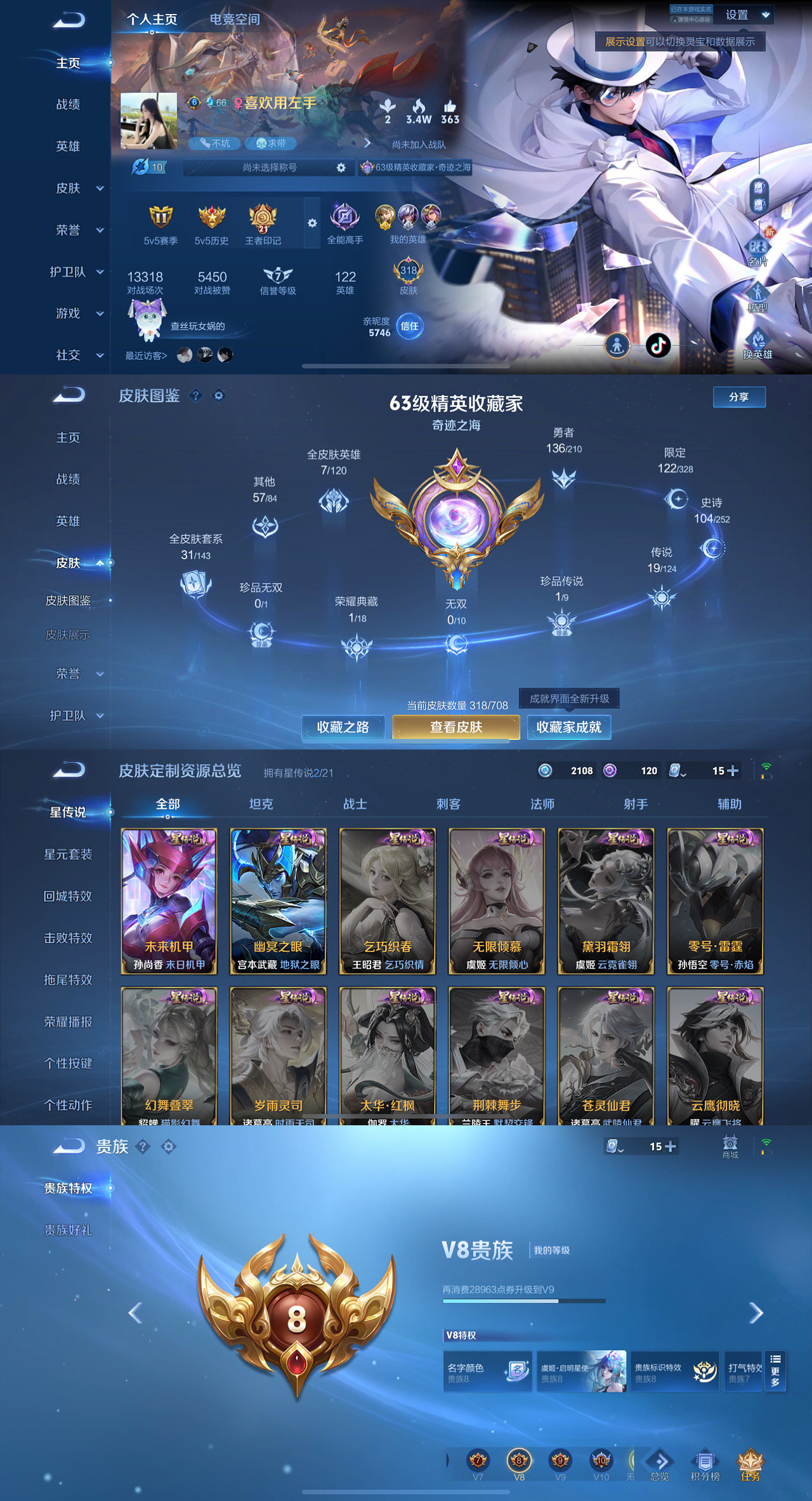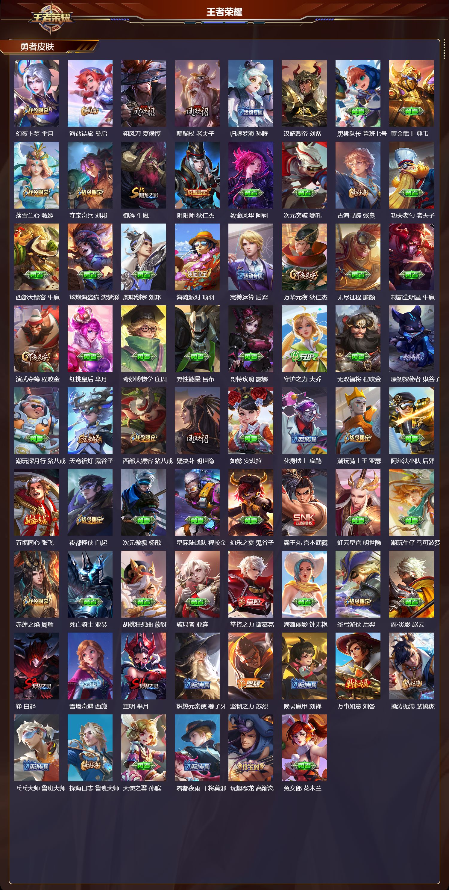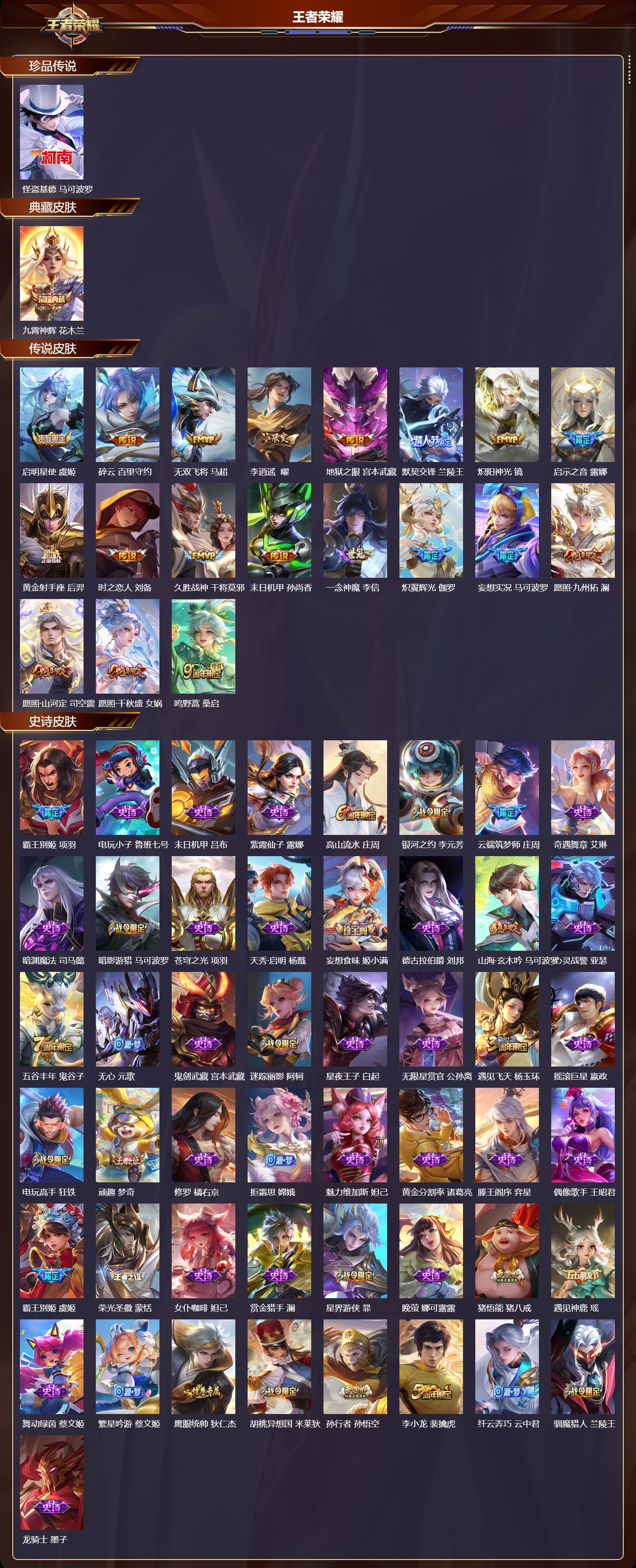贵族等级:v8皮肤数:133传说品质10 生肖限定4 荣耀典藏1 情人节限定1 英雄数:108