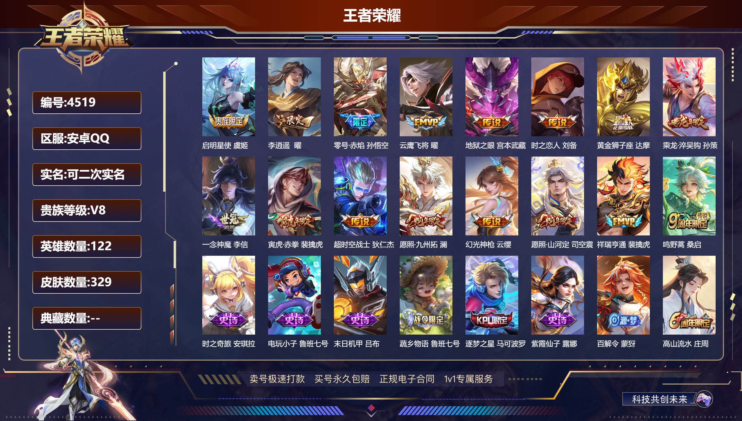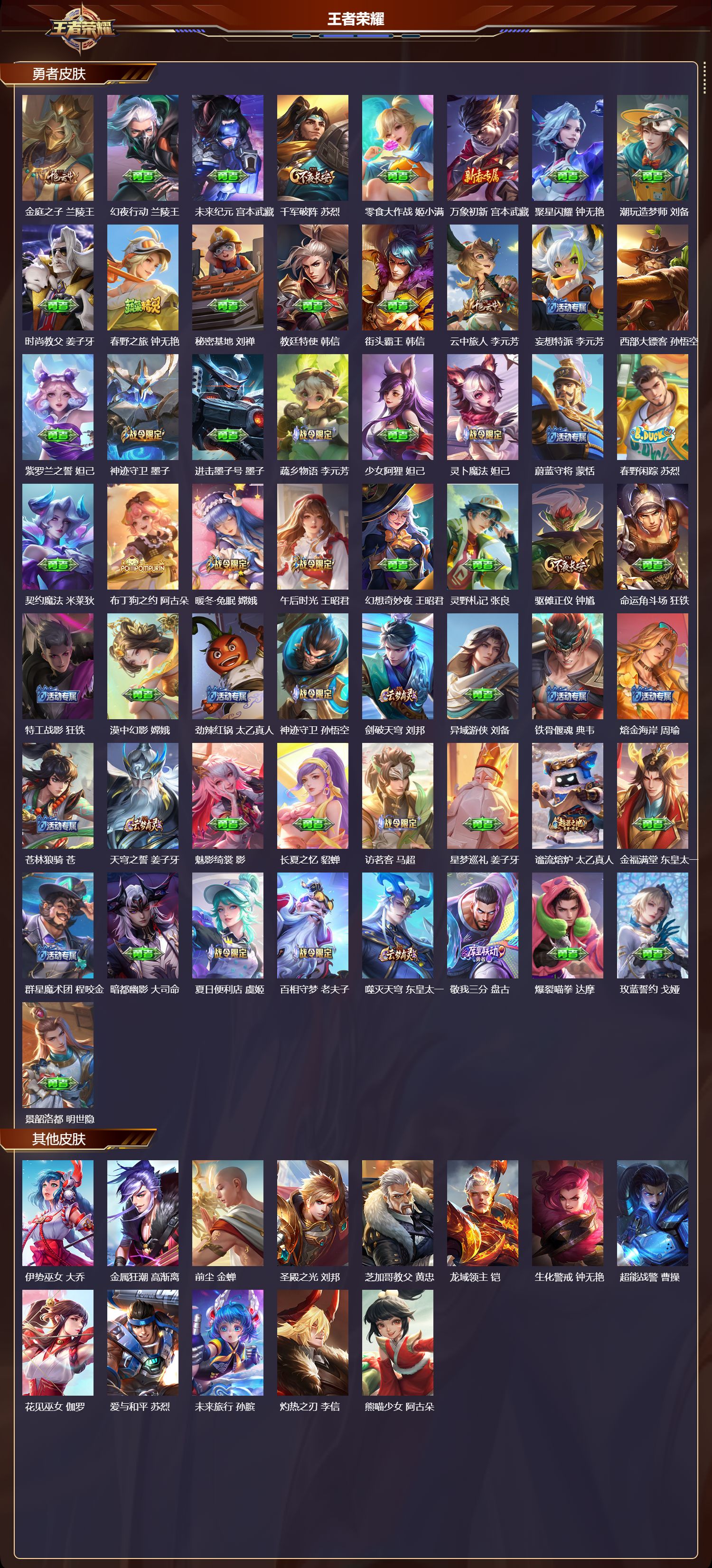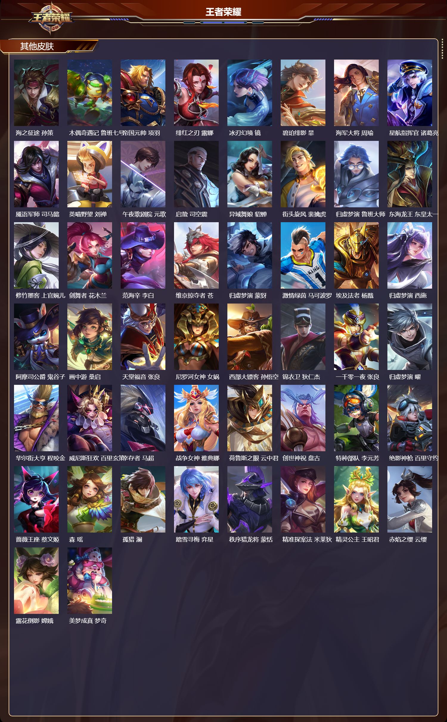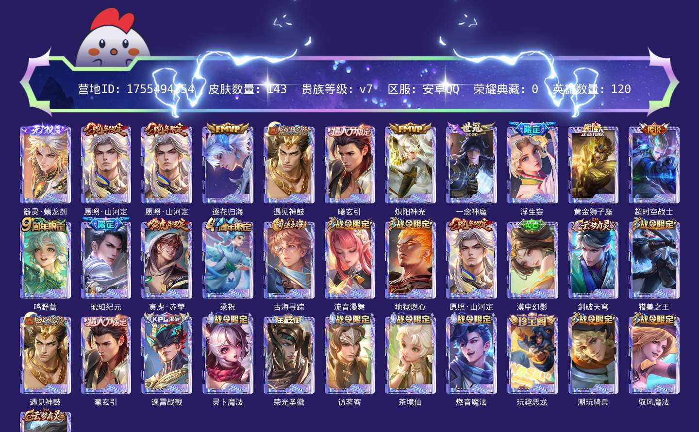 贵族等级:v7皮肤数:143传说品质12 生肖限定3 情人节限定1 无双1 英雄数:120