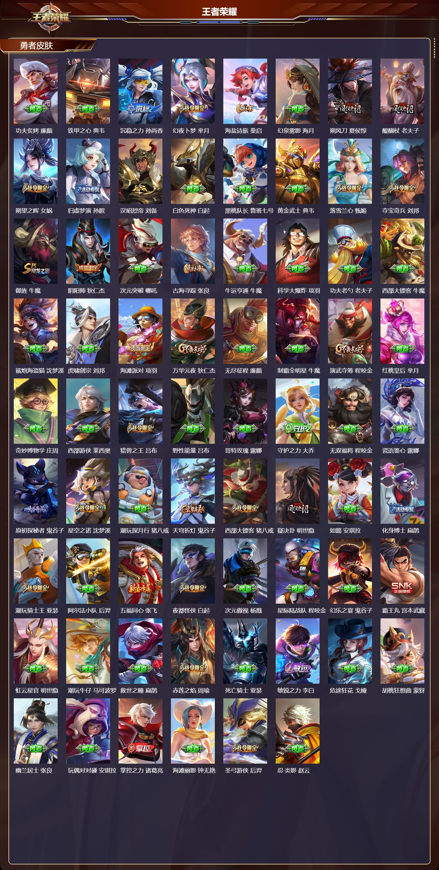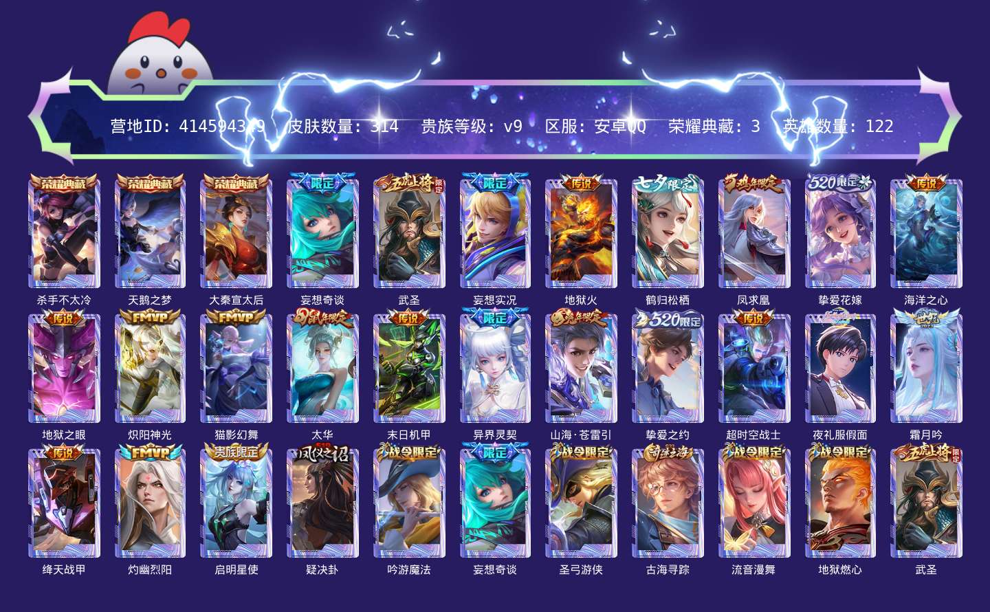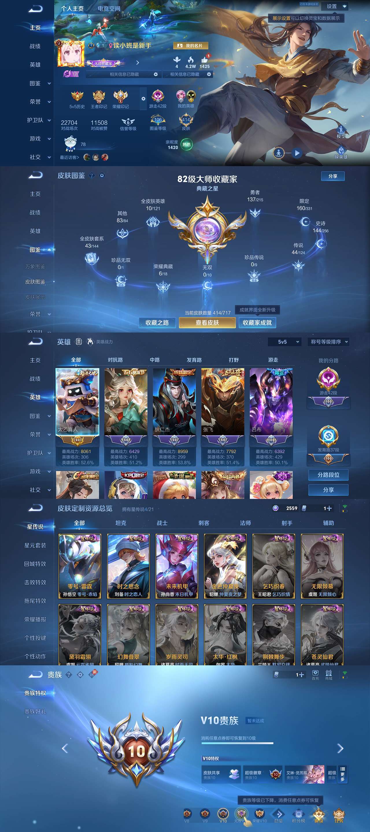贵族等级:v9皮肤数:314传说品质22 生肖限定7 情人节限定1 荣耀典藏3 英雄数:122