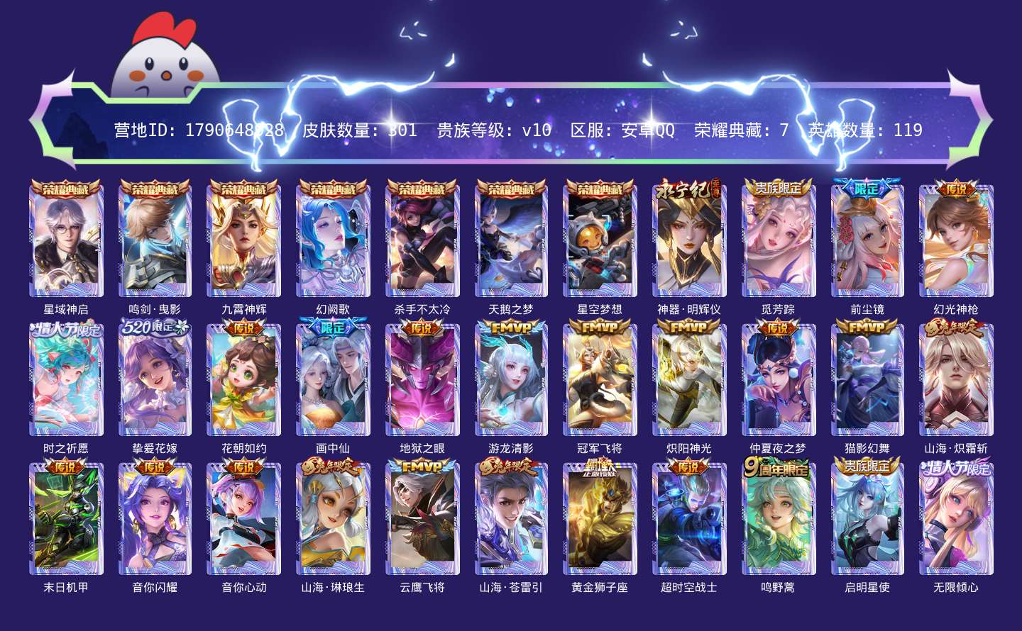 【V10女号 27传说301皮肤7水晶1无双3天幕1星元】安卓QQ-119英雄-301皮肤【7水晶】 幻阙歌 九霄神辉 星域神启 鸣剑·曳影 天鹅之梦 星空梦想 杀手不太冷【无双皮肤】神器·明辉仪【星元皮肤】金色仲夏夜【传说皮肤】时之祈愿 觅芳踪 鸣野蒿 云鹰飞将 无限倾心 画中仙 山海·苍雷引 山海·琳琅生 山海·炽霜斩 前尘镜 音你闪耀 挚爱花嫁 花朝如约 黄金狮子座 超时空战士 仲夏夜之梦 猫影幻舞 地狱之眼 冠军飞将 炽阳神光 飞鸢探春 末日机甲 乞巧织情 游龙清影 音你心动 启明星使 幻光神枪【史诗皮肤】神威 化蝶舞 茶境仙 奇幻香踪 玫瑰异探 山海·碧波行 顽趣 星界游侠 银翎春语 山海·玄木吟 冰霜神祇 魅语 舞动绿茵 幽灵船长 功夫厨神 女仆咖啡 魅力维加斯 猫狗日记 魔术师 鹰眼统帅 圣诞恋歌 箭羽风息 无限星赏官 鬼剑武藏 白龙吟 修罗 曙光守护者 暗隐猎兽者 千年之狐 逐浪之夏 银河之约 德古拉伯爵 绅士熊喵 天才门将 紫霞仙子 圣诞狂欢 末日机甲 金属风暴 龙骑士 晚萤 暗渊魔法 猫狗日记 水果甜心 时之恋人 偶像歌手 诗语江南 乘风破浪 苍穹之光 纯白花嫁 缤纷独角兽 青蛇 冰冠公主 黎明之约 心灵战警 遇见神鹿 暗夜贵公子 乱世虎臣 皇家上将 冰雪圆舞曲 玄嵩 降魔 无心 神器·万象笔 滕王阁序 时之奇旅 未来纪元 超时空战士 匿光启智者 唐三藏 千筹问战 电玩高手 唤灵魅影 奇遇舞章 吟游魔法 永昼 暗夜猫娘 节奏热浪 心灵骇客 星夜王子 特工魅影 朱雀志【勇者皮肤】古海寻踪 妄想特派 西部游侠 剑破天穹 玲珑珍味 春野之旅 云中旅人 暖冬·兔眠 命运角斗场 时尚教父 龙舞盛年 危途狂花 金庭之子 破局者 群星魔术团 海盐诗旅 落雪兰心 功夫炙烤 金色潮汐 鸿运当头 玫蓝誓约 景韶洛都 噬灭天穹 魅影绮裳 雪境奇遇 访茗客 星梦巡礼 雾都夜雨 玩趣恶龙 未来纪元 万象初新 龙腾万里 幻乐之宴 街头霸王 教廷特使 阿尔法小队 兔女郎 特工战影 敏锐之力 万事如意 汉昭烈帝 哥特玫瑰 瓷语鉴心 乓乓大师 野性能量 红桃皇后 虹云星官 进击墨子号 次元突破 西部大镖客 鲨炮海盗猫 坚韧之力 天使之翼 归虚梦演 沉稳之力 幻想奇妙夜 东方不败 海滩派对 丁香结 死亡骑士 五福同心 忍·炎影 白执事 花好人间 海滩丽影 掌控之力 鲤鱼之梦 幻泉雾影 潮玩骑兵 擒涛扼浪 太极少年 潮玩造梦师 大漠名商 午后时光 潮玩探月行 契约魔法 牛运亨通 蔚蓝守将 乐园追猎者 胡桃狂想曲 夜都怪侠 爱心护理 玩偶对对碰 白色死神 救世之瞳 化身博士 爱与正义 星际陆战队 无双福将 大发明家 拳王 少女阿狸 守护之力 阴阳师 黄金武士 营地ID:1790648928