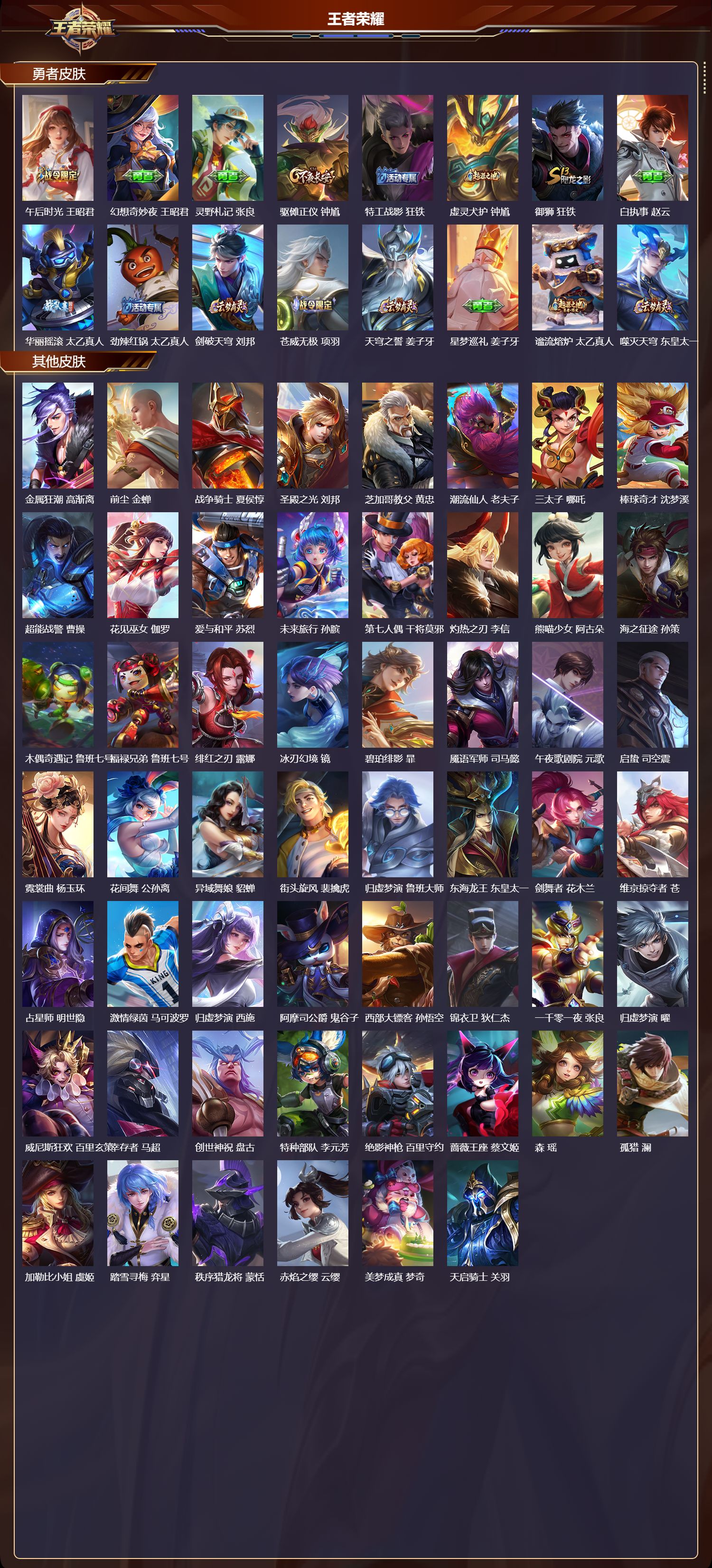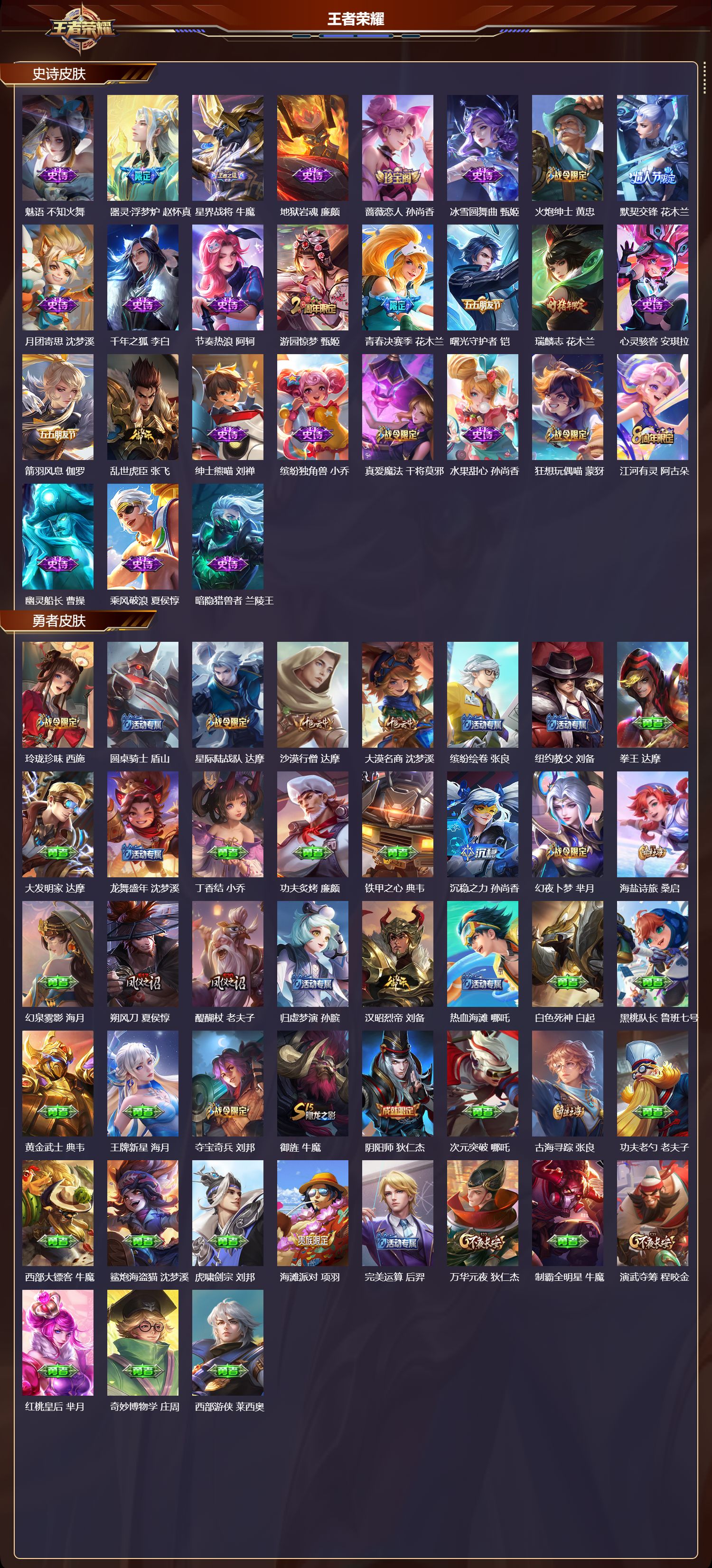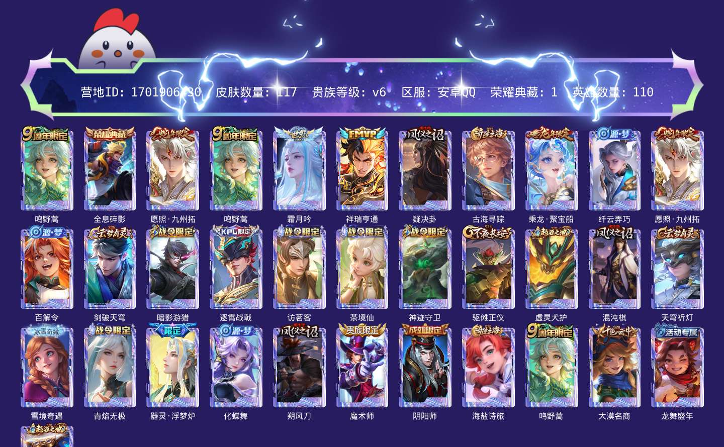贵族等级:v6皮肤数:117生肖限定2 传说品质4 荣耀典藏1 英雄数:110