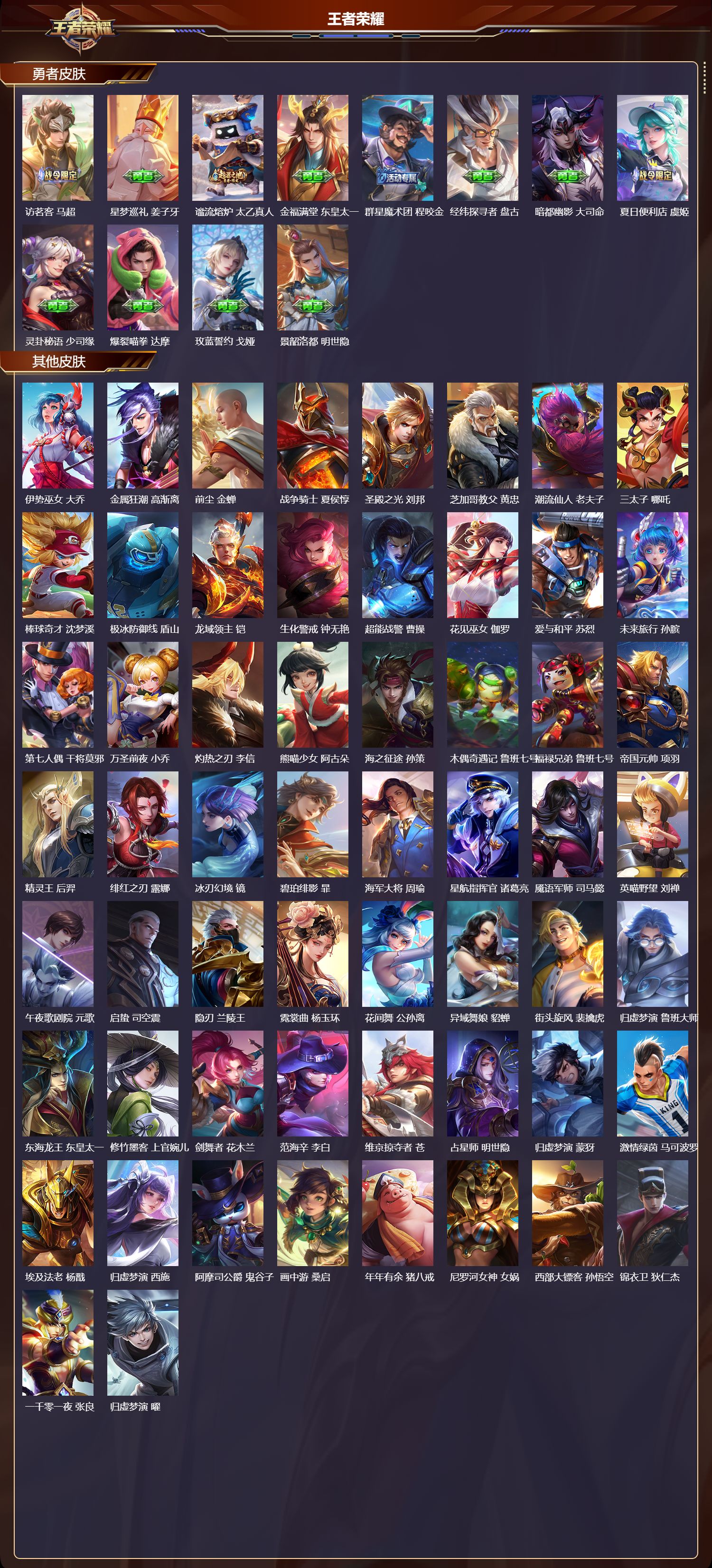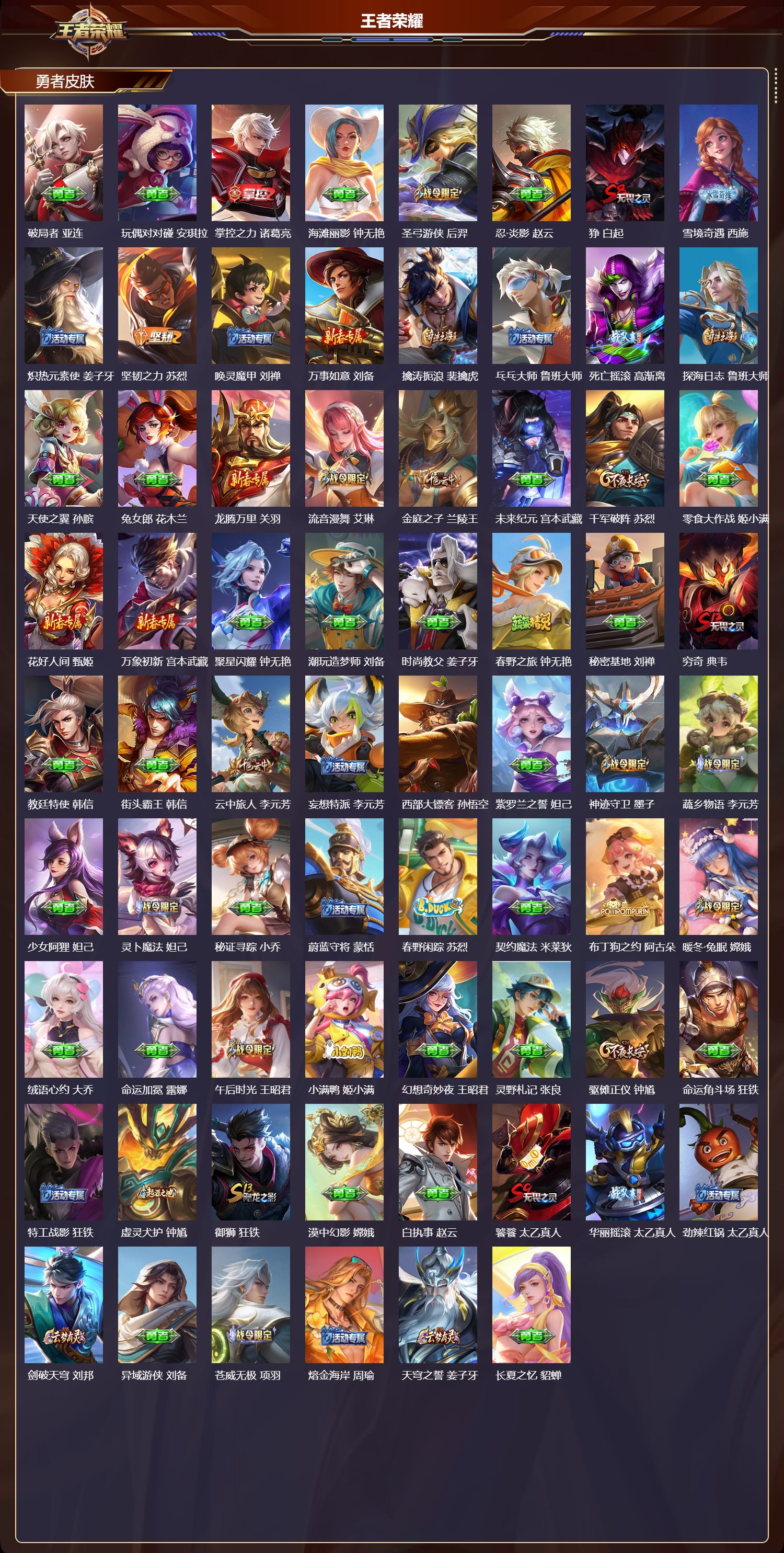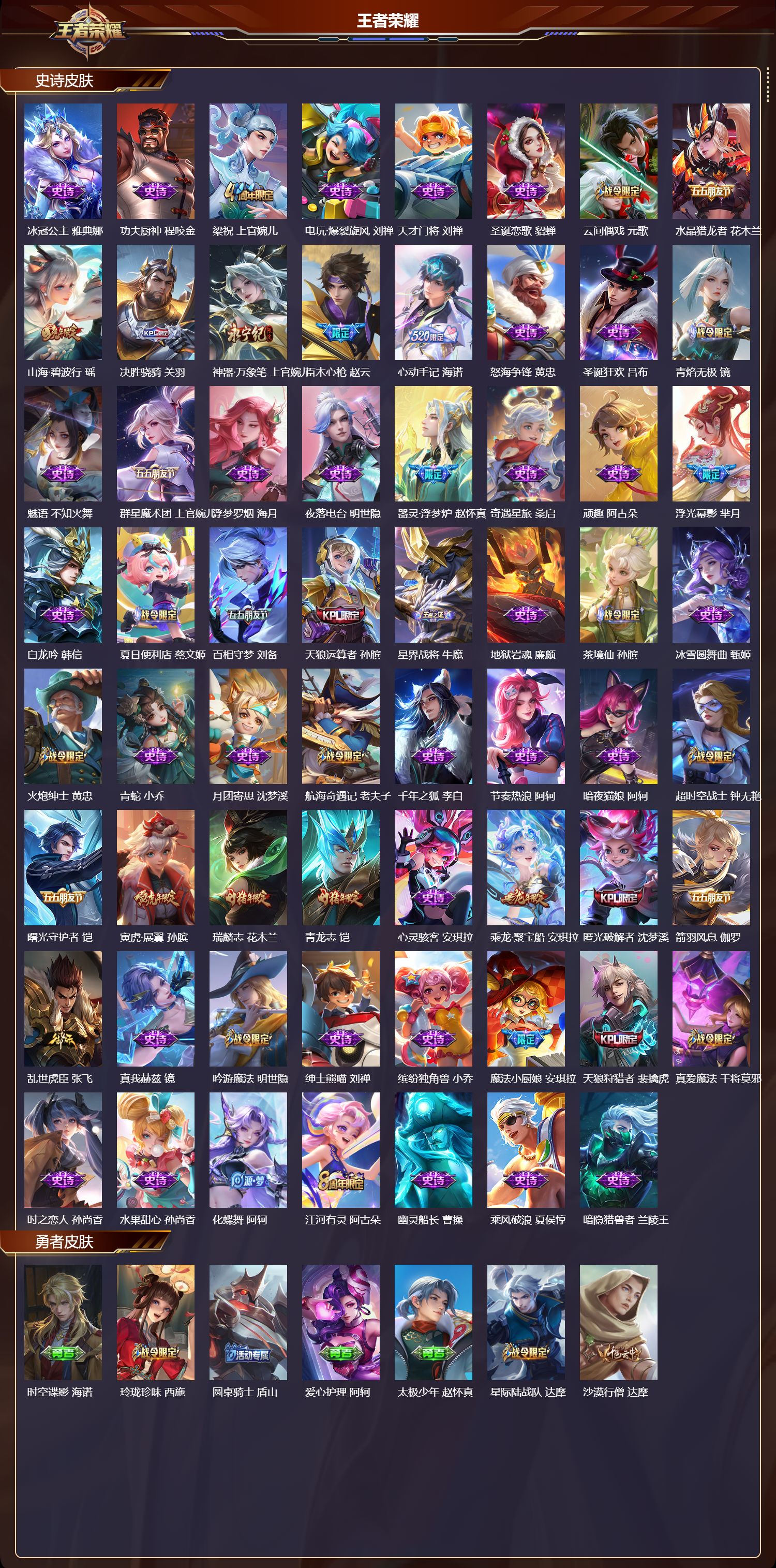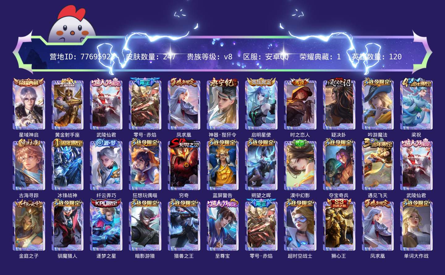 贵族等级:v8皮肤数:247传说品质7 情人节限定2 荣耀典藏1 生肖限定2 英雄数:120