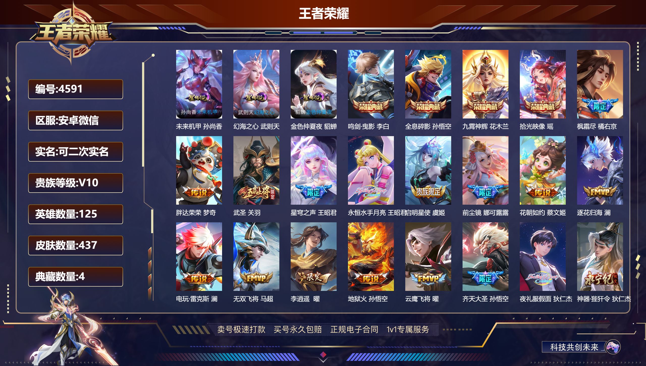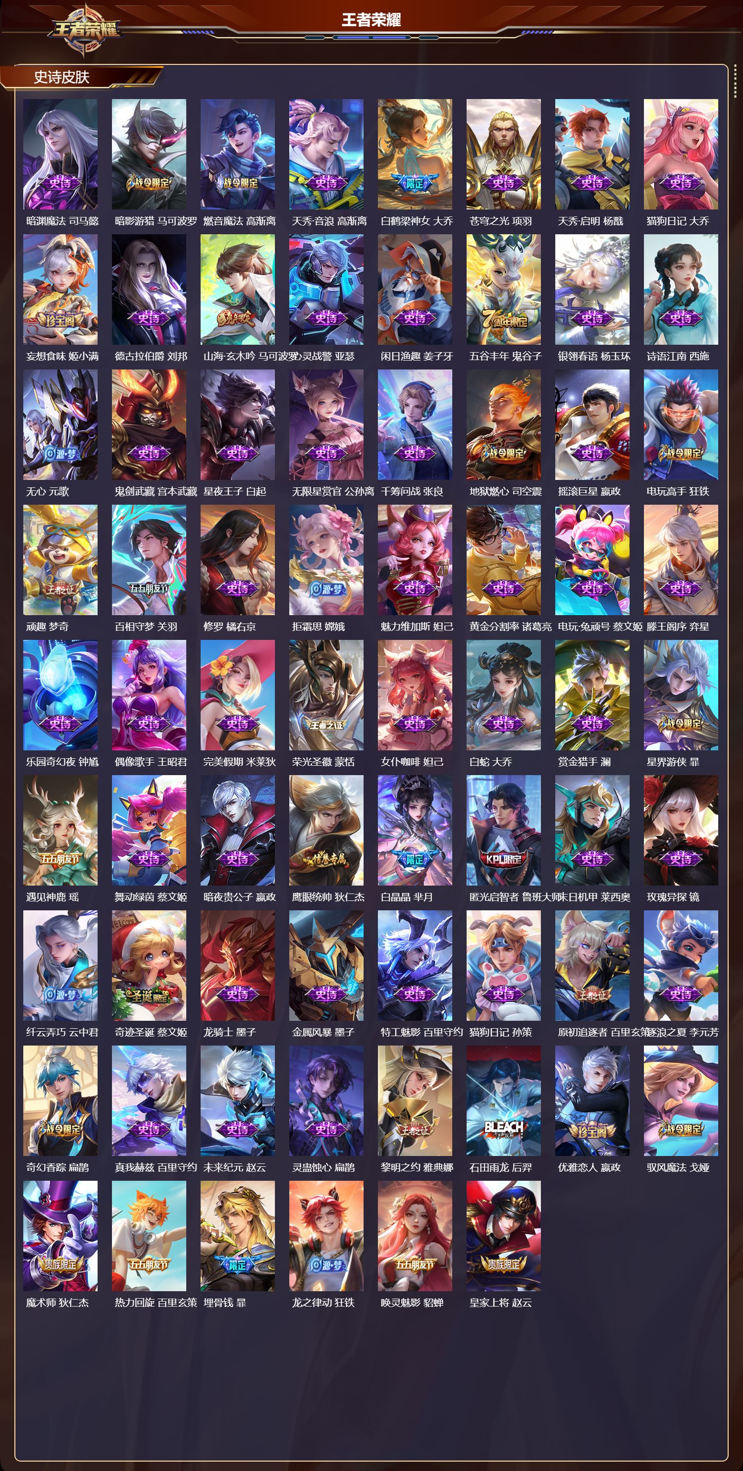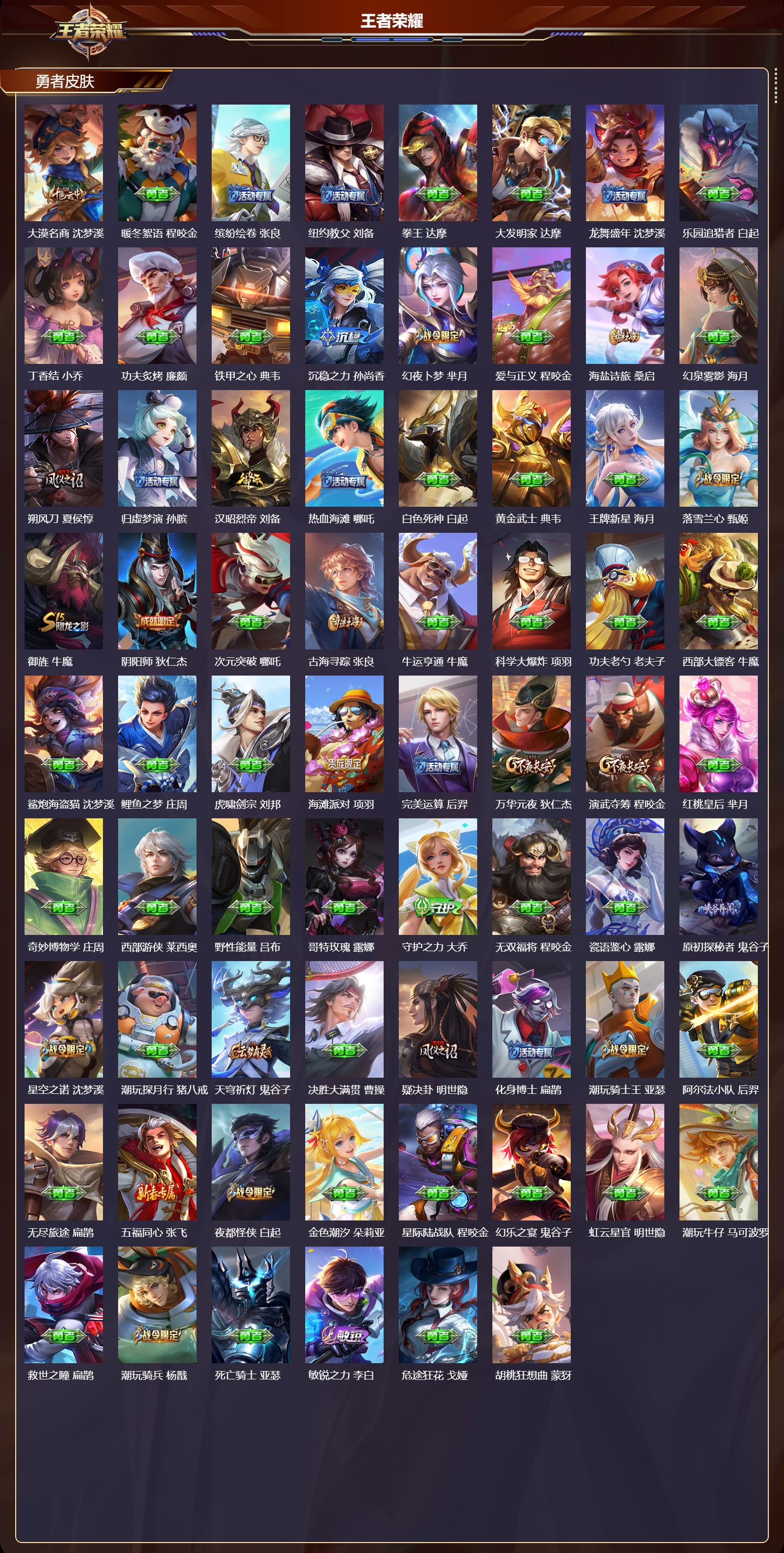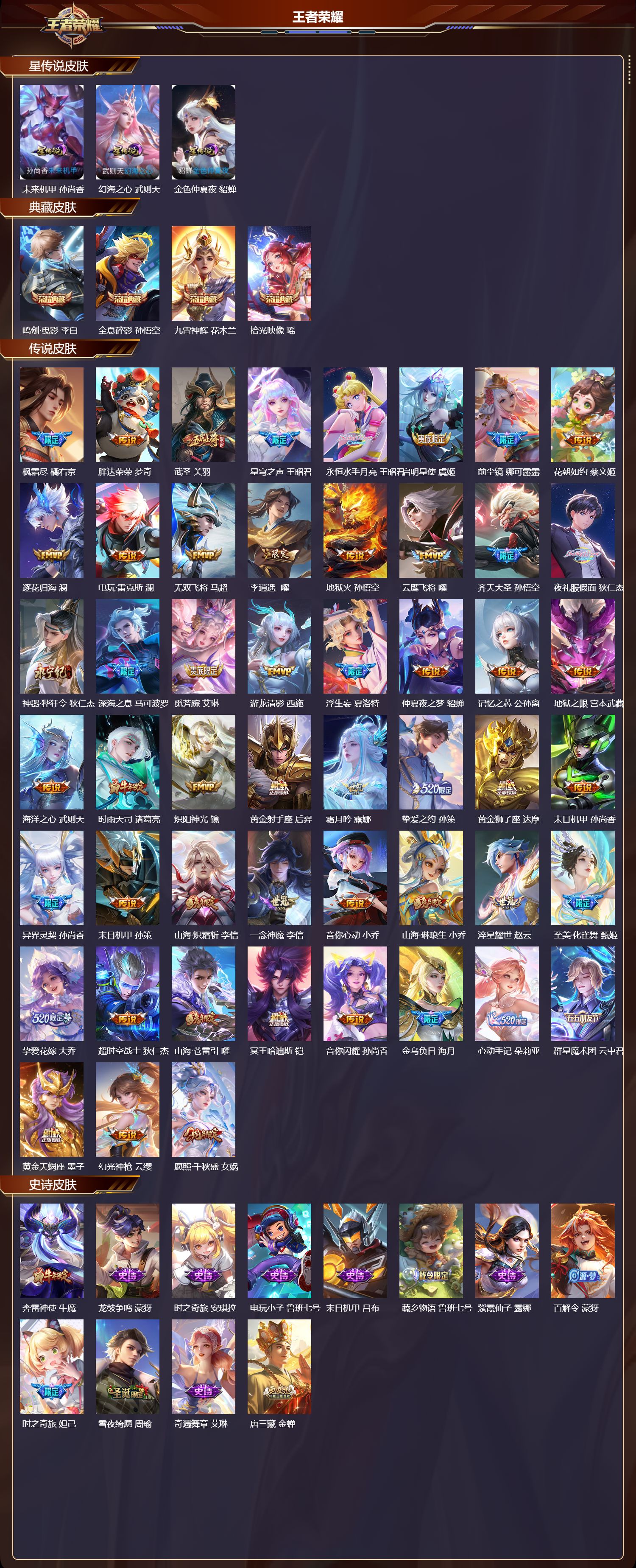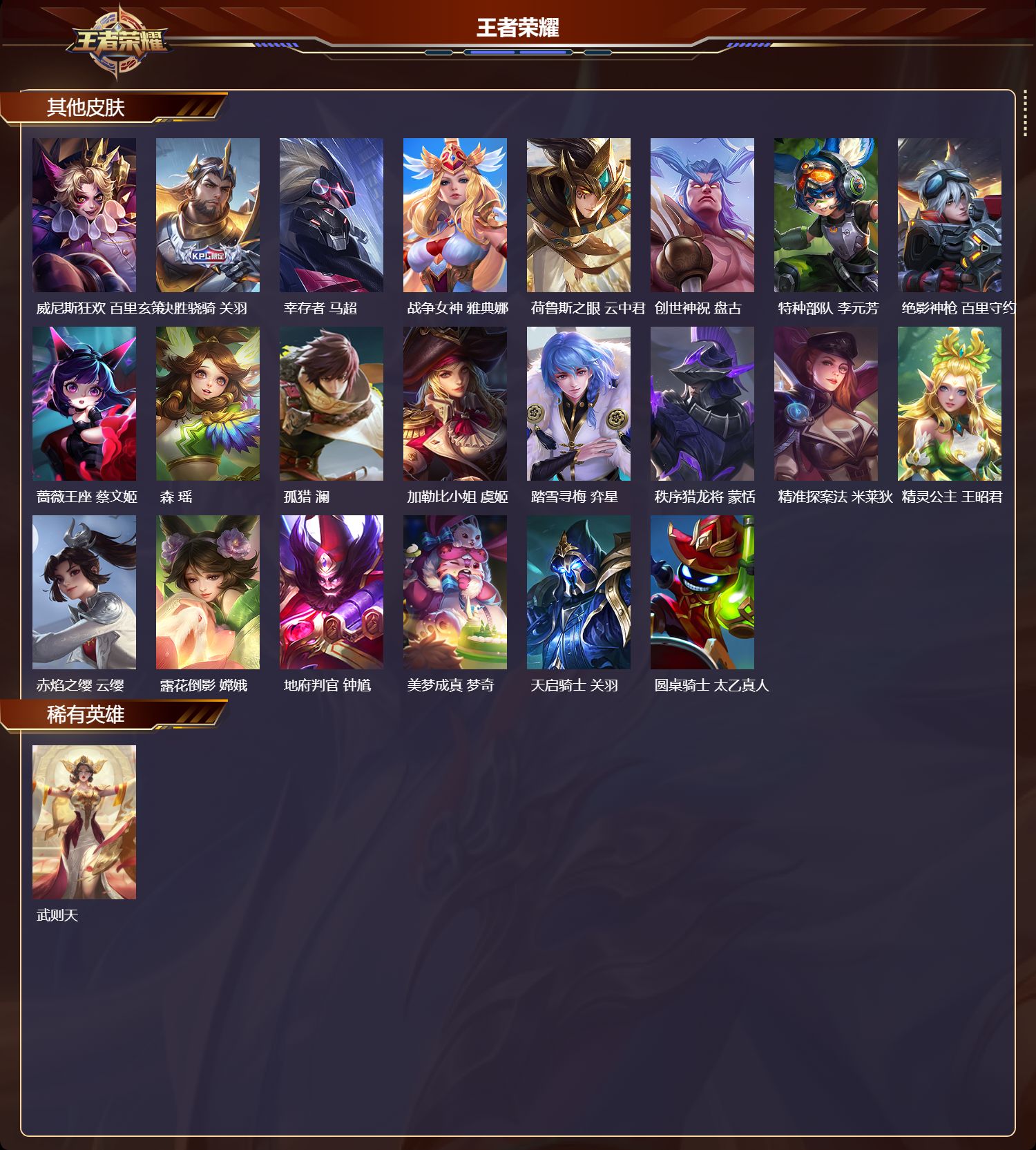 贵族等级:v8皮肤数:247传说品质7 情人节限定2 荣耀典藏1 生肖限定2 英雄数:120