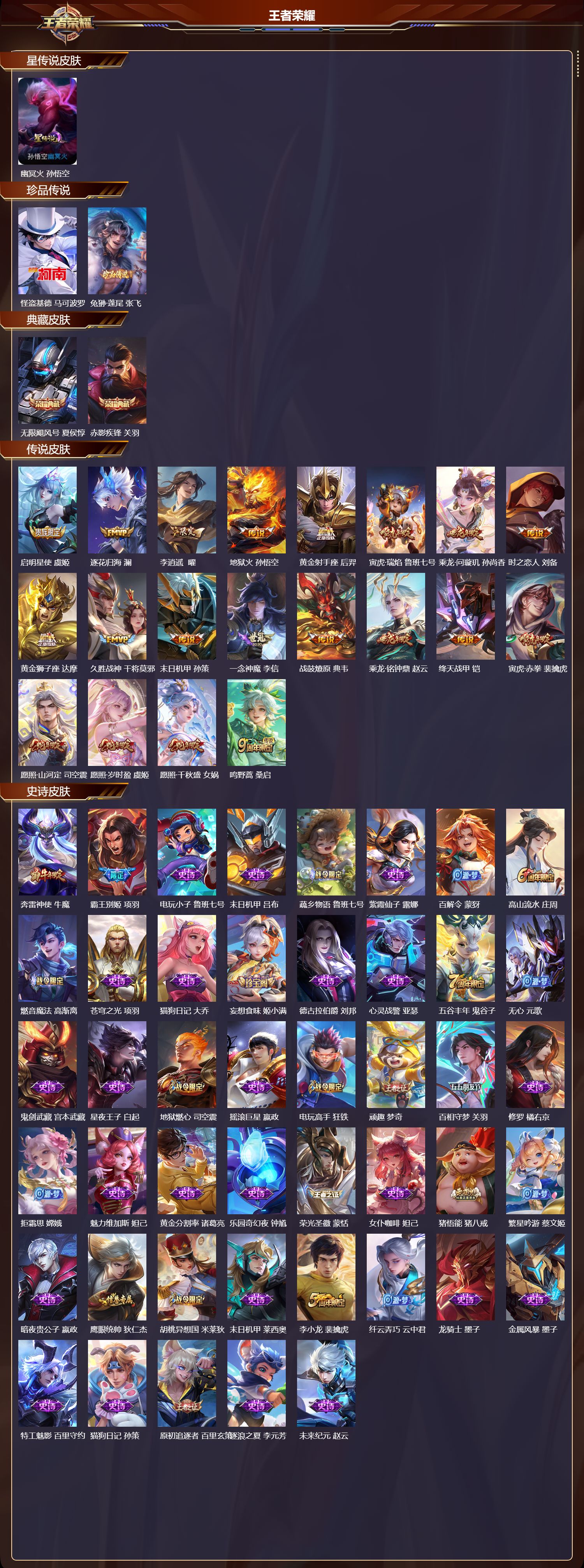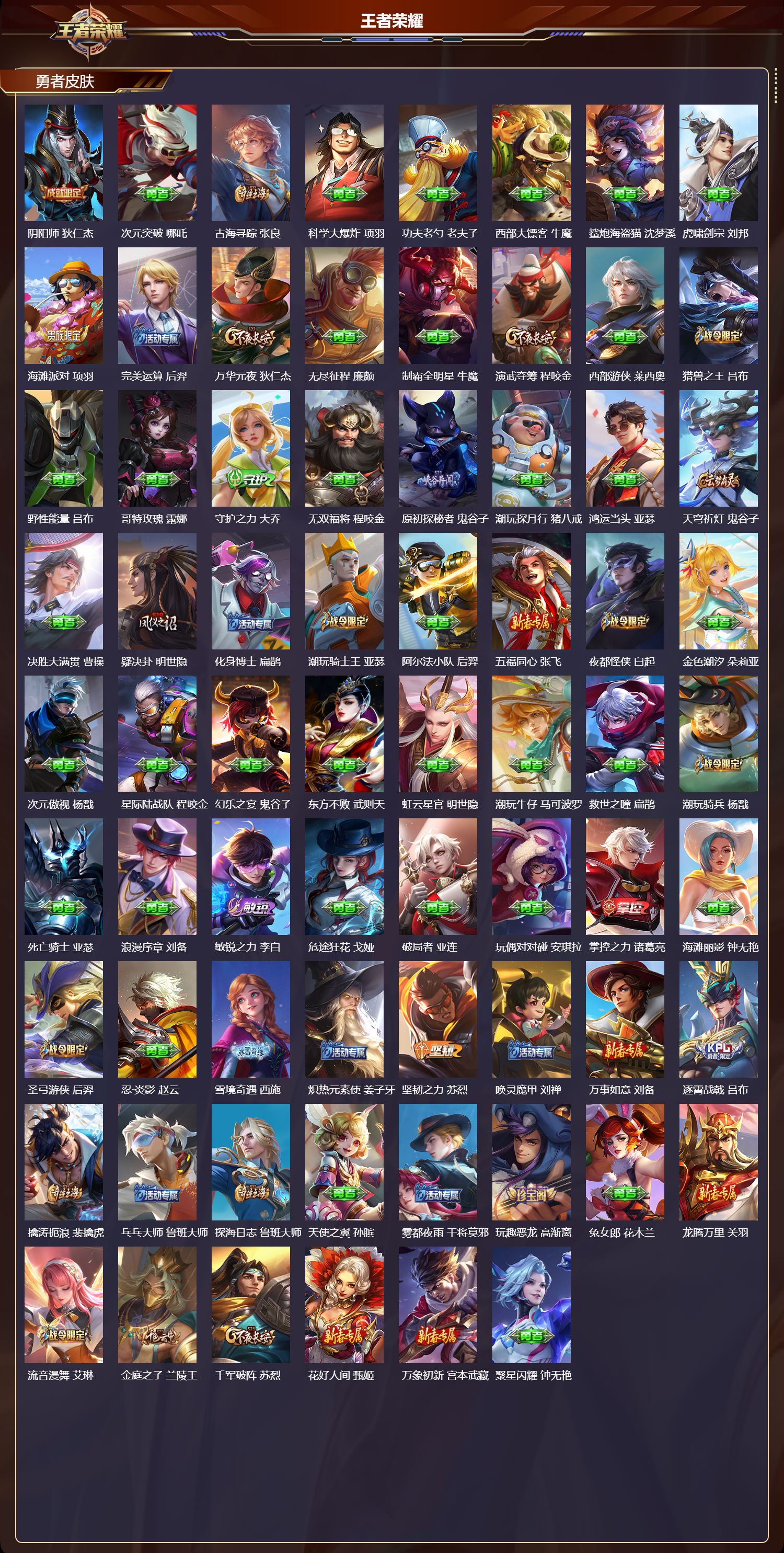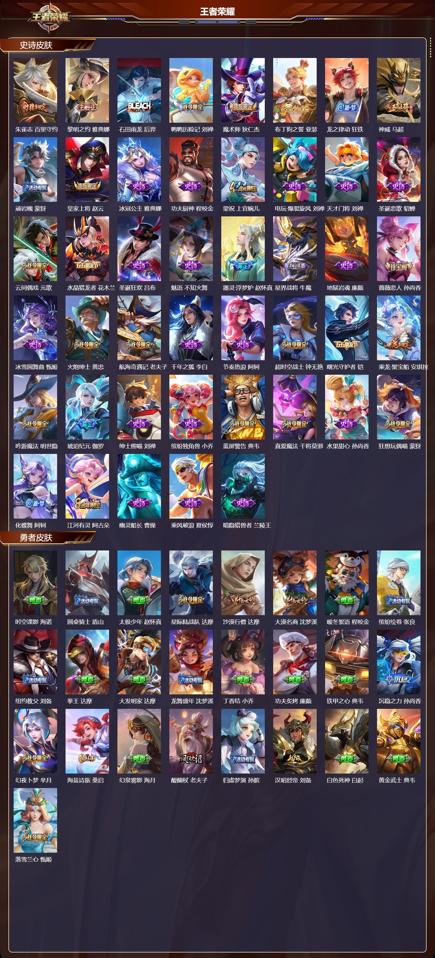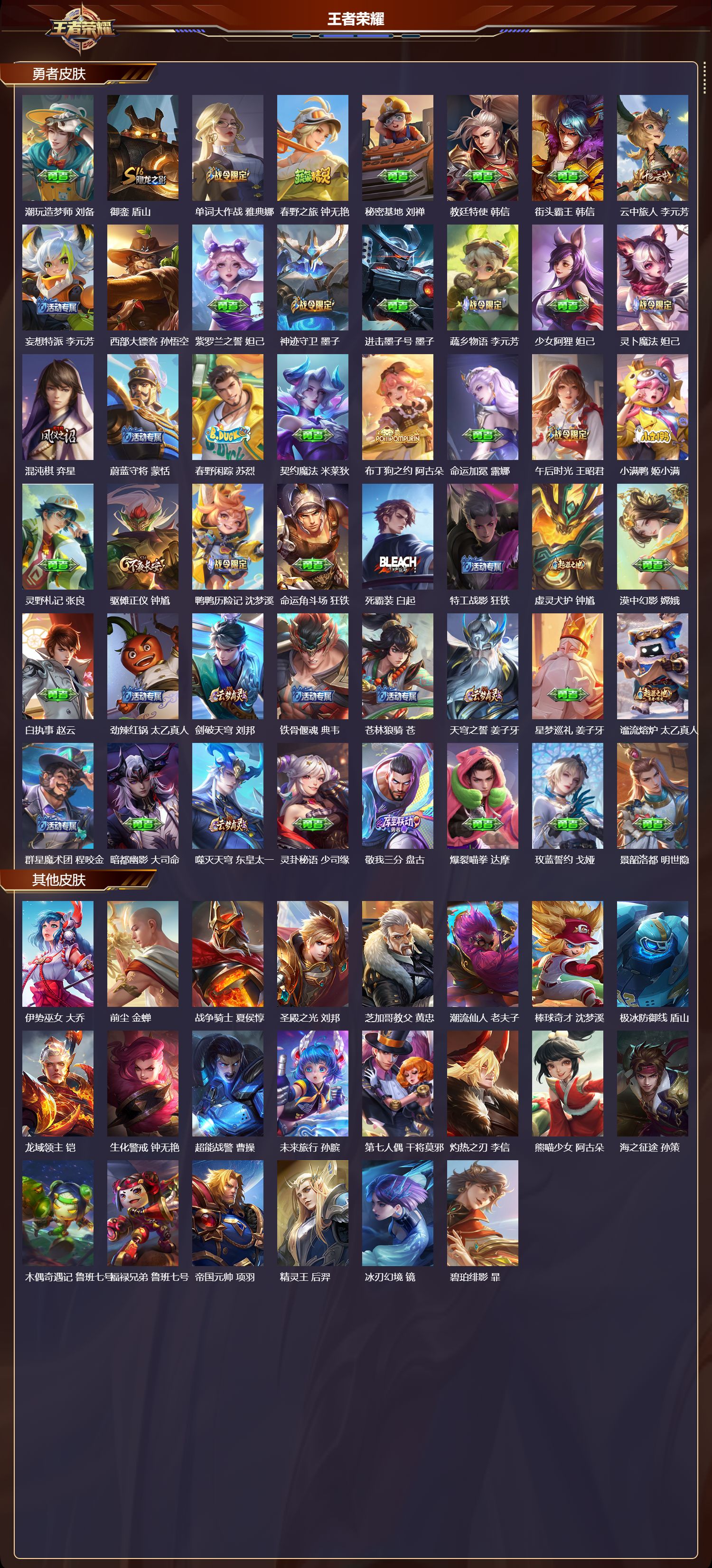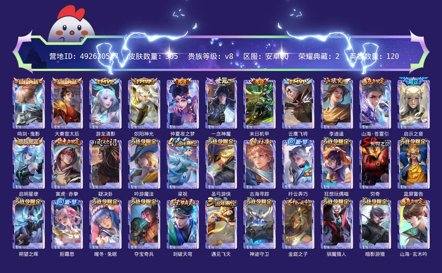 贵族等级:v8皮肤数:305生肖限定4 荣耀典藏2 传说品质11 英雄数:120