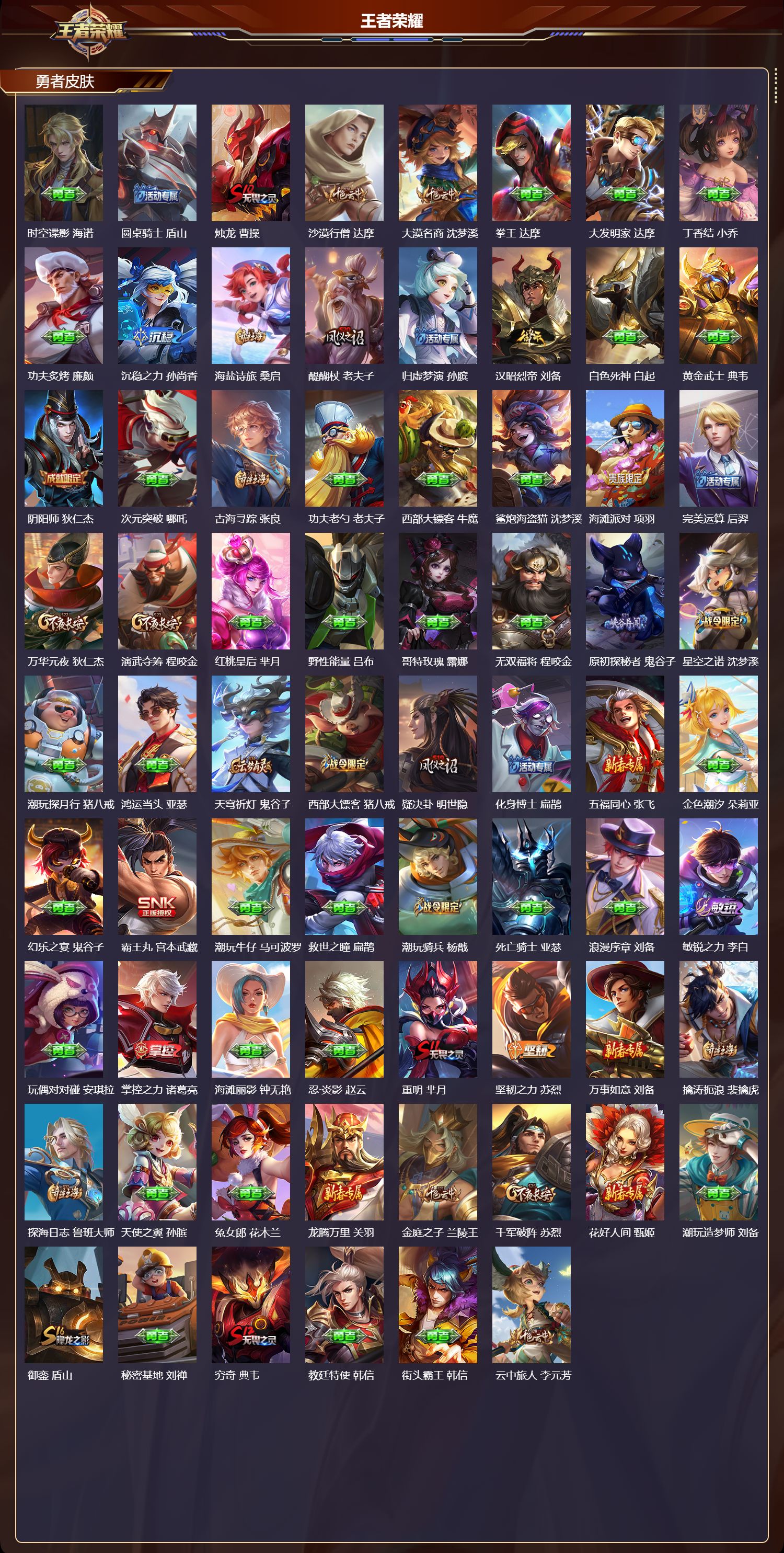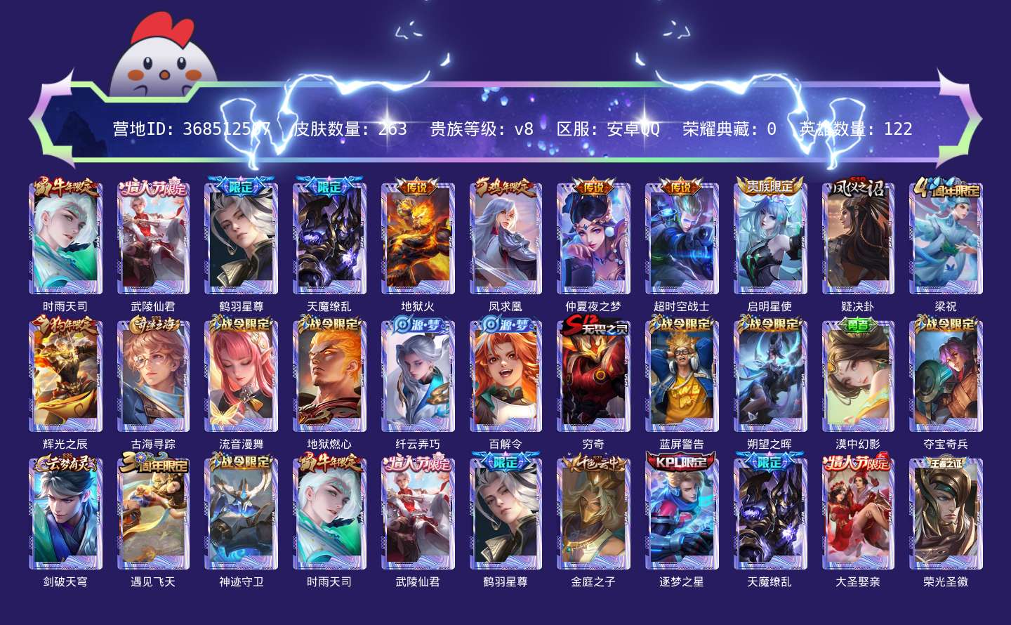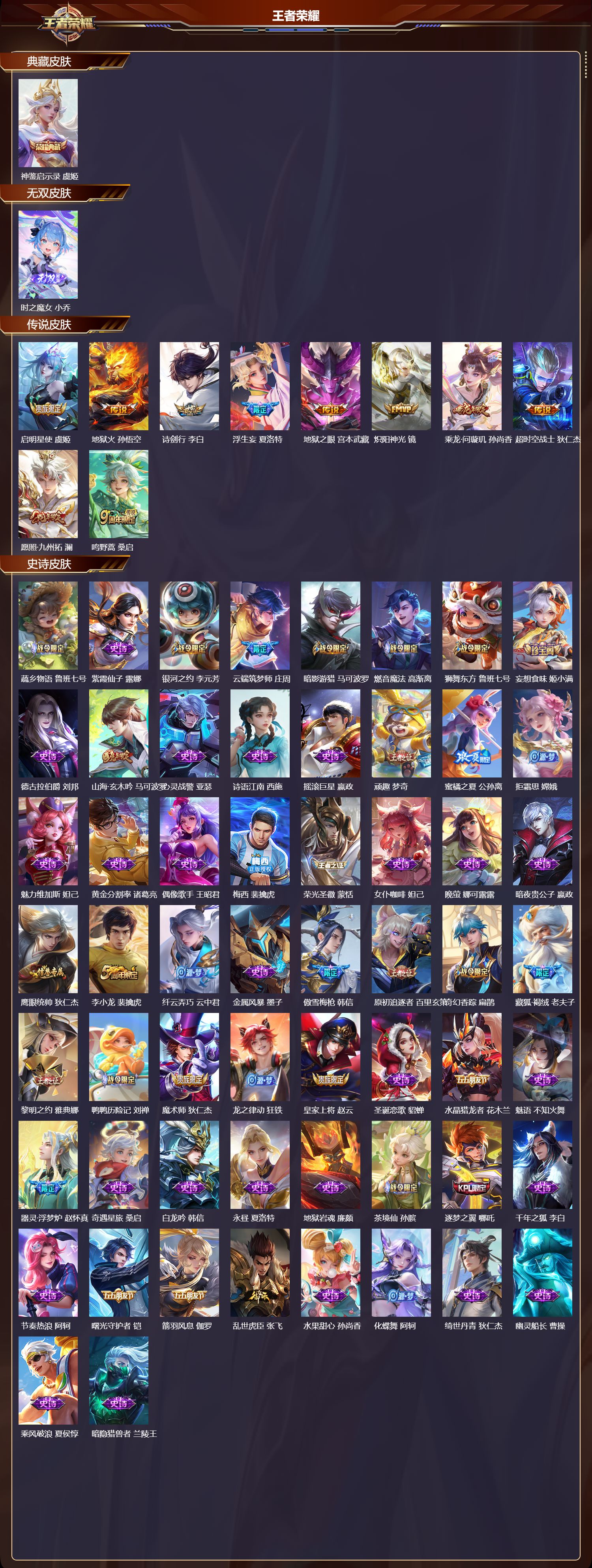 贵族等级:v8皮肤数:263生肖限定3 传说品质9 情人节限定2 英雄数:122