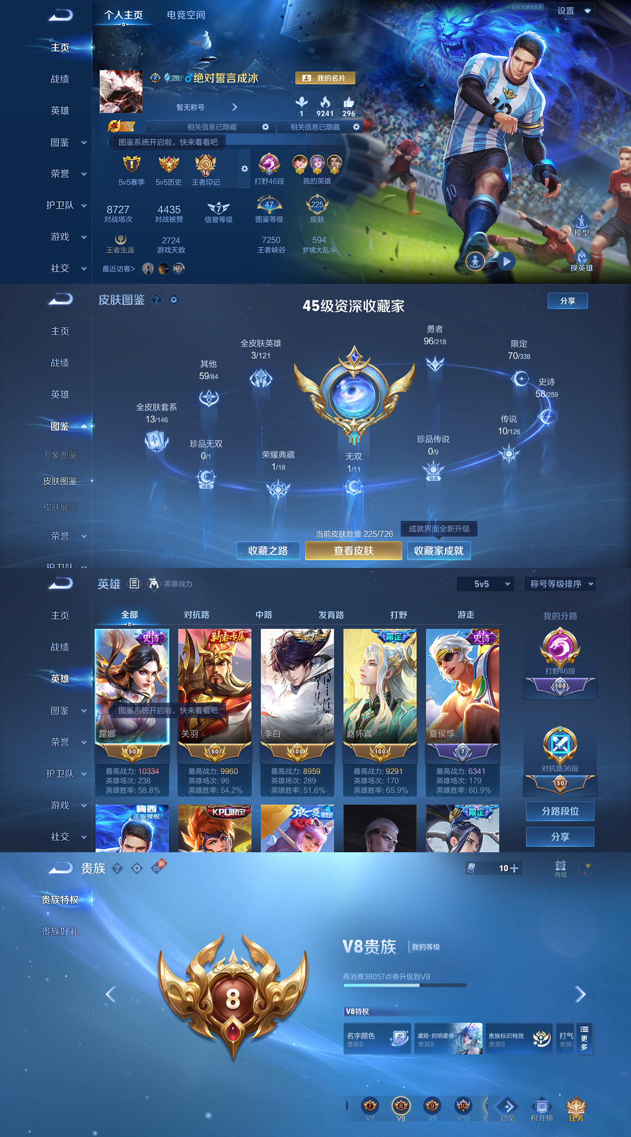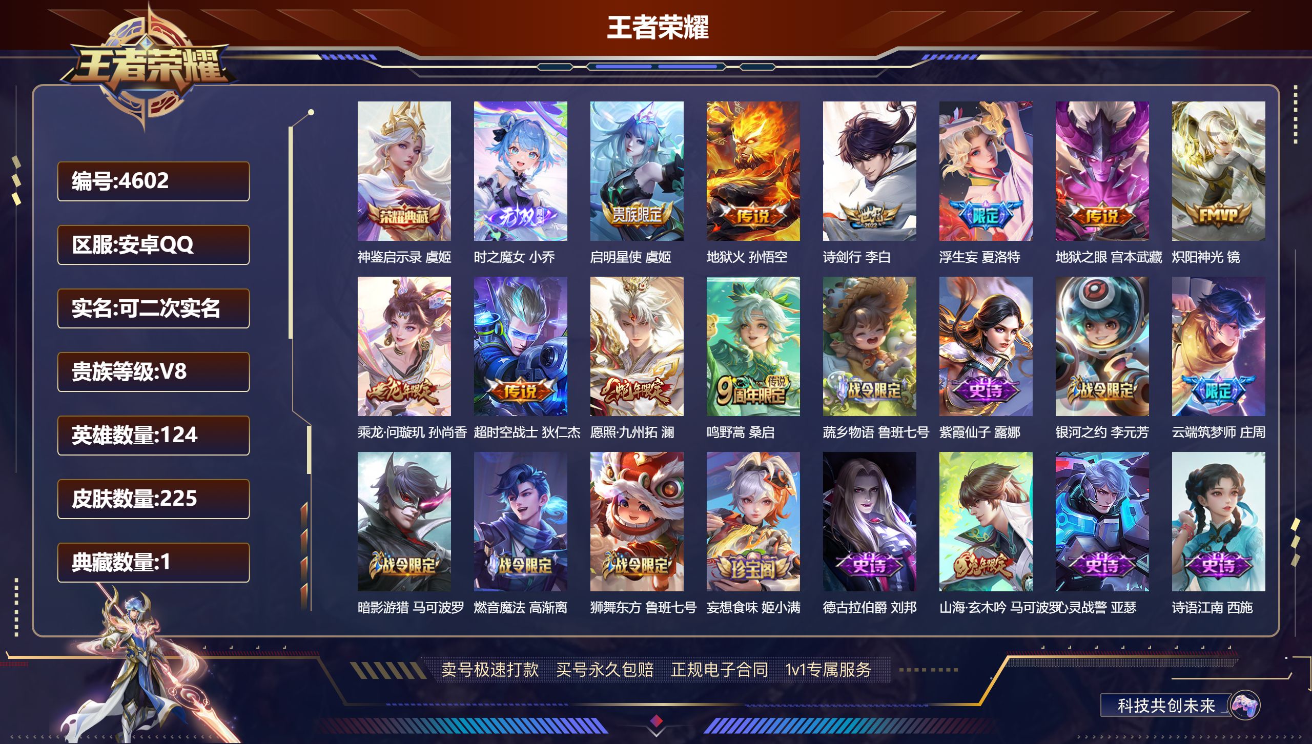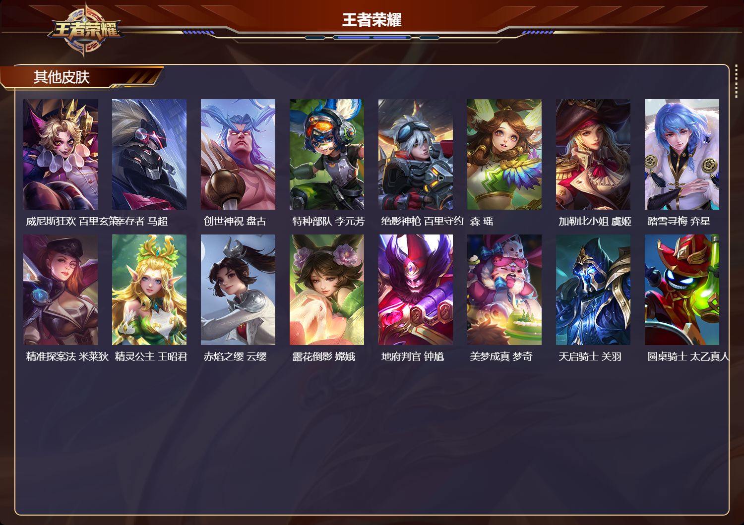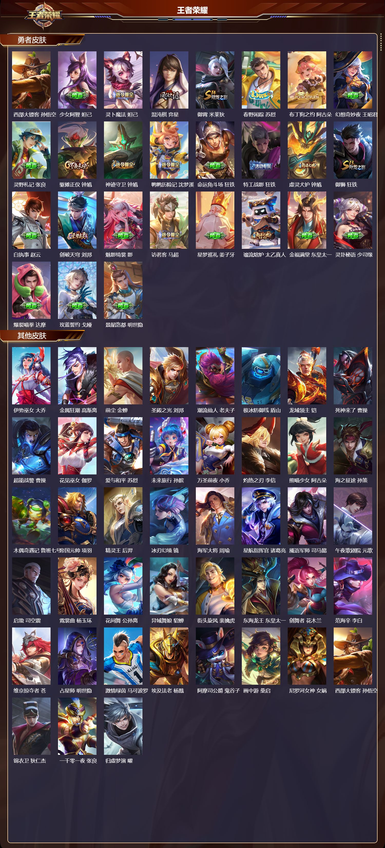 贵族等级:v8皮肤数:263生肖限定3 传说品质9 情人节限定2 英雄数:122