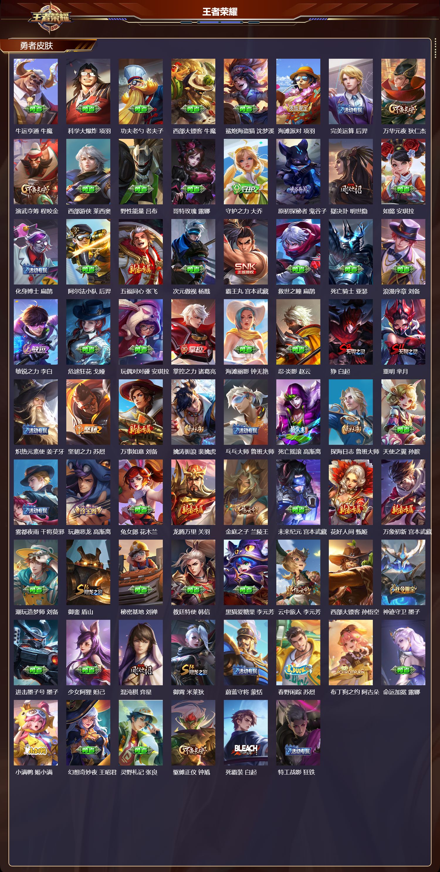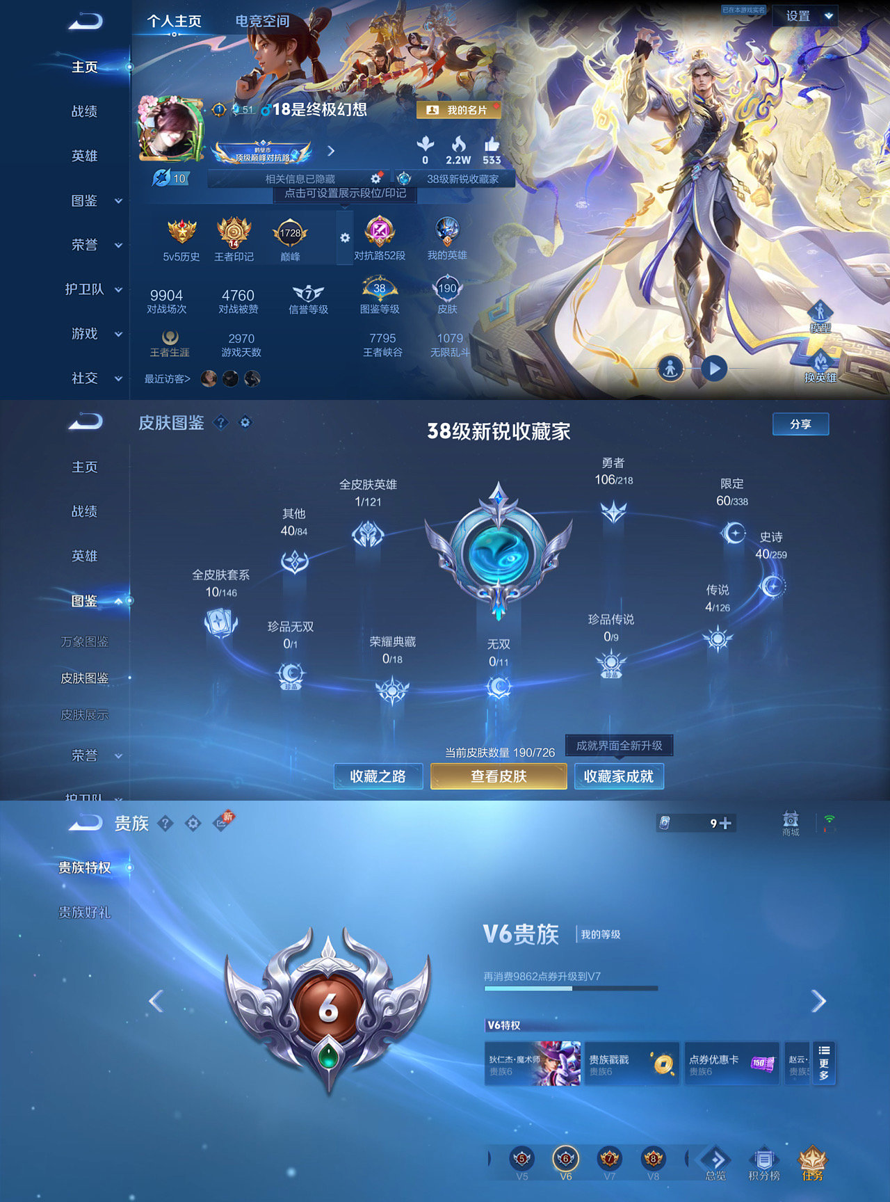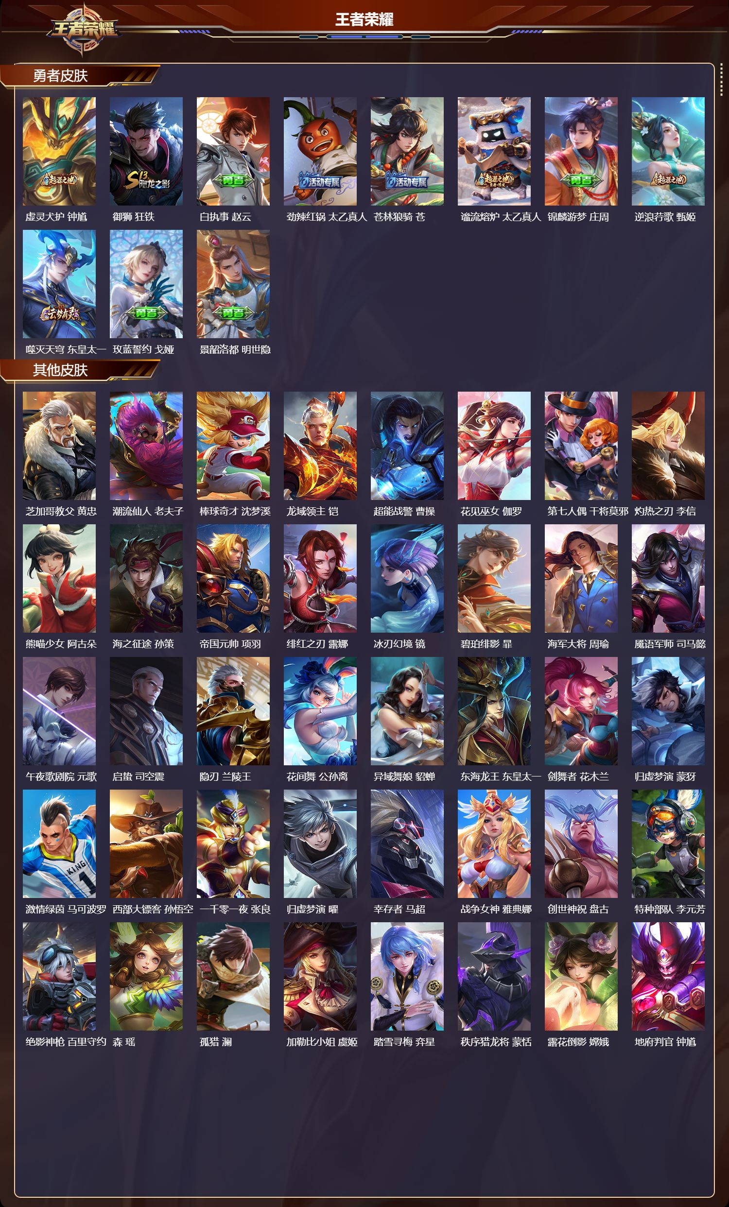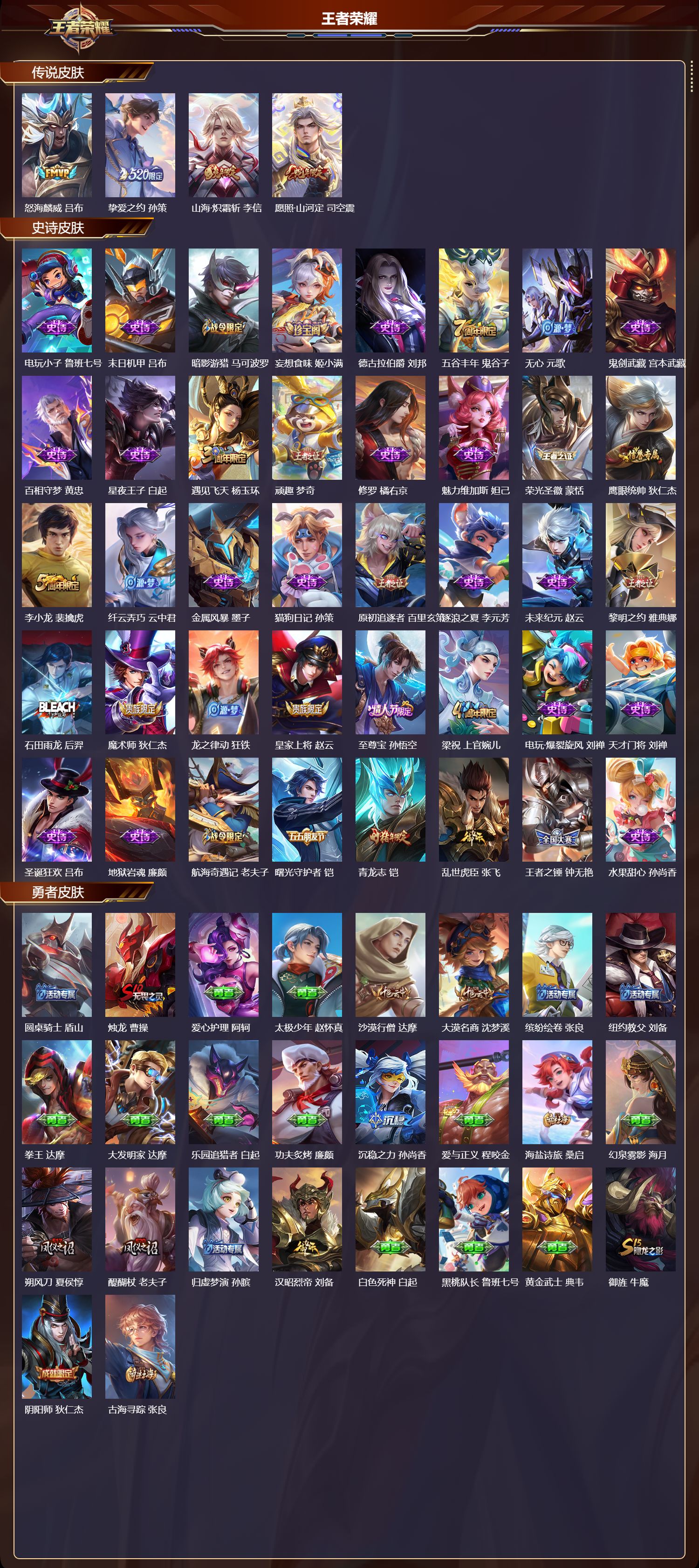贵族等级:v8皮肤数:250传说品质11 生肖限定6 情人节限定1 荣耀典藏1 英雄数:122