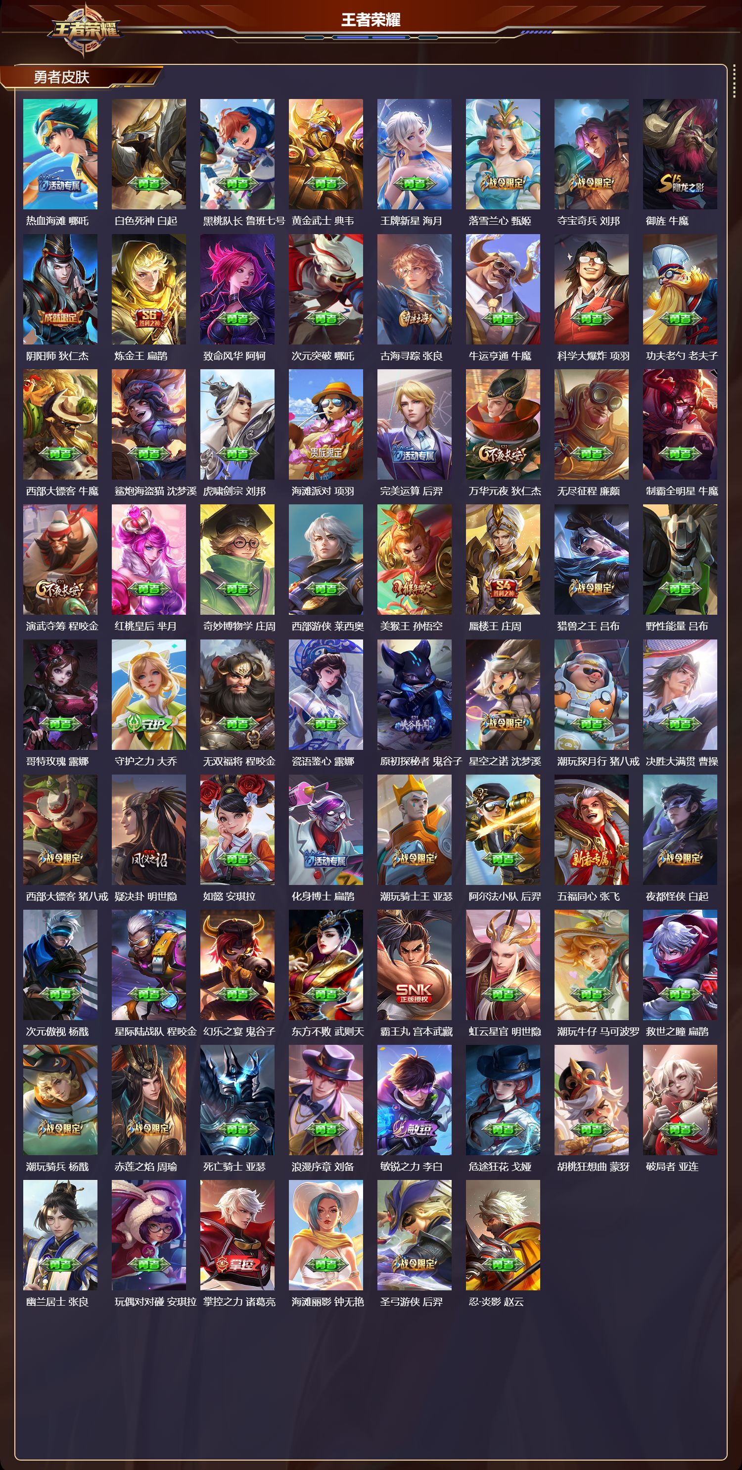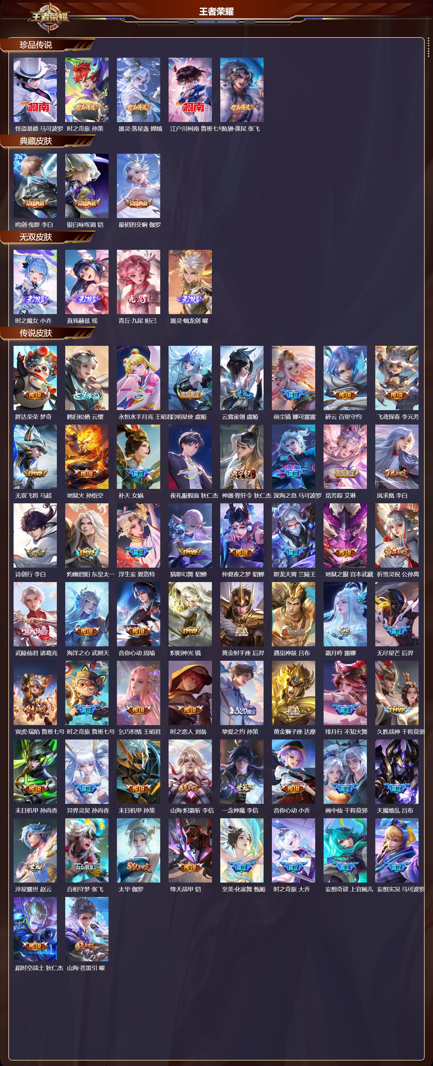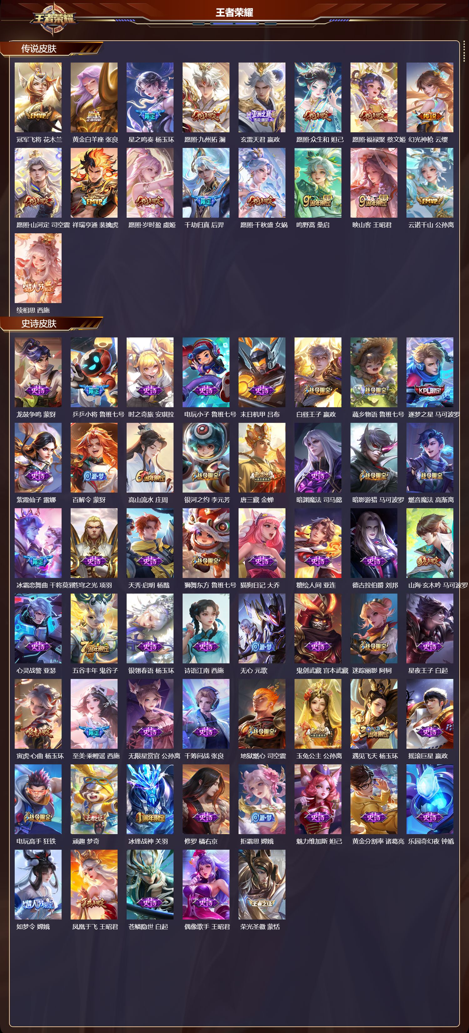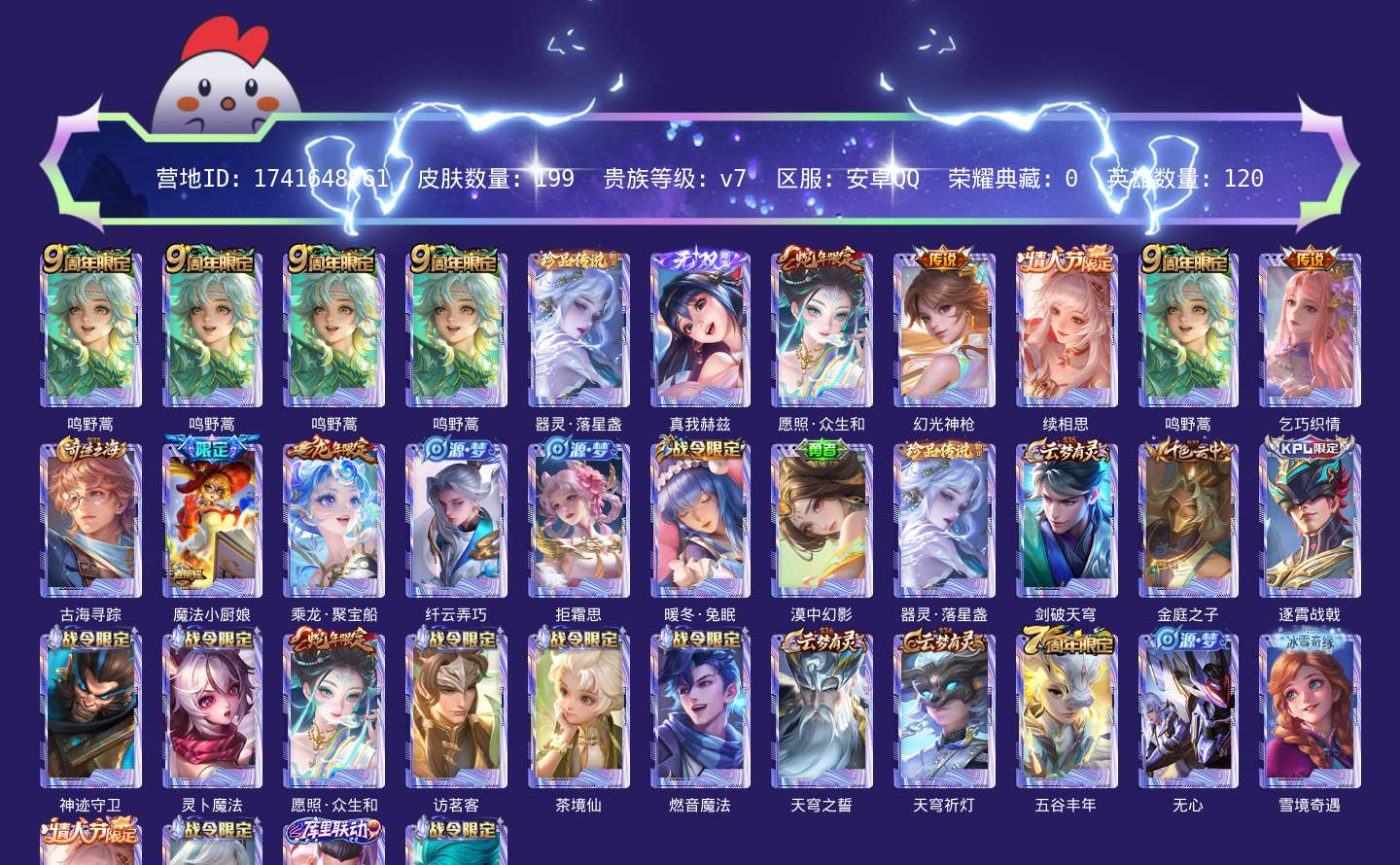 贵族等级:v7皮肤数:199生肖限定2 珍品传说1 传说品质5 无双1 情人节限定1 英雄数:120