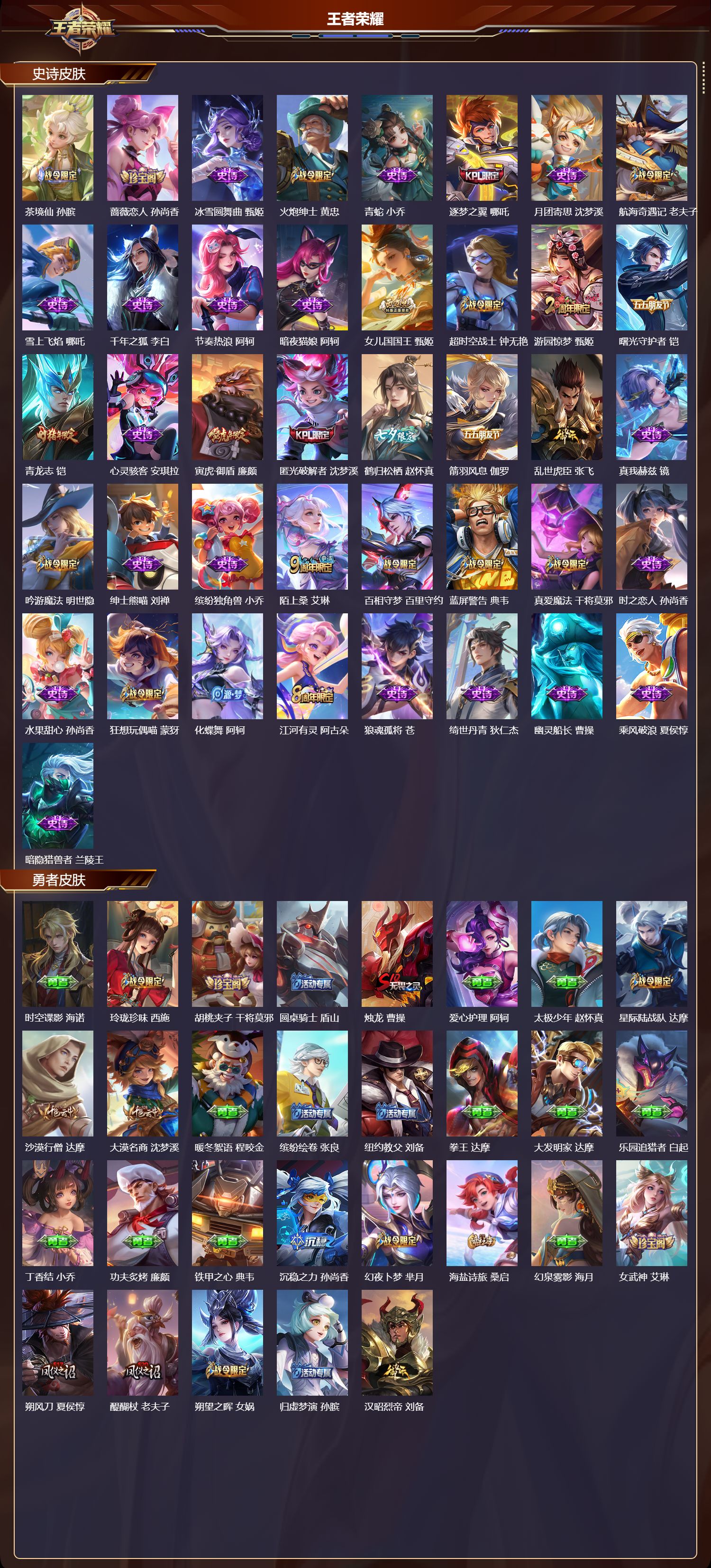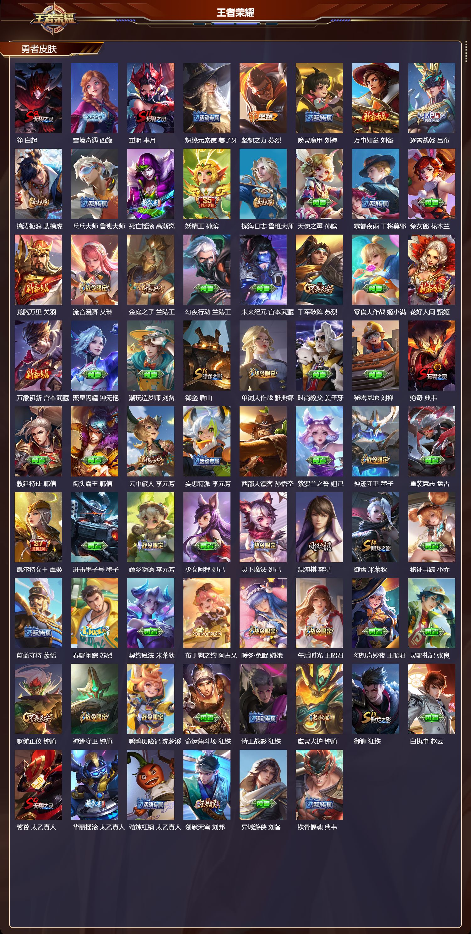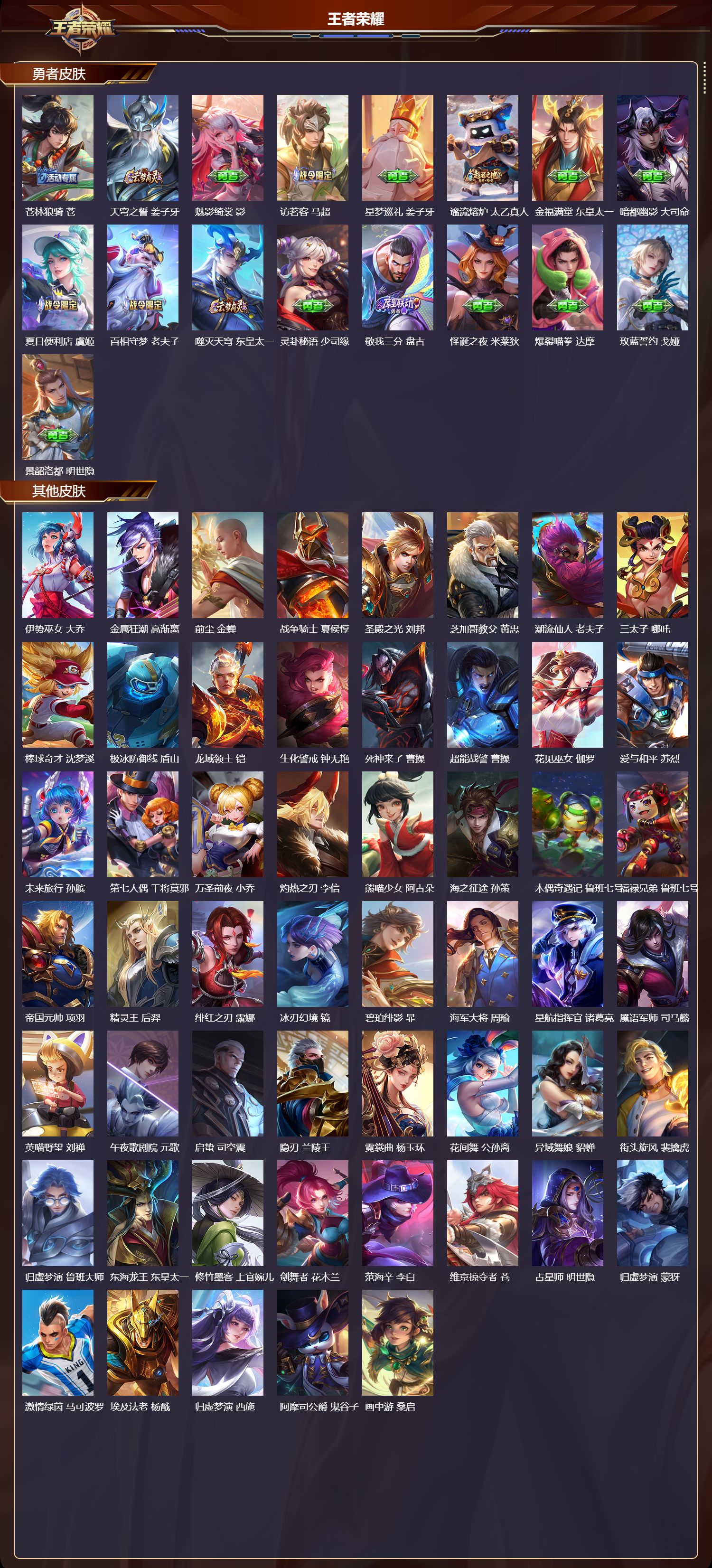贵族等级:v7皮肤数:199生肖限定2 珍品传说1 传说品质5 无双1 情人节限定1 英雄数:120