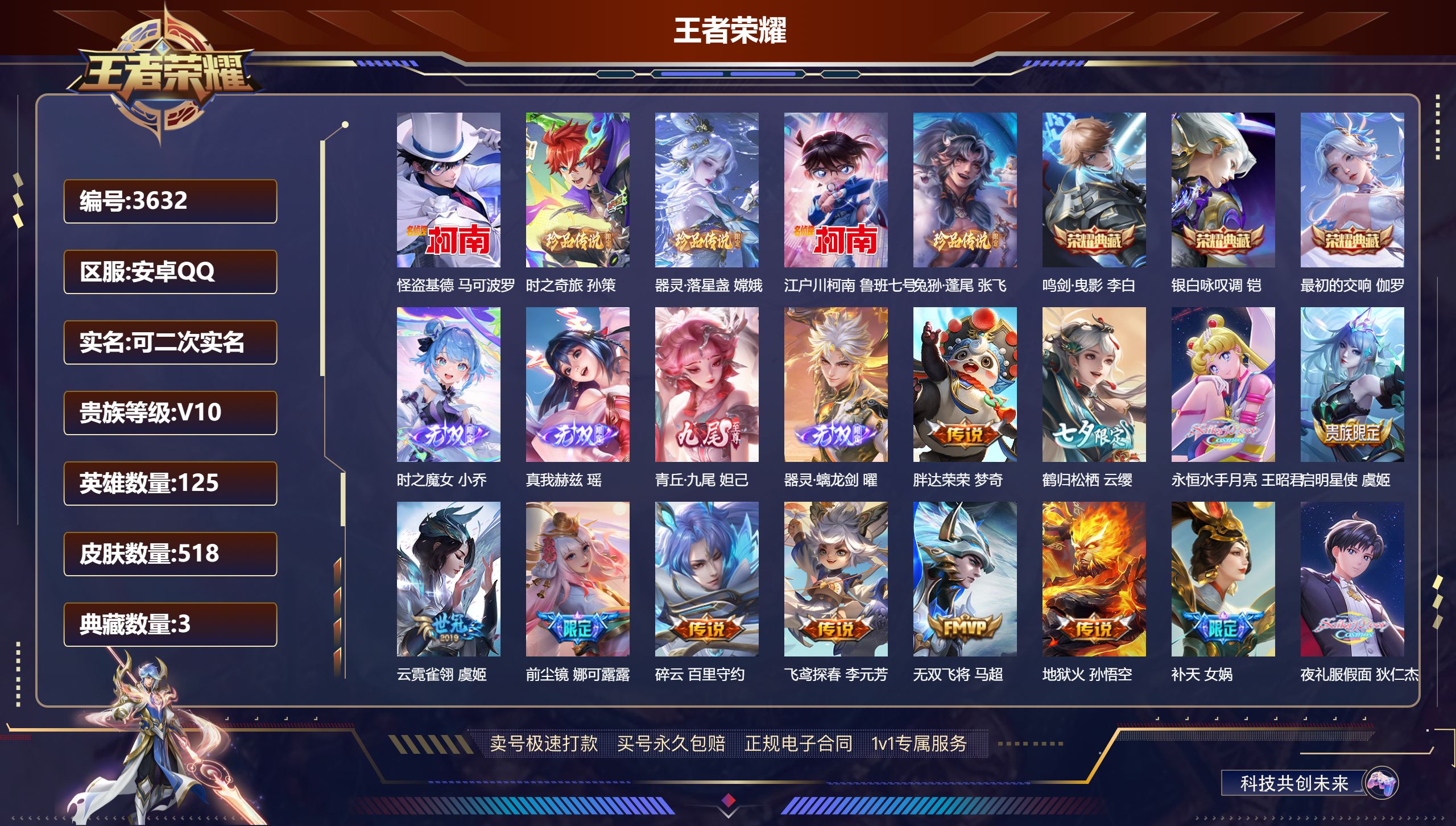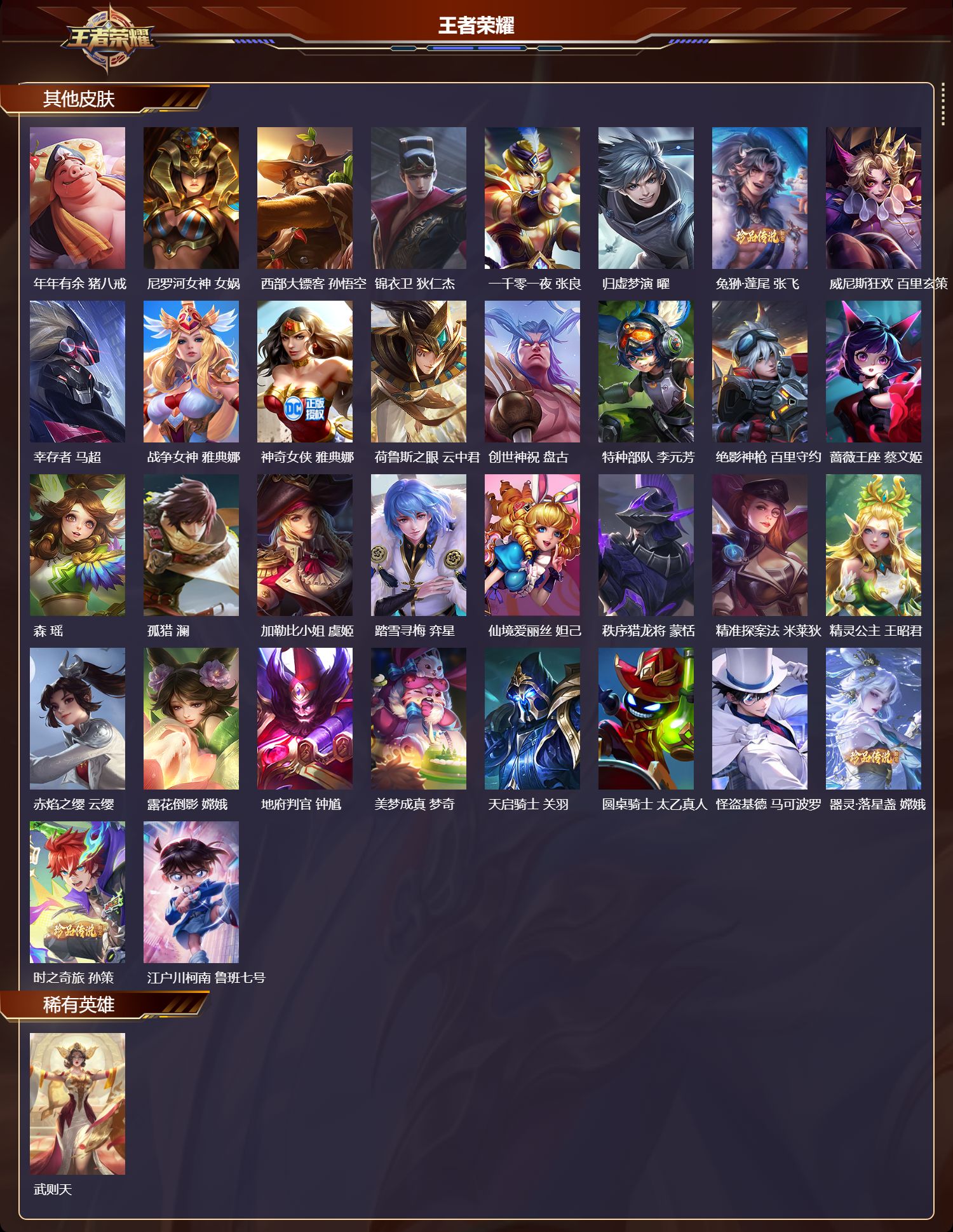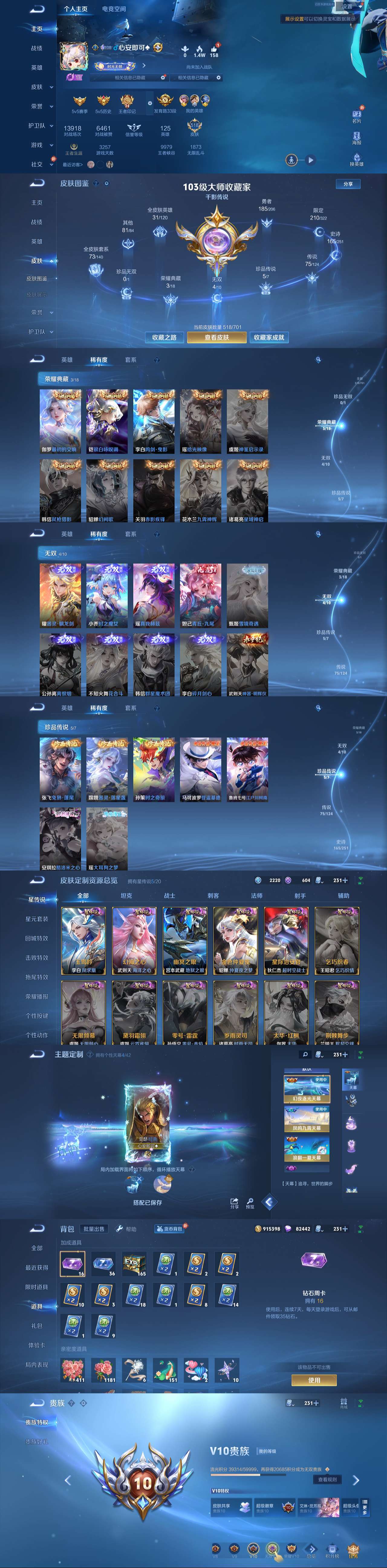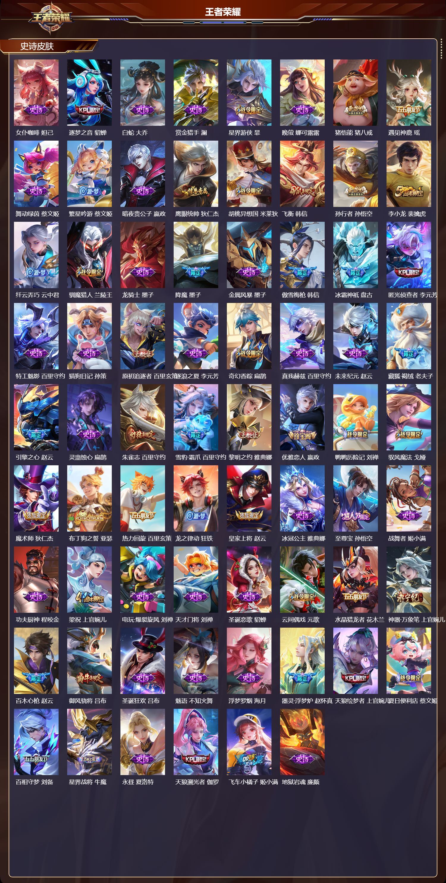 贵族等级:v7皮肤数:199生肖限定2 珍品传说1 传说品质5 无双1 情人节限定1 英雄数:120