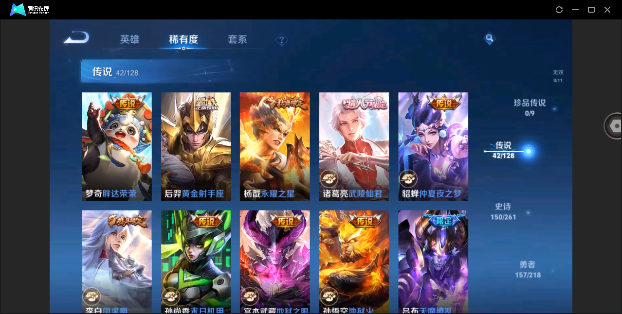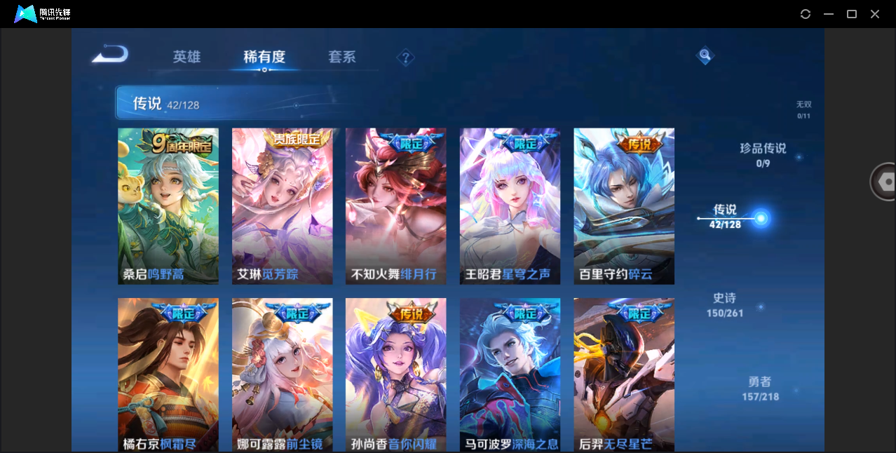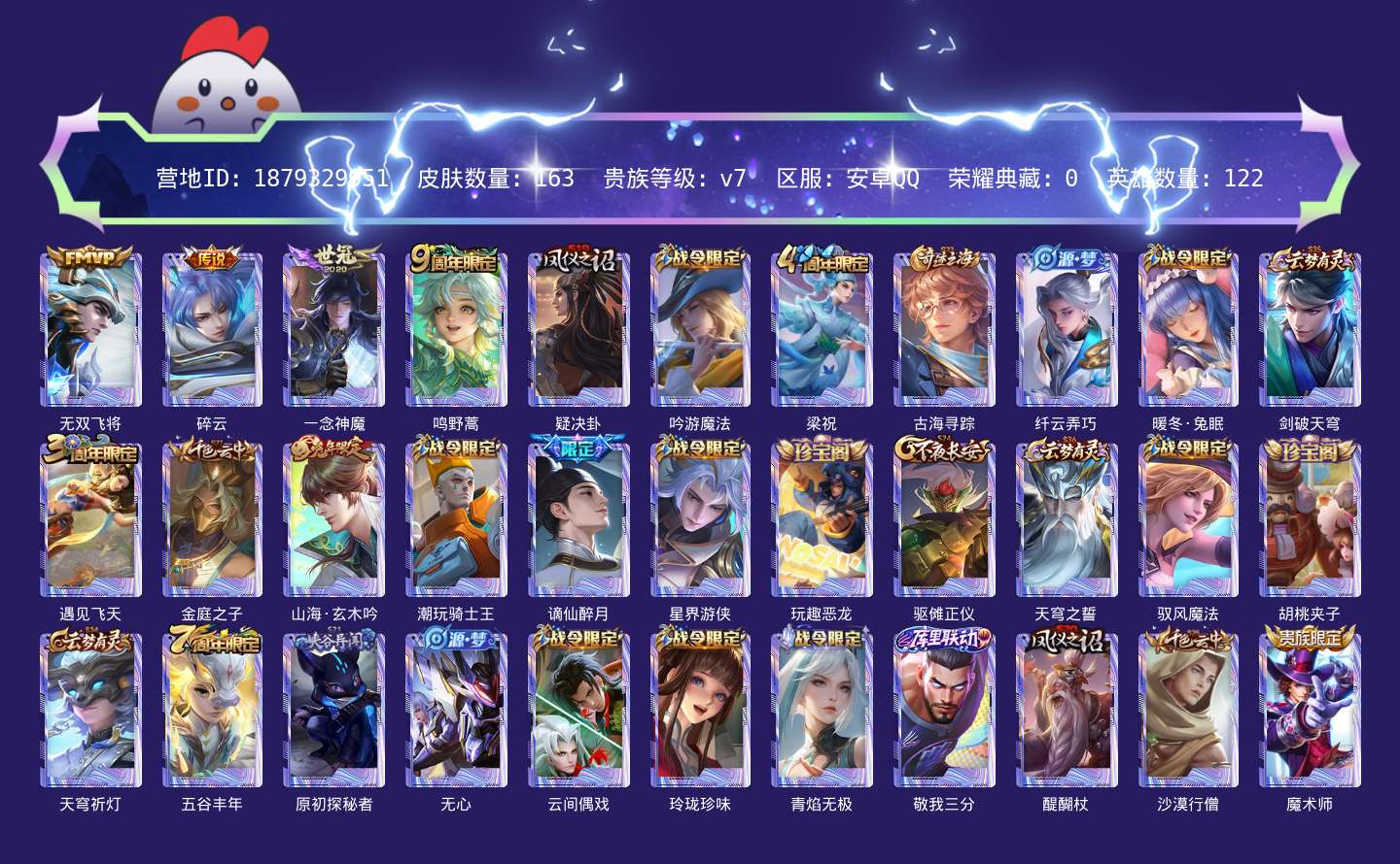 贵族等级:v7皮肤数:163生肖限定2 传说品质4 英雄数:122