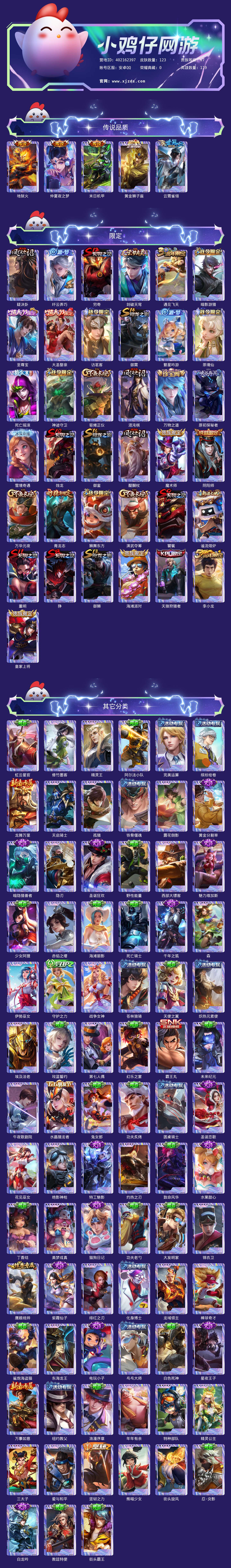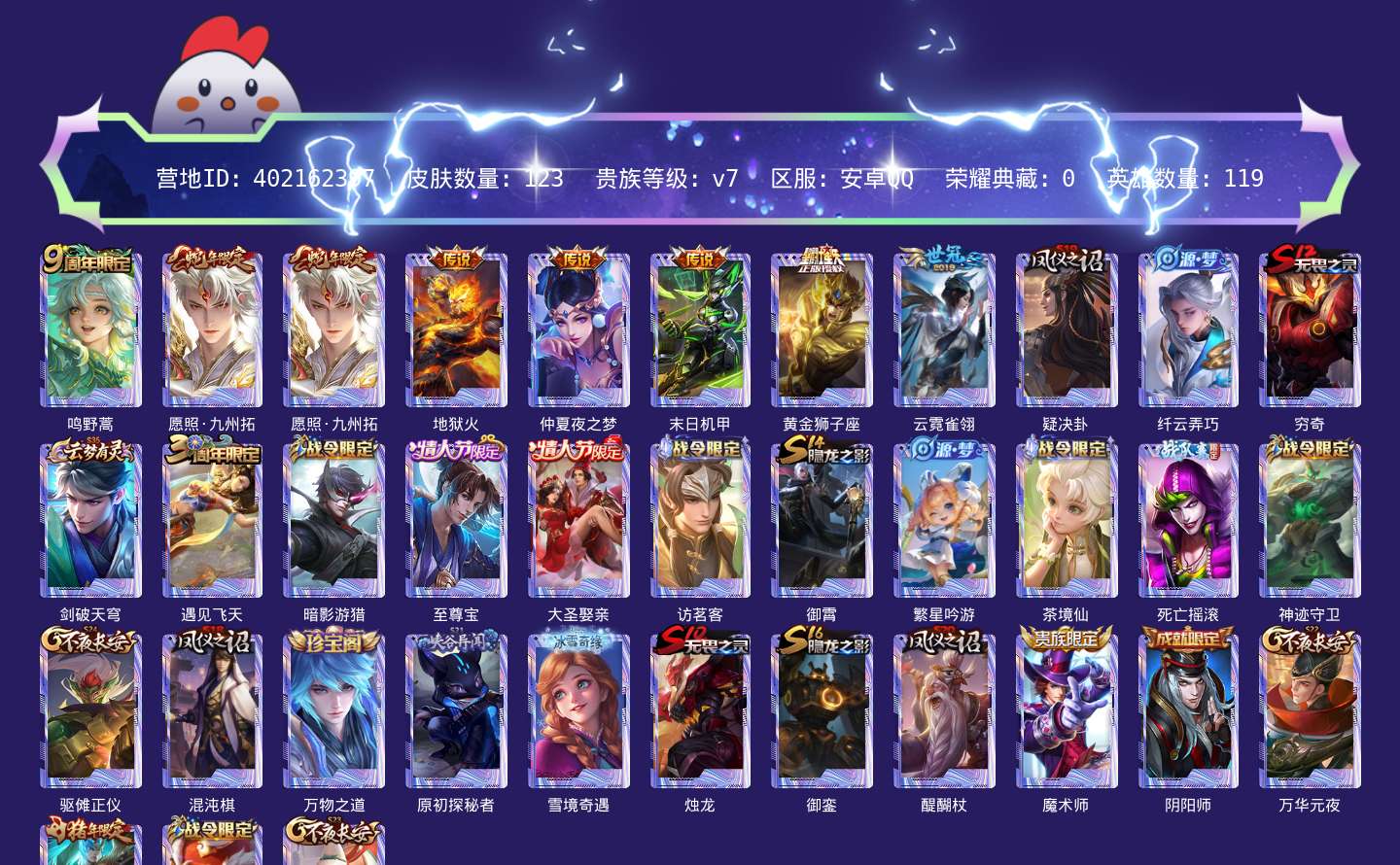 安卓Q-【1星传说5传说】123皮肤-119英雄 【传说皮肤】 黄金狮子座 仲夏夜之梦 末日机甲 地狱火 云霓雀翎 【史诗皮肤】 茶境仙 青龙志 电玩小子 天狼狩猎者 大圣娶亲 至尊宝 完美运算 繁星吟游 魅力维加斯 魔术师 鹰眼统帅 圣诞恋歌 白龙吟 水晶猎龙者 暗隐猎兽者 千年之狐 紫霞仙子 狮舞东方 圣诞狂欢 暗影游猎 李小龙 猫狗日记 水果甜心 遇见飞天 纤云弄巧 皇家上将 黄金分割率