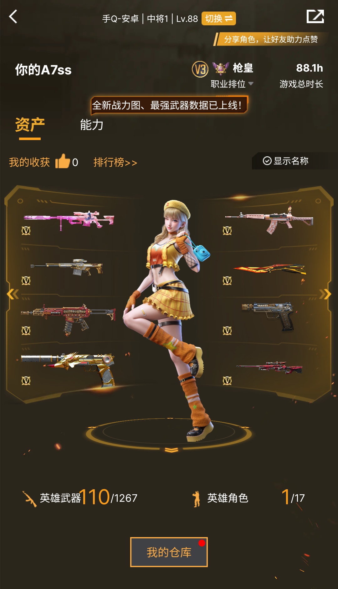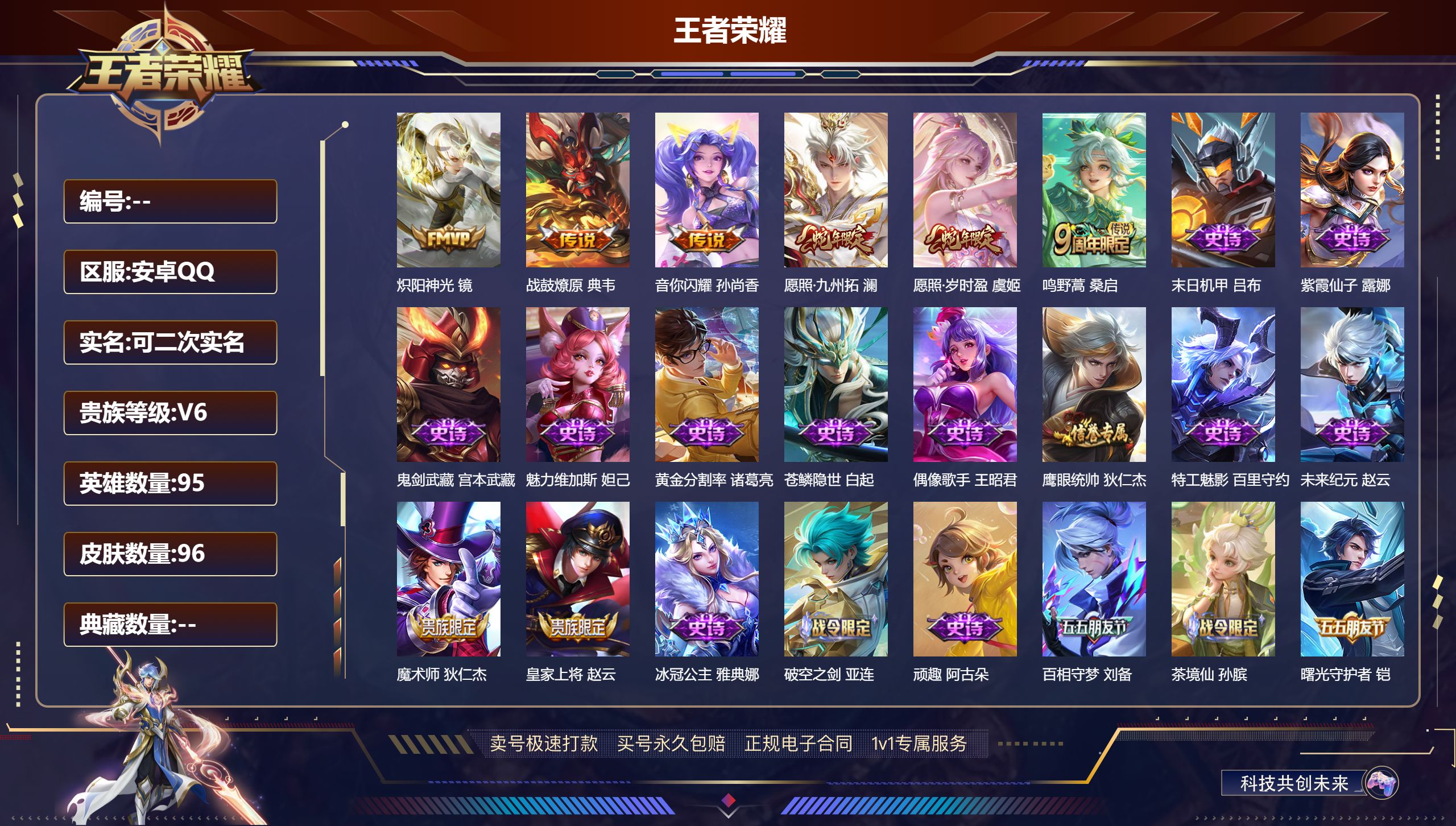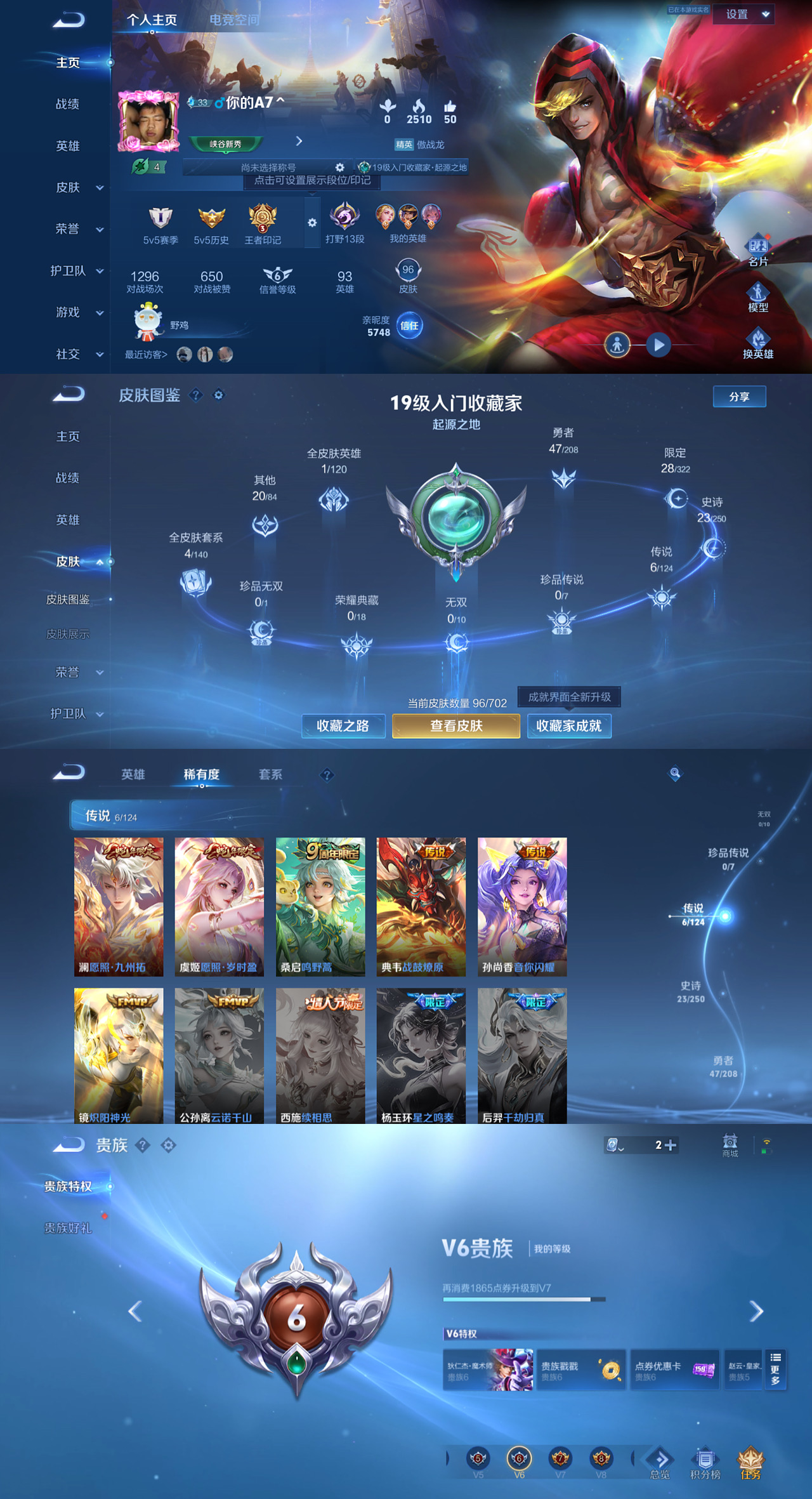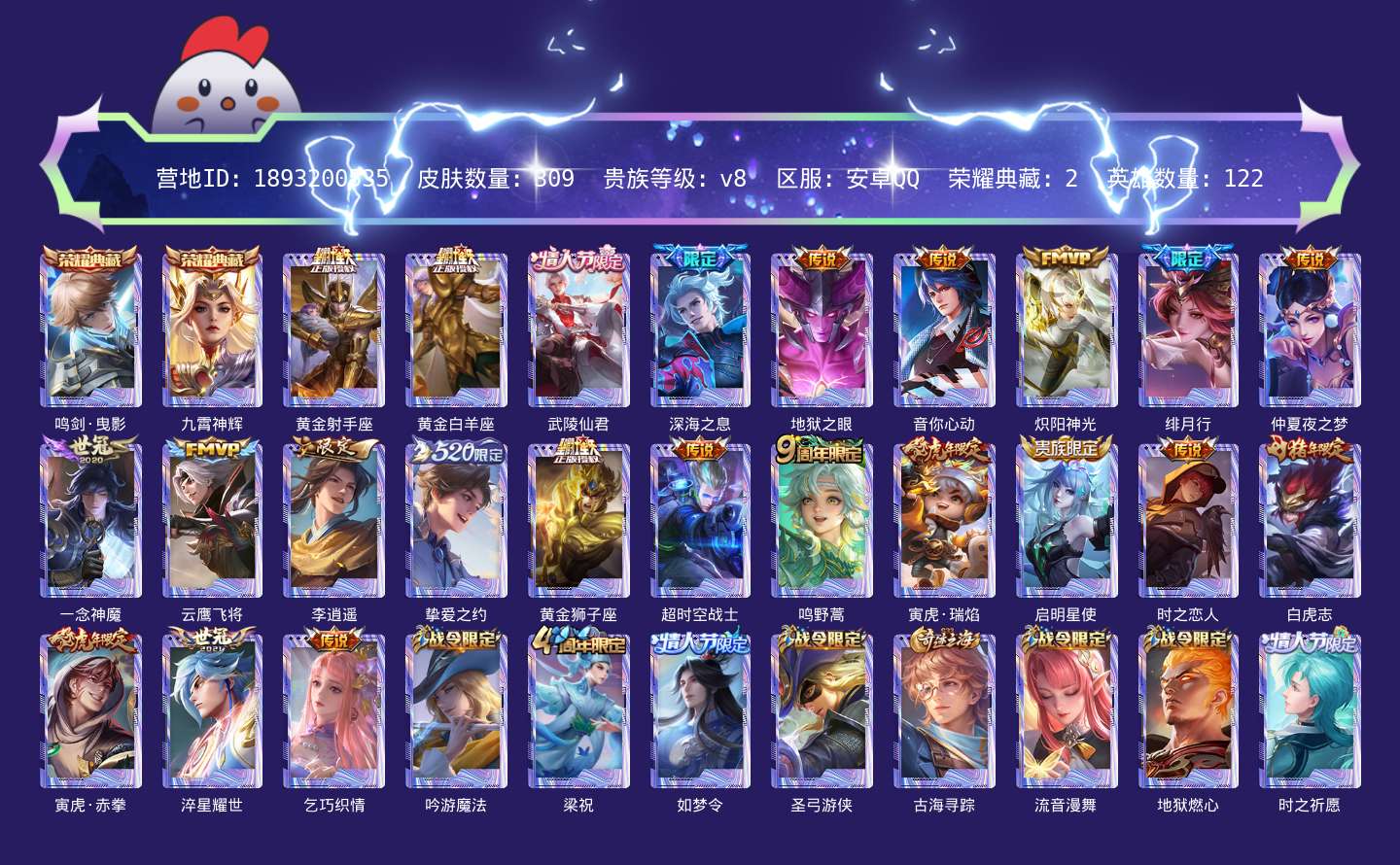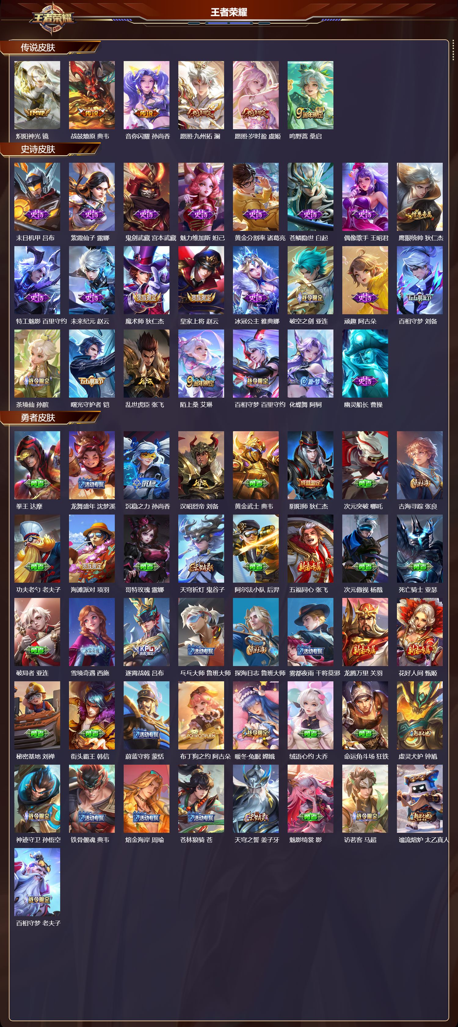 贵族等级:v8皮肤数:309传说品质23 情人节限定5 荣耀典藏2 生肖限定5 英雄数:122