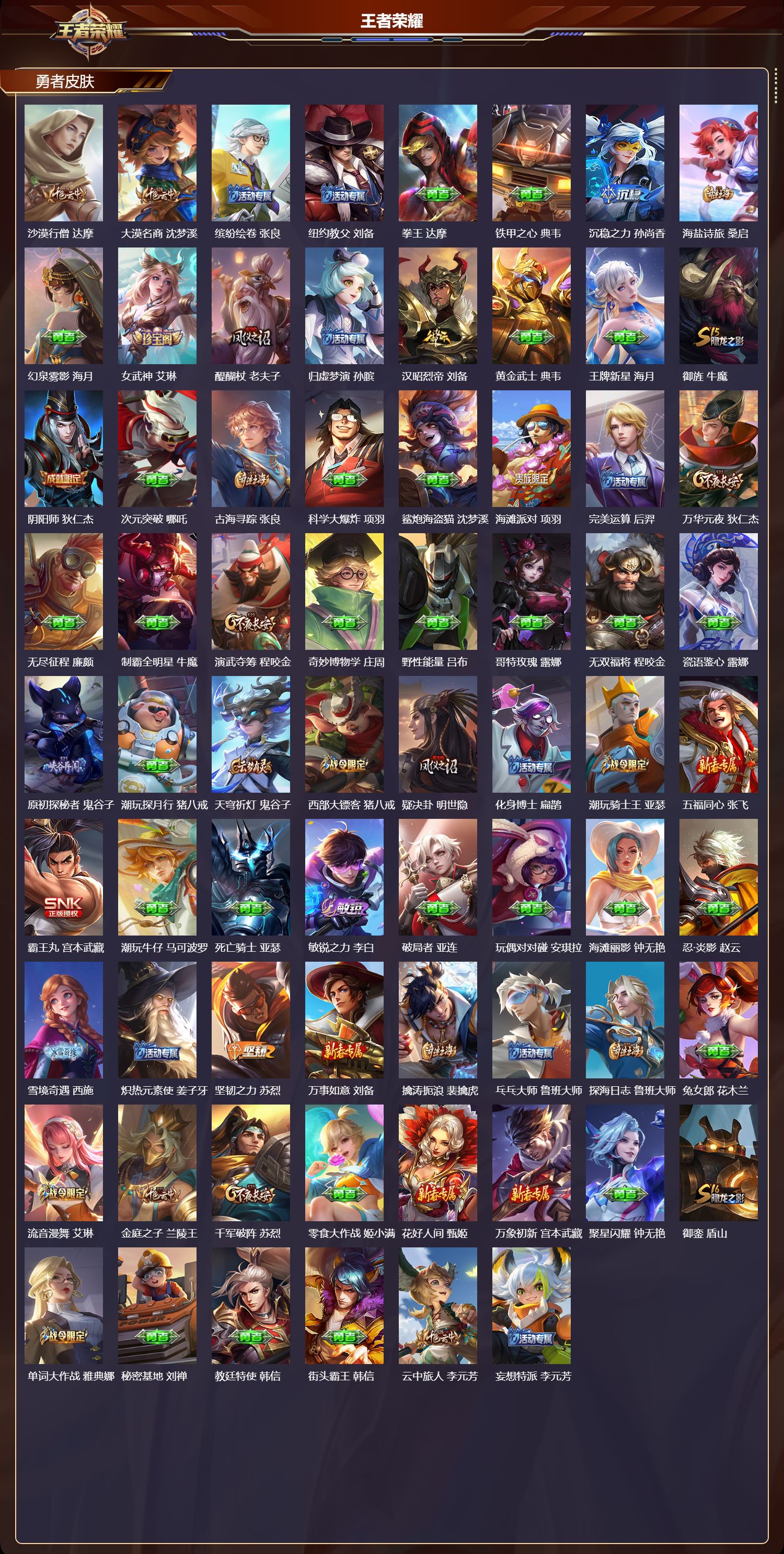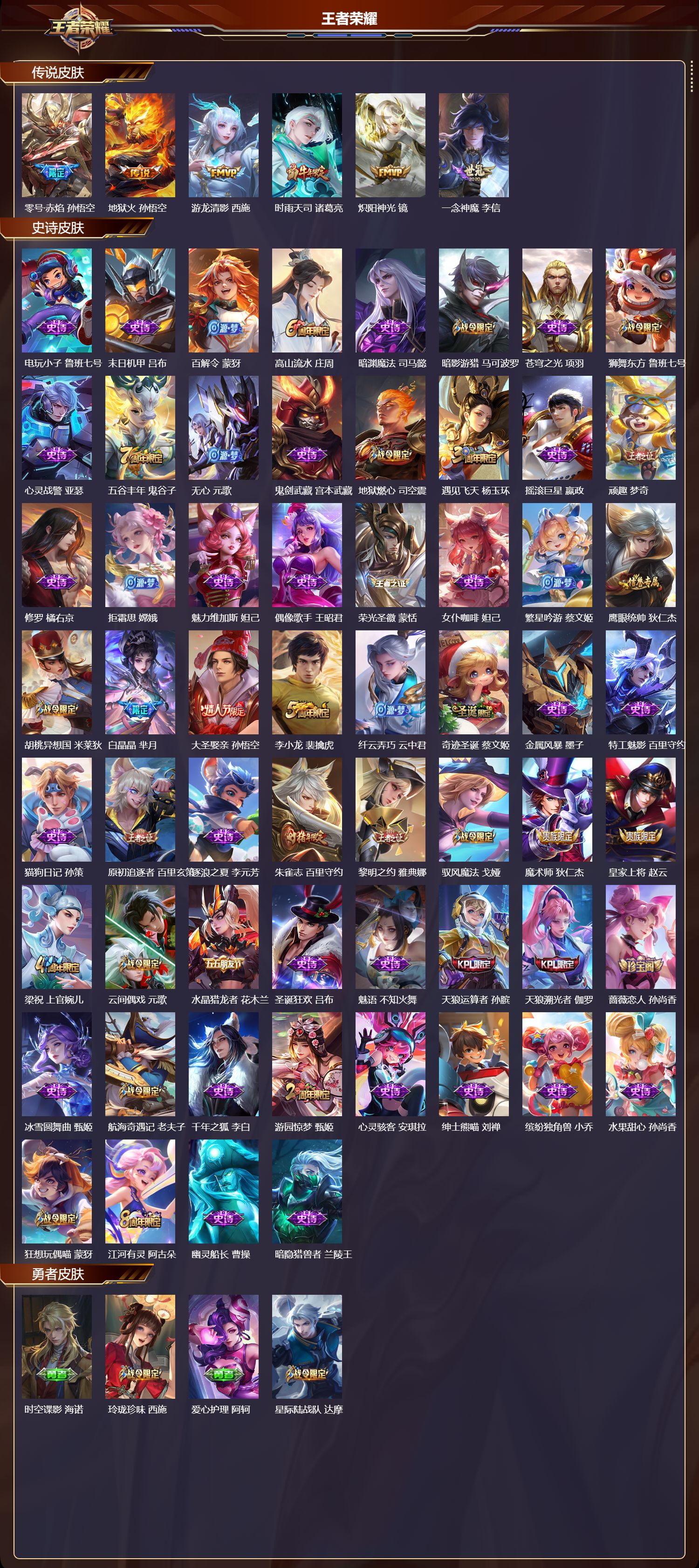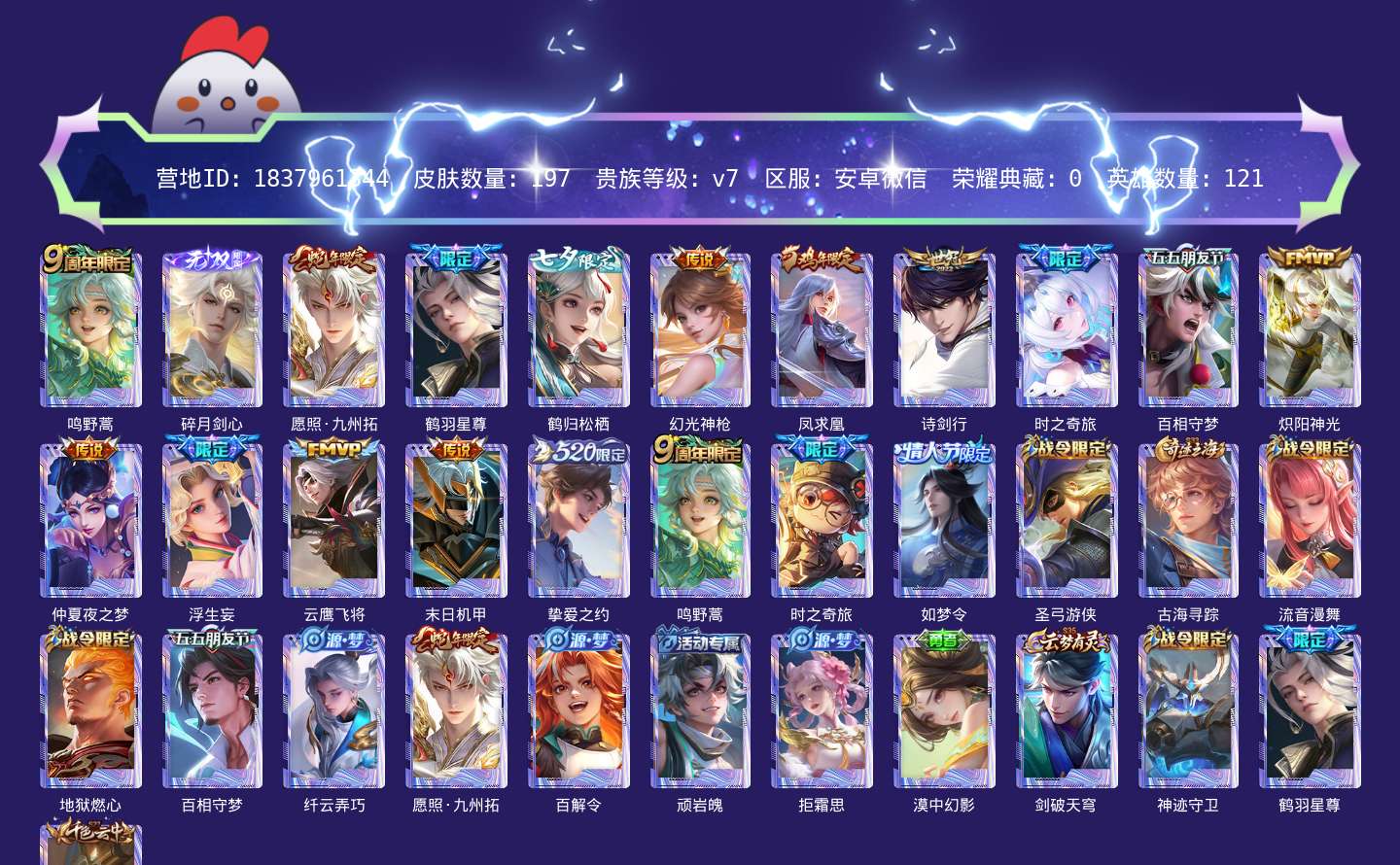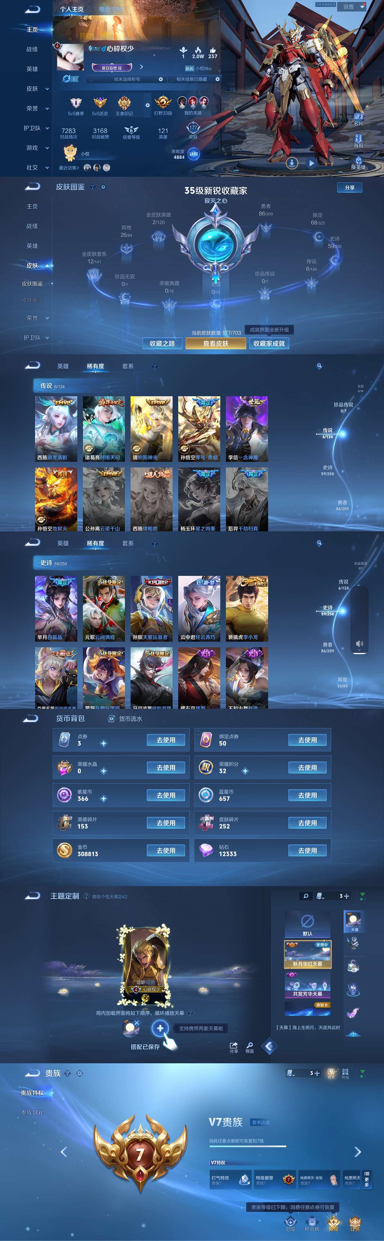 贵族等级:v7皮肤数:197情人节限定1 传说品质16 生肖限定3 无双1 英雄数:121