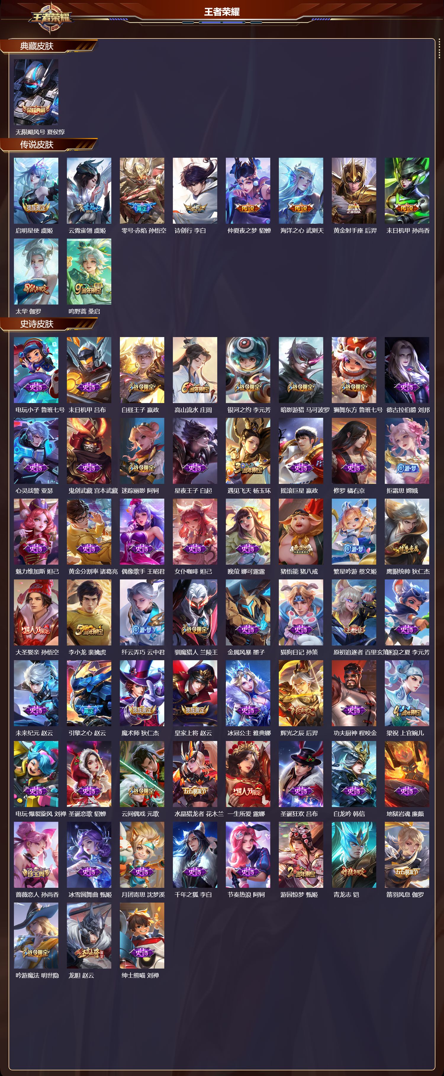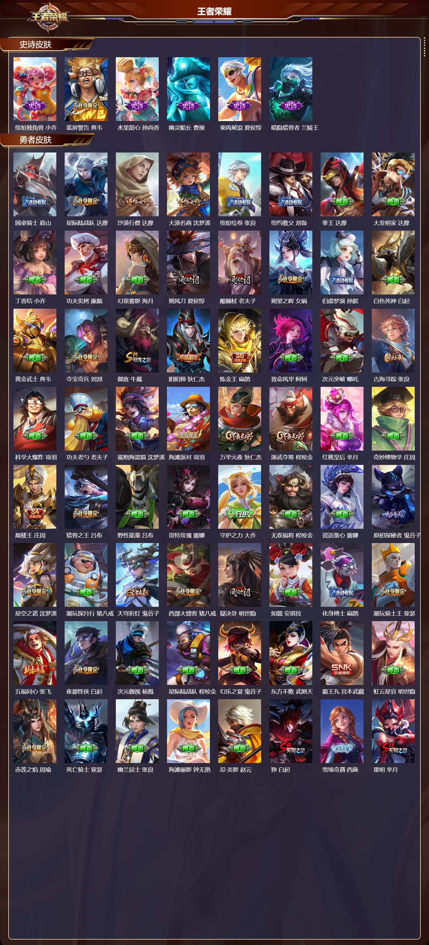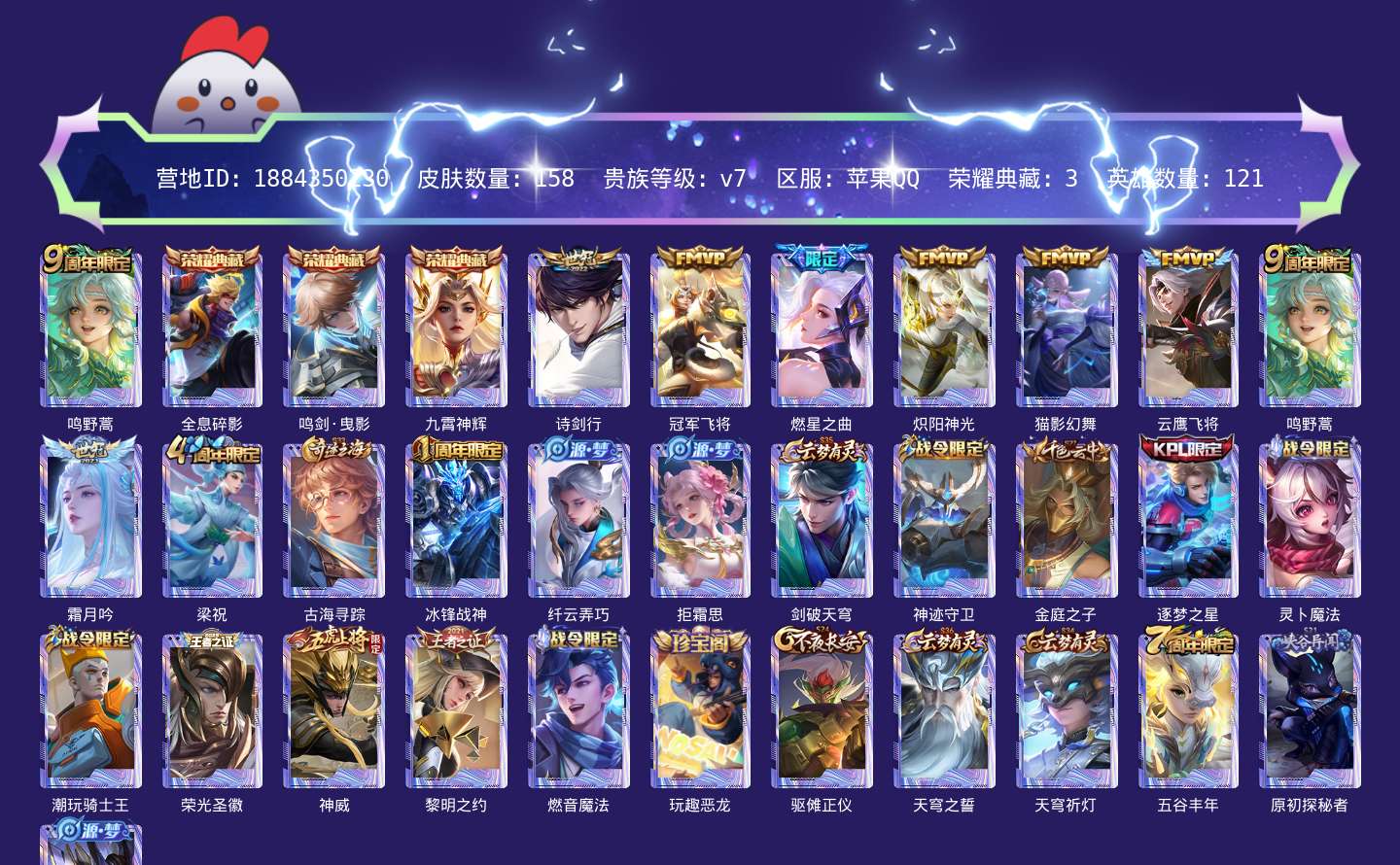 贵族等级:v7皮肤数:158荣耀典藏3 传说品质8 情人节限定2 生肖限定1 英雄数:121
