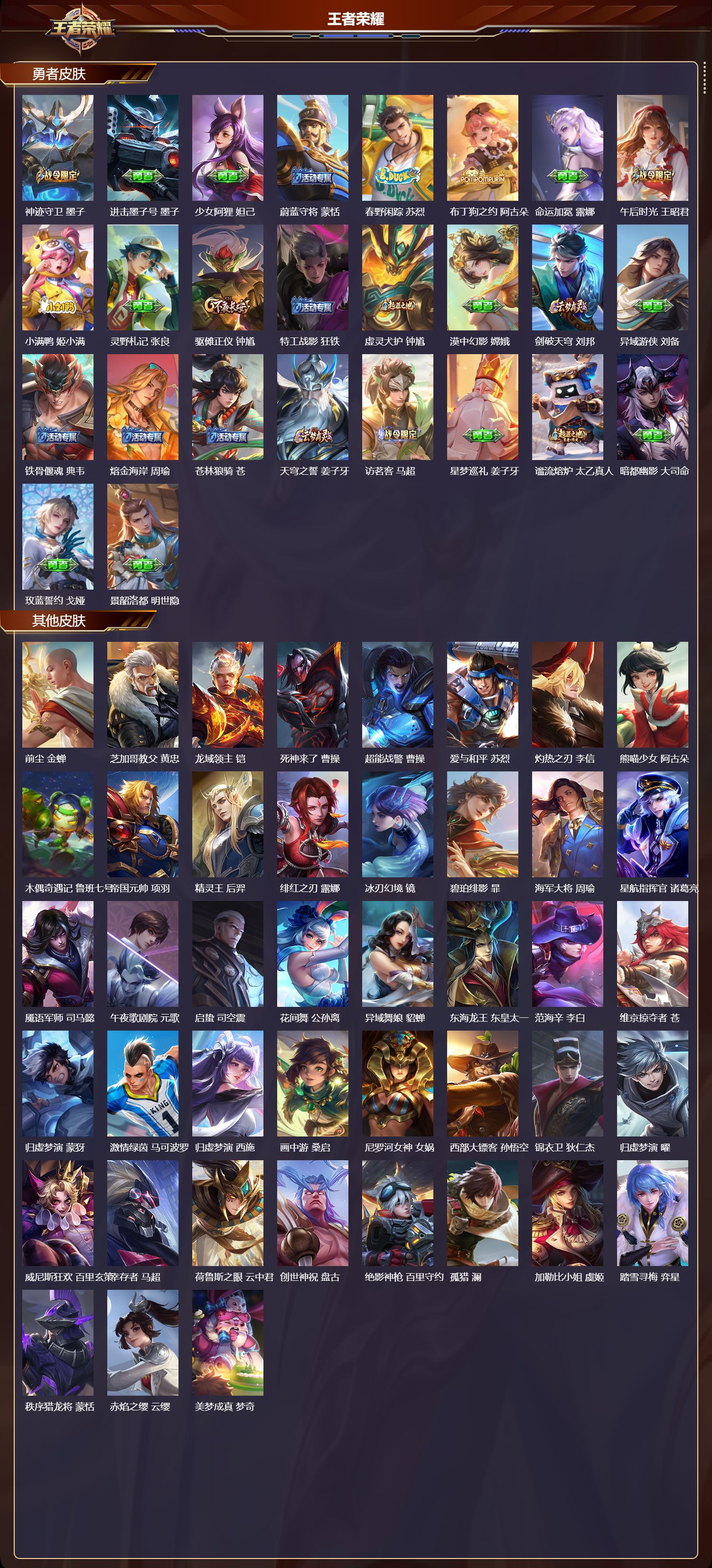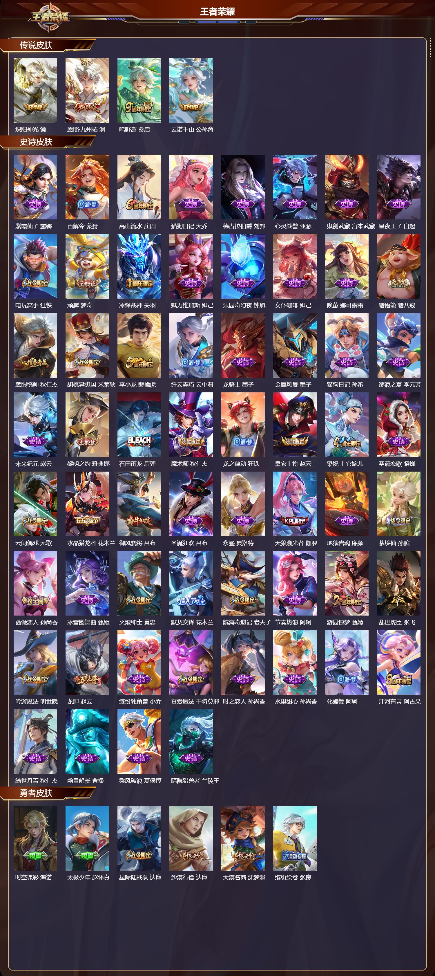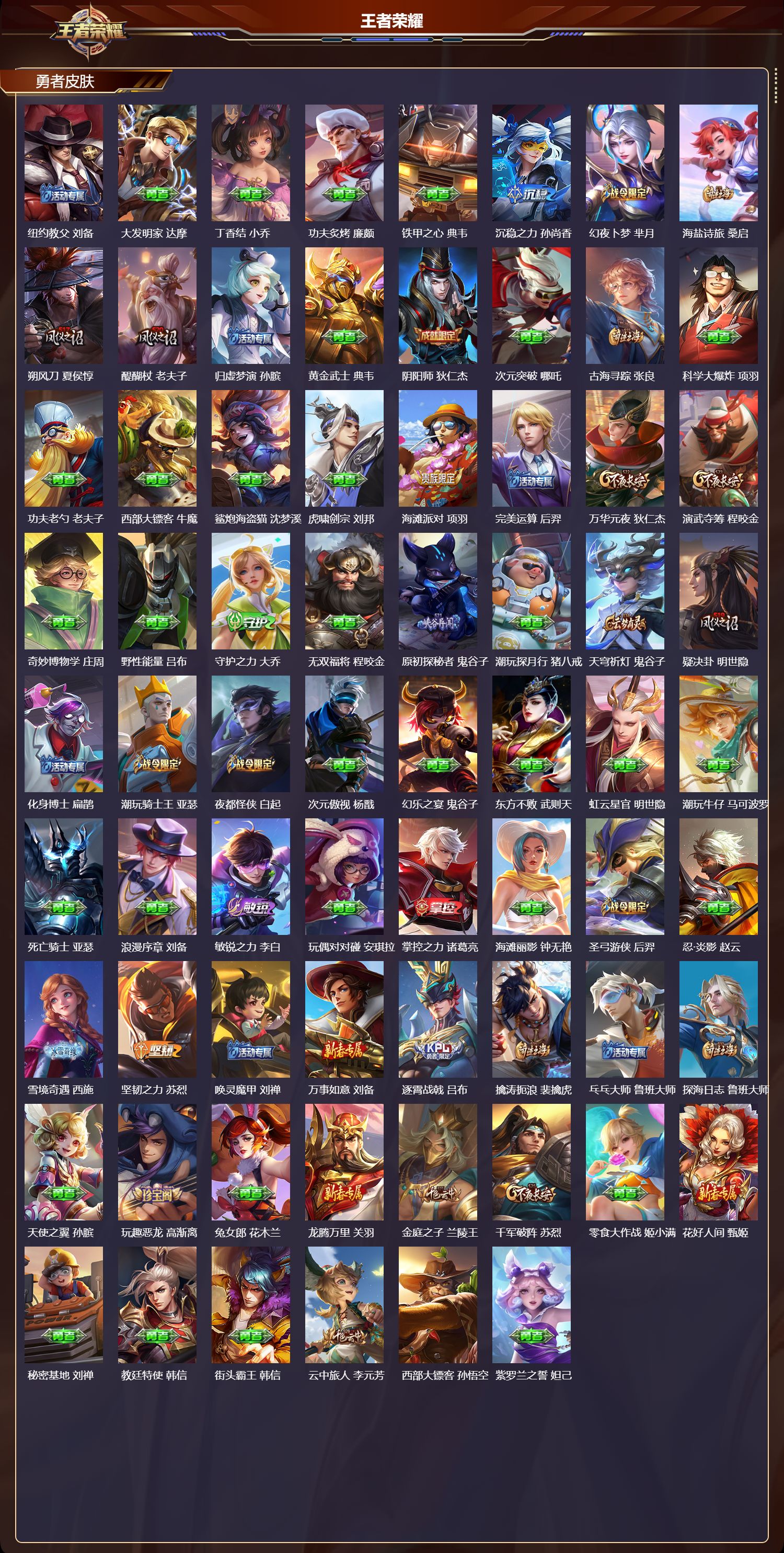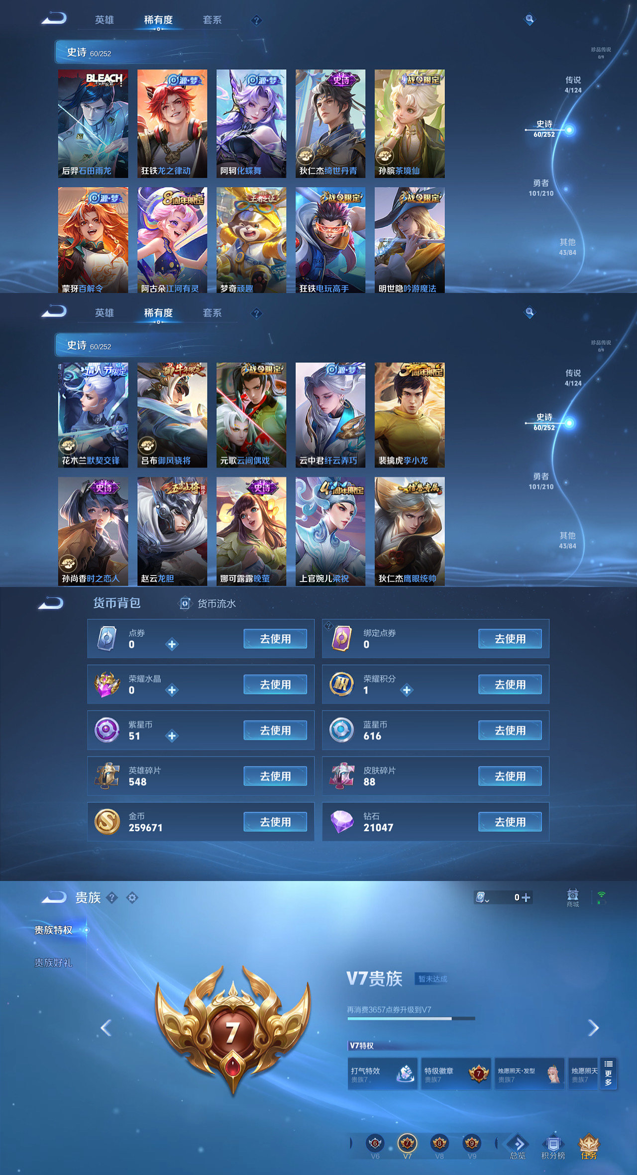 贵族等级:v7皮肤数:213传说品质11 生肖限定4 情人节限定1 荣耀典藏1 英雄数:121