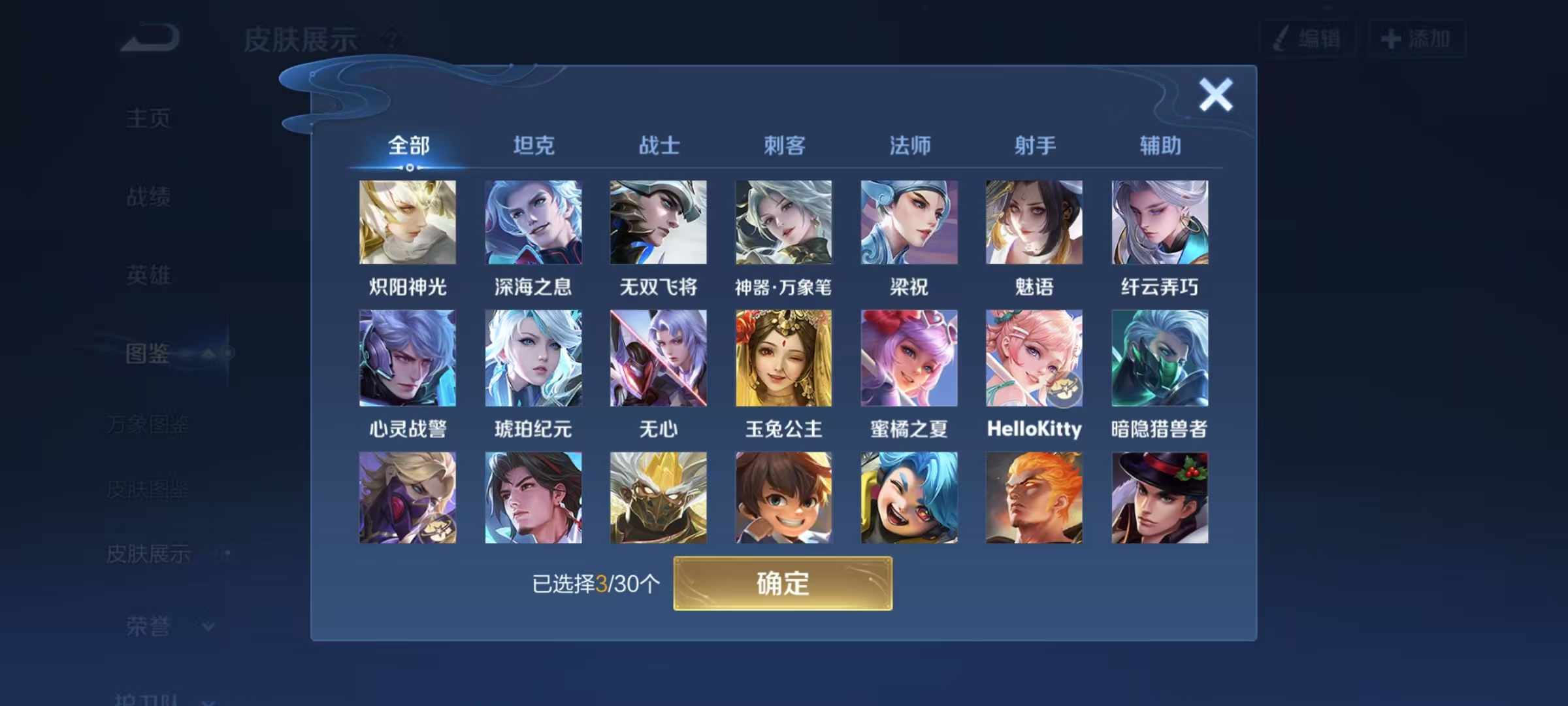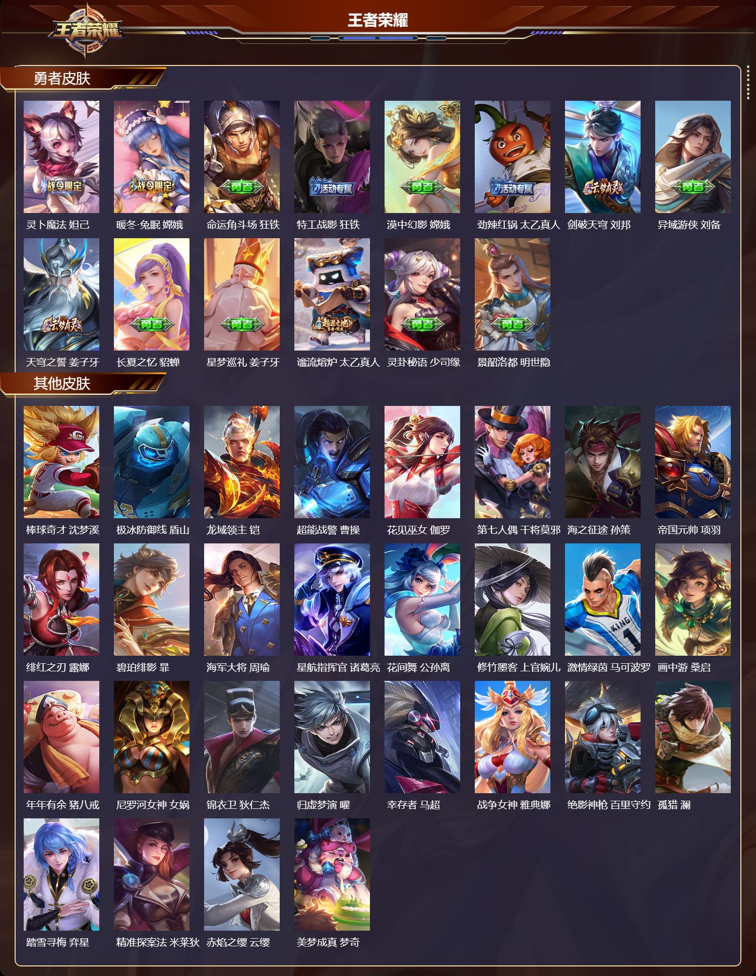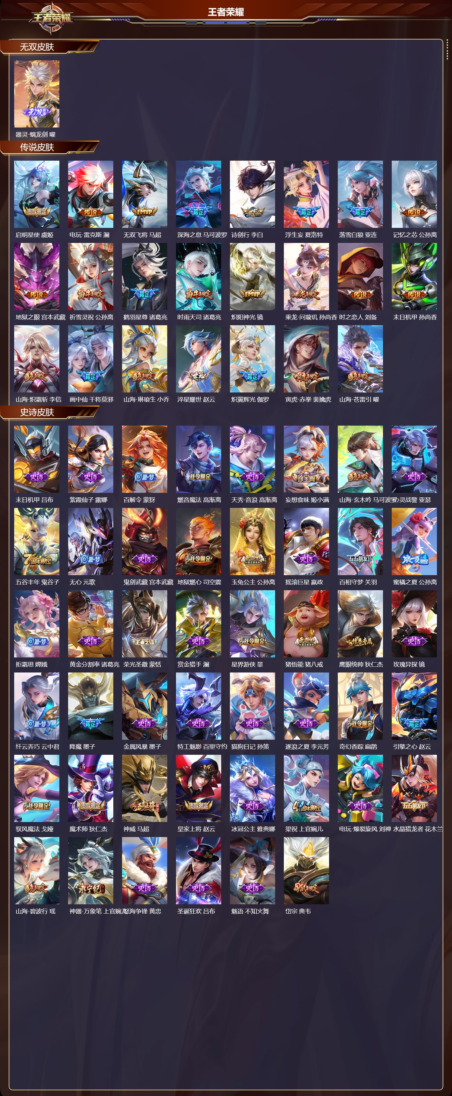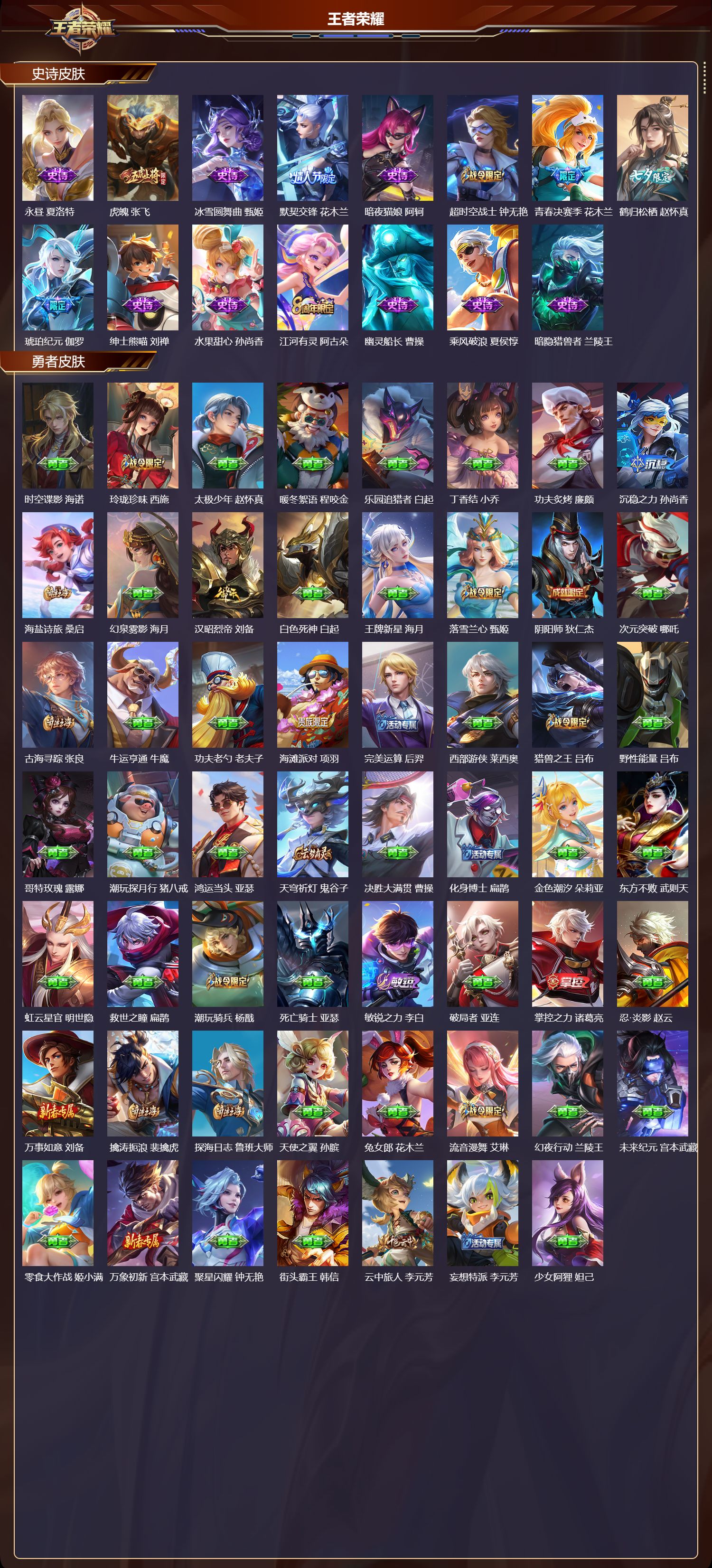 贵族等级:v6皮肤数:192情人节限定1 传说品质5 生肖限定3 英雄数:121