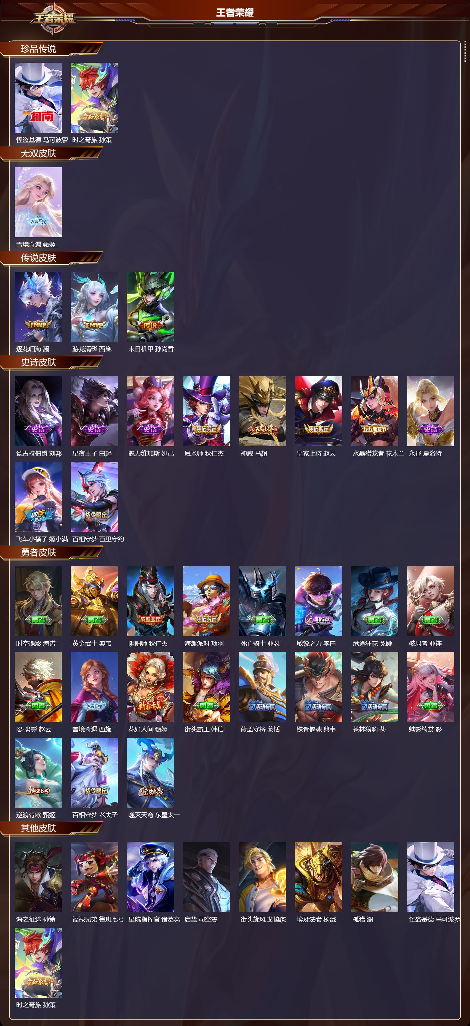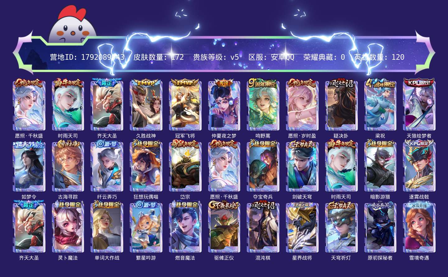 贵族等级:v5皮肤数:172情人节限定1 生肖限定4 传说品质8 英雄数:120