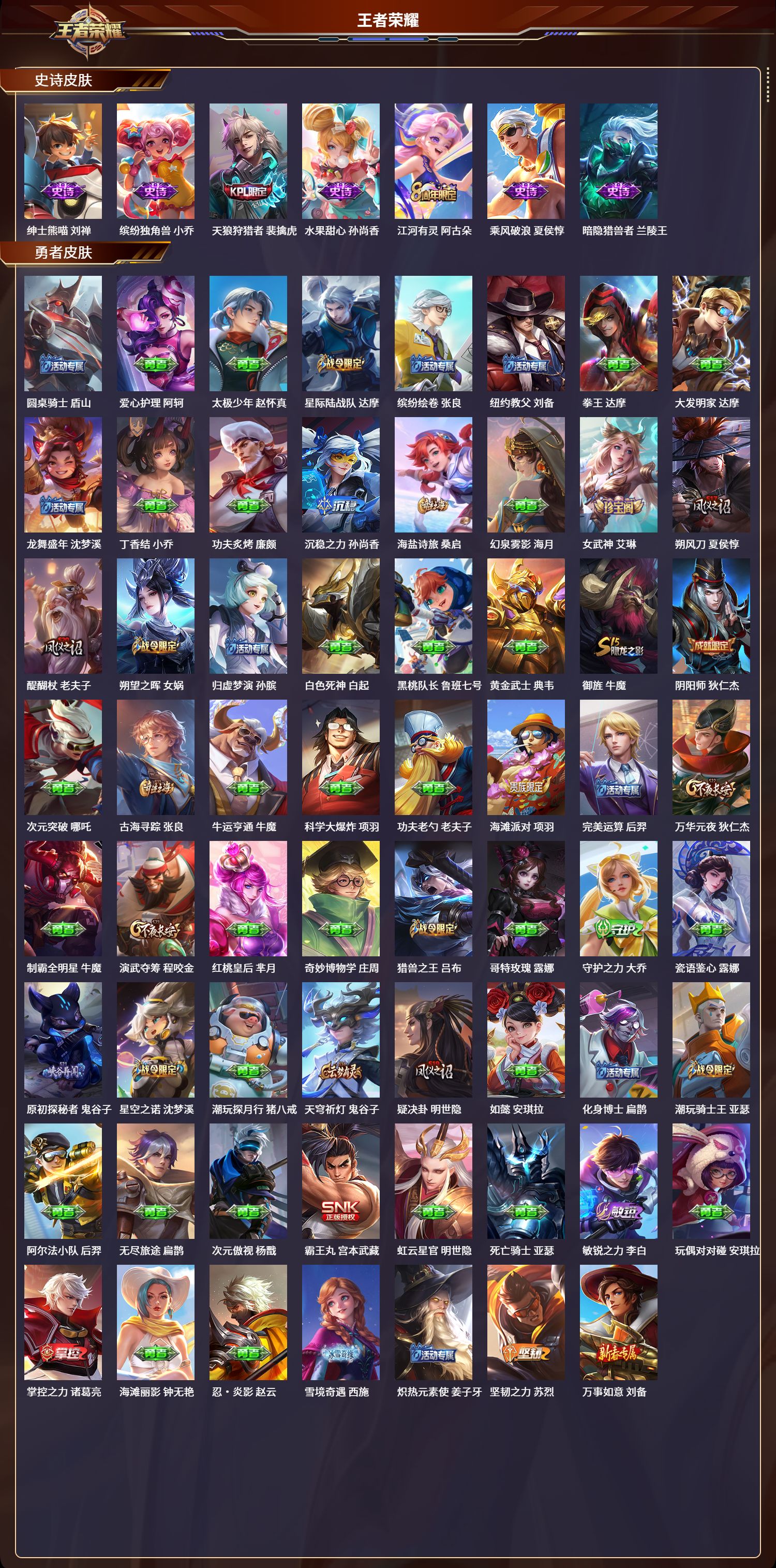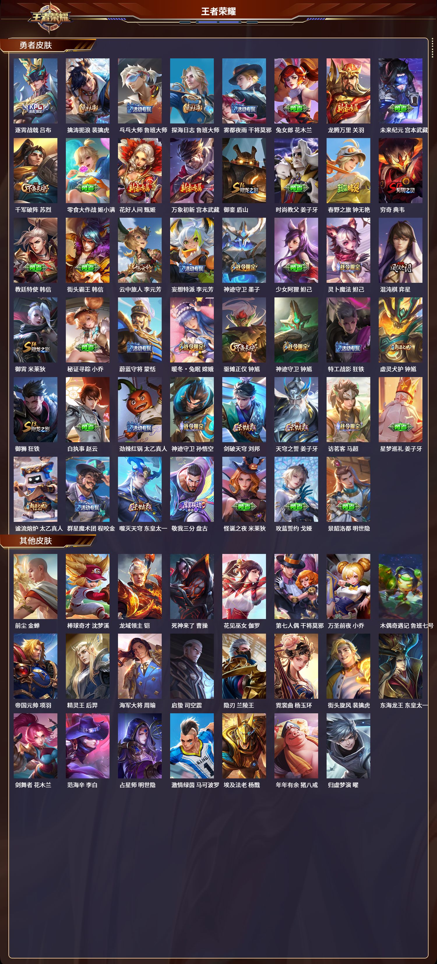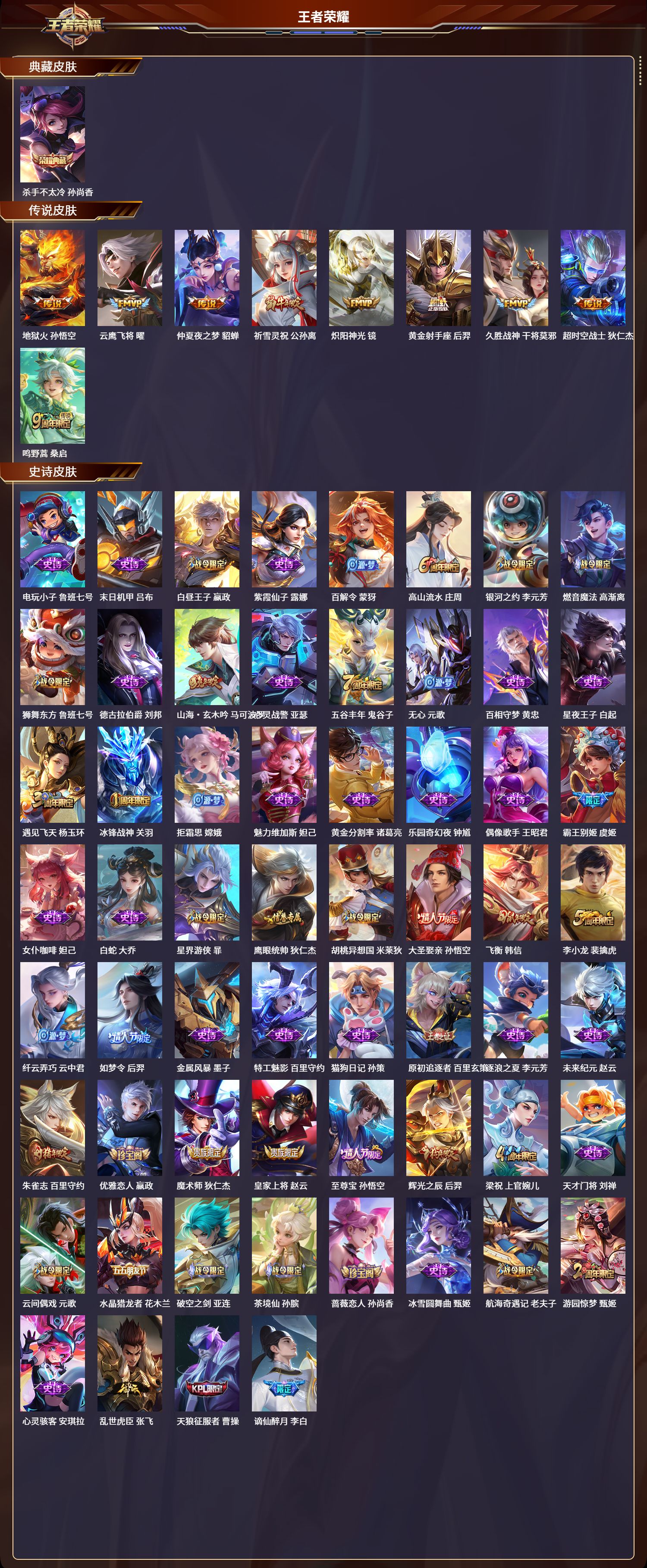 贵族等级:v6皮肤数:168传说品质3 情人节限定1 生肖限定1 英雄数:121