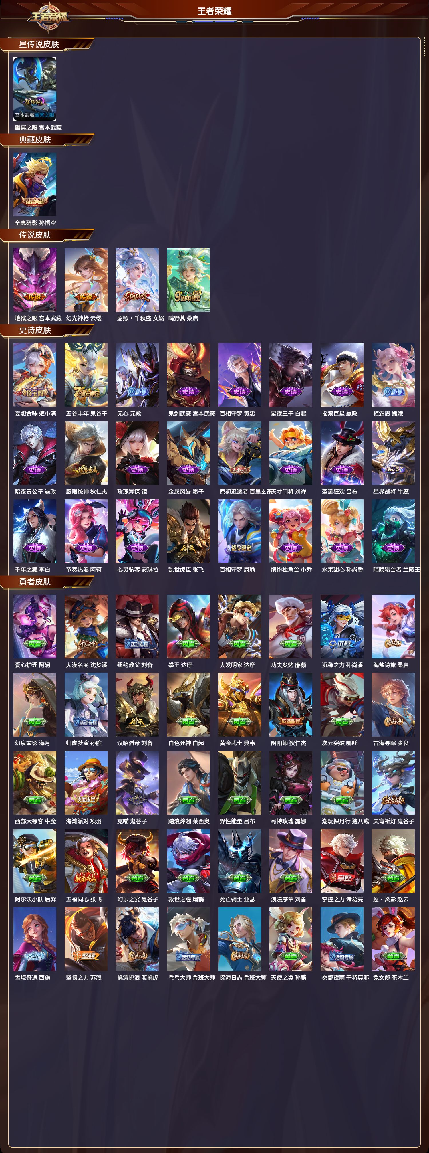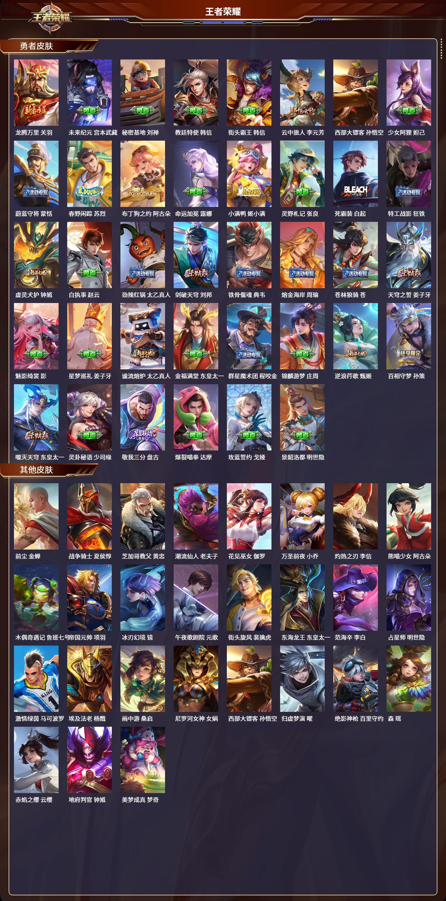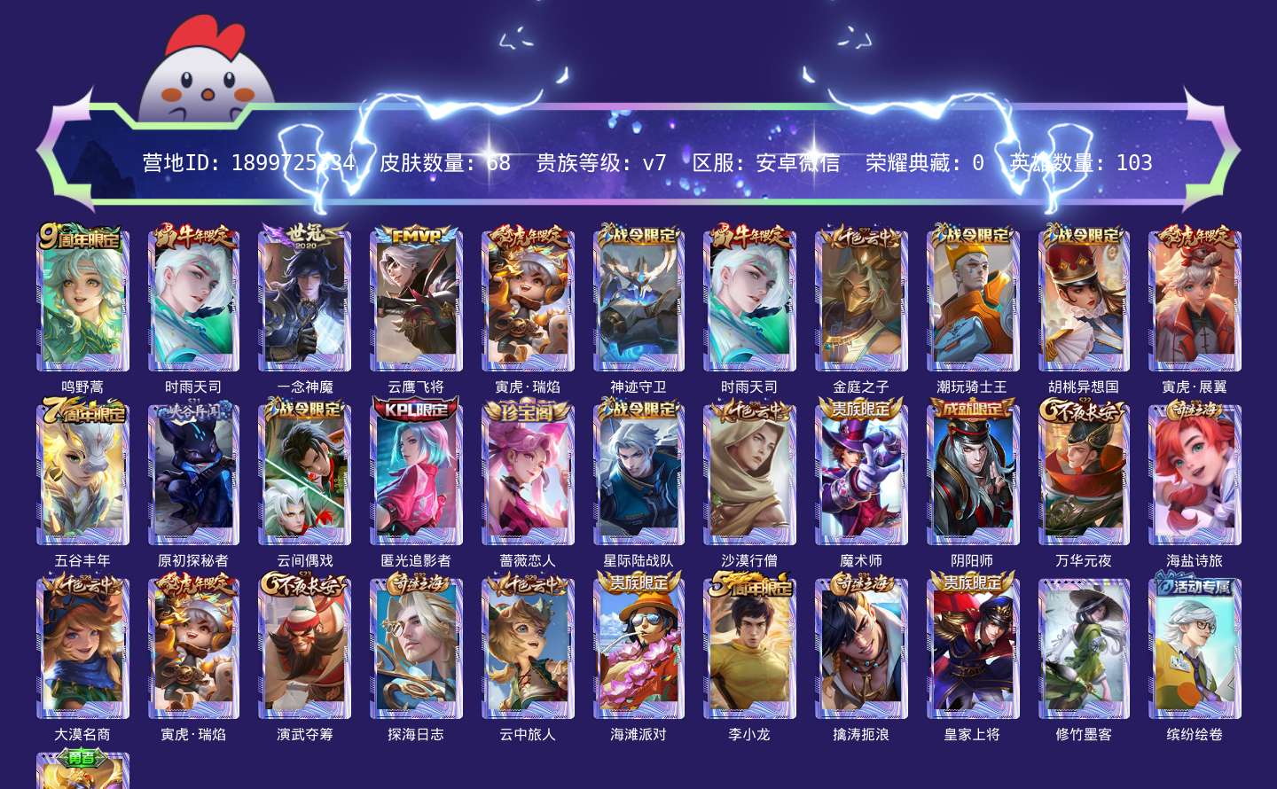 贵族等级:v7皮肤数:68传说品质4 生肖限定3 英雄数:103