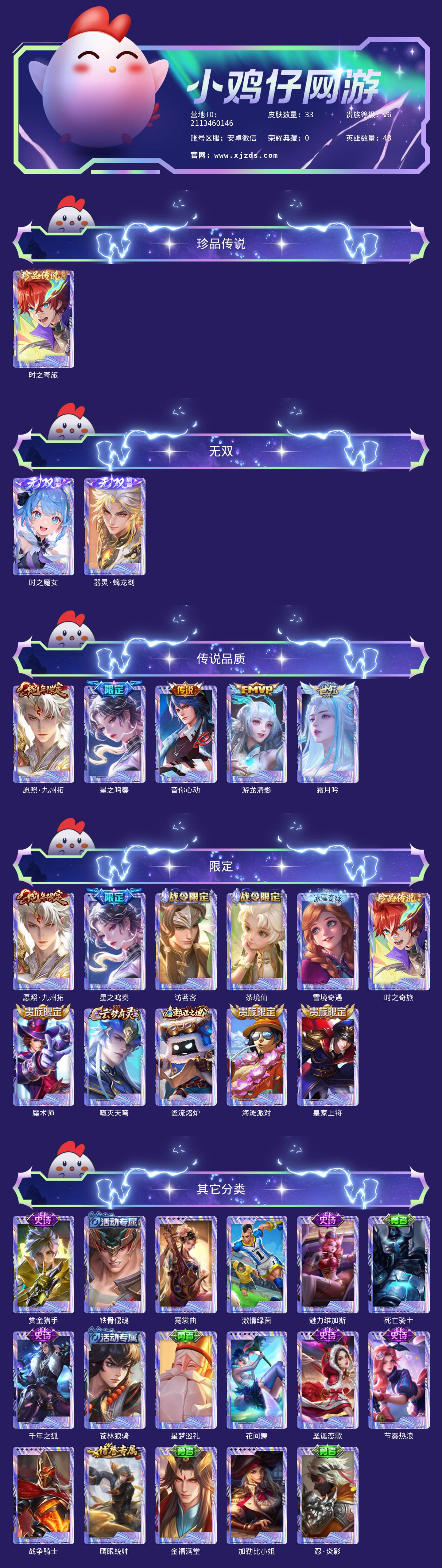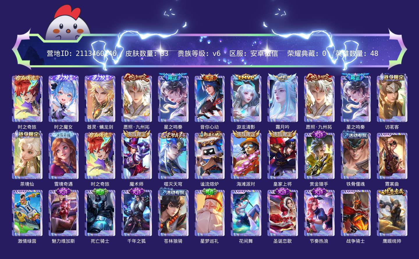 贵族等级:v6皮肤数:33传说品质5 生肖限定1 无双2 珍品传说1 英雄数:48