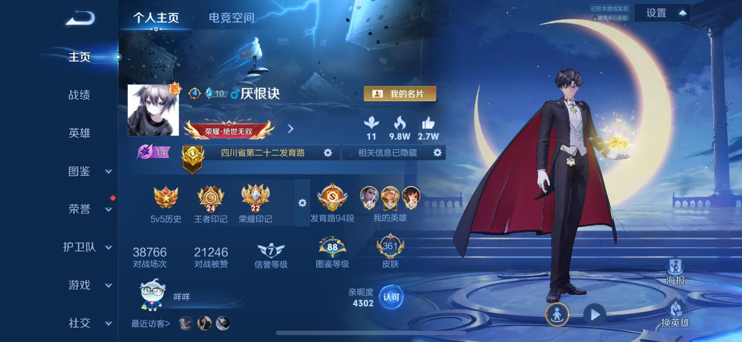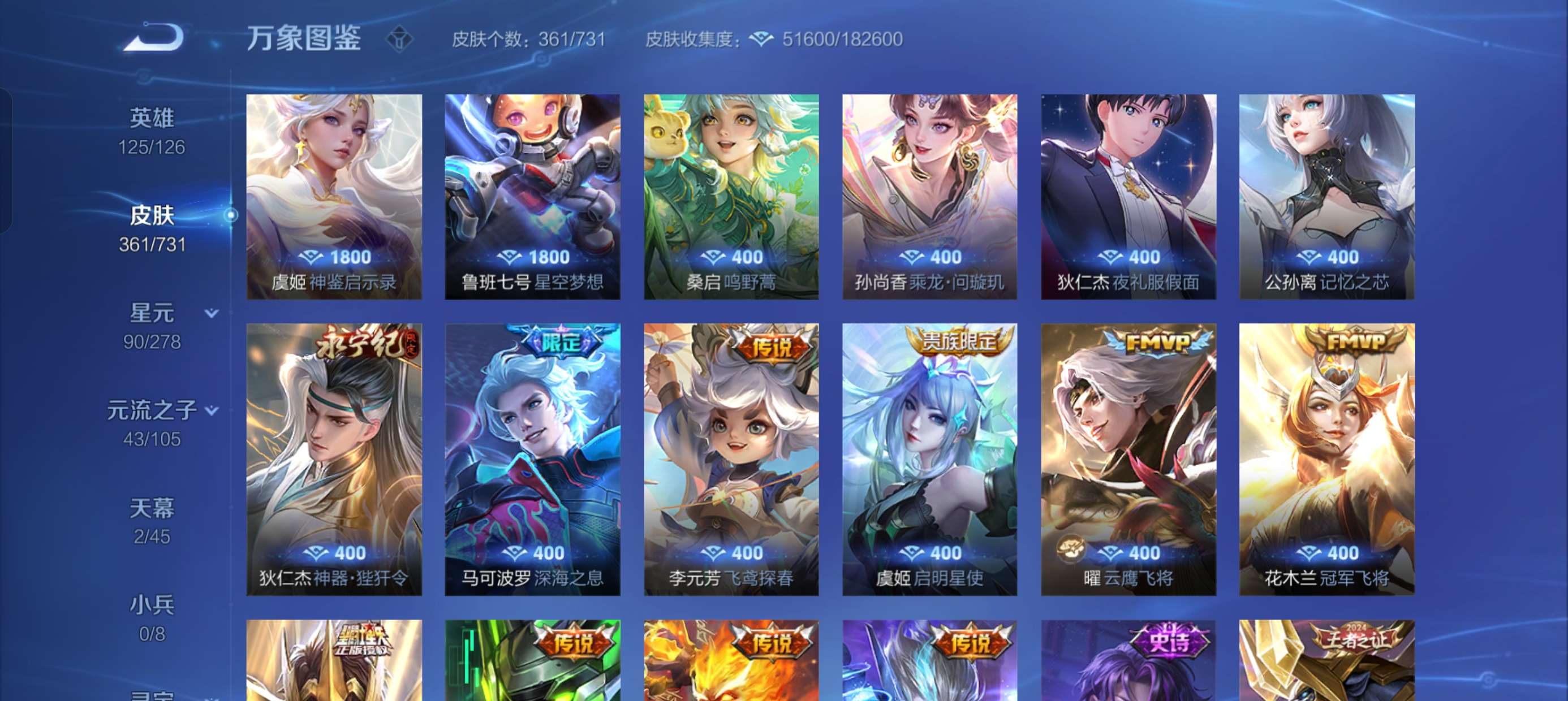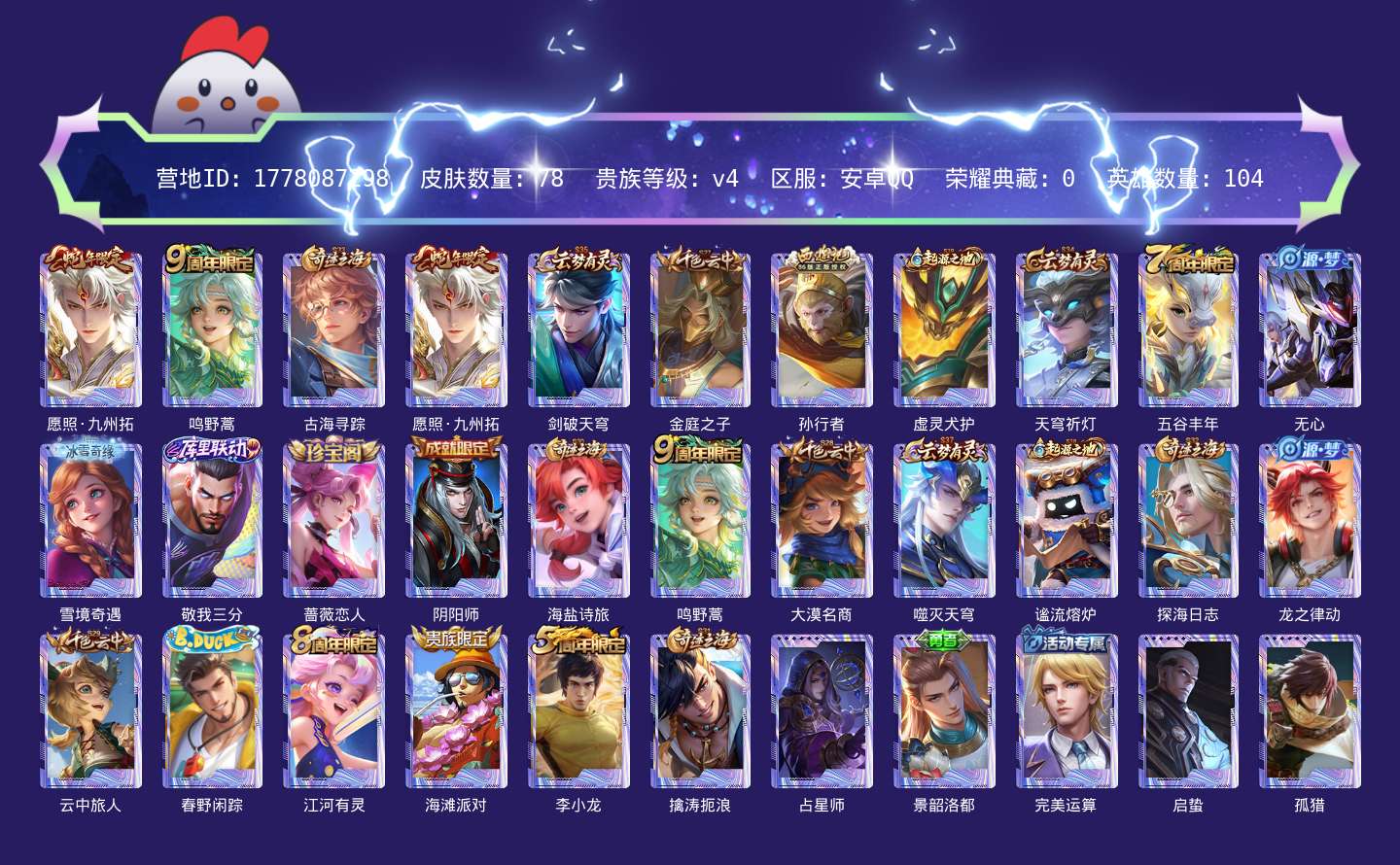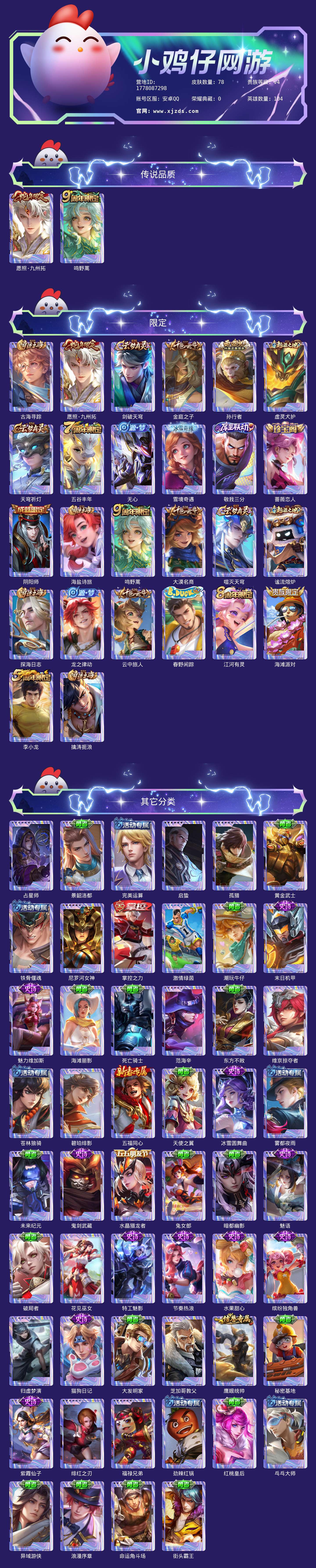 贵族等级:v4皮肤数:78传说品质2 生肖限定1 英雄数:104