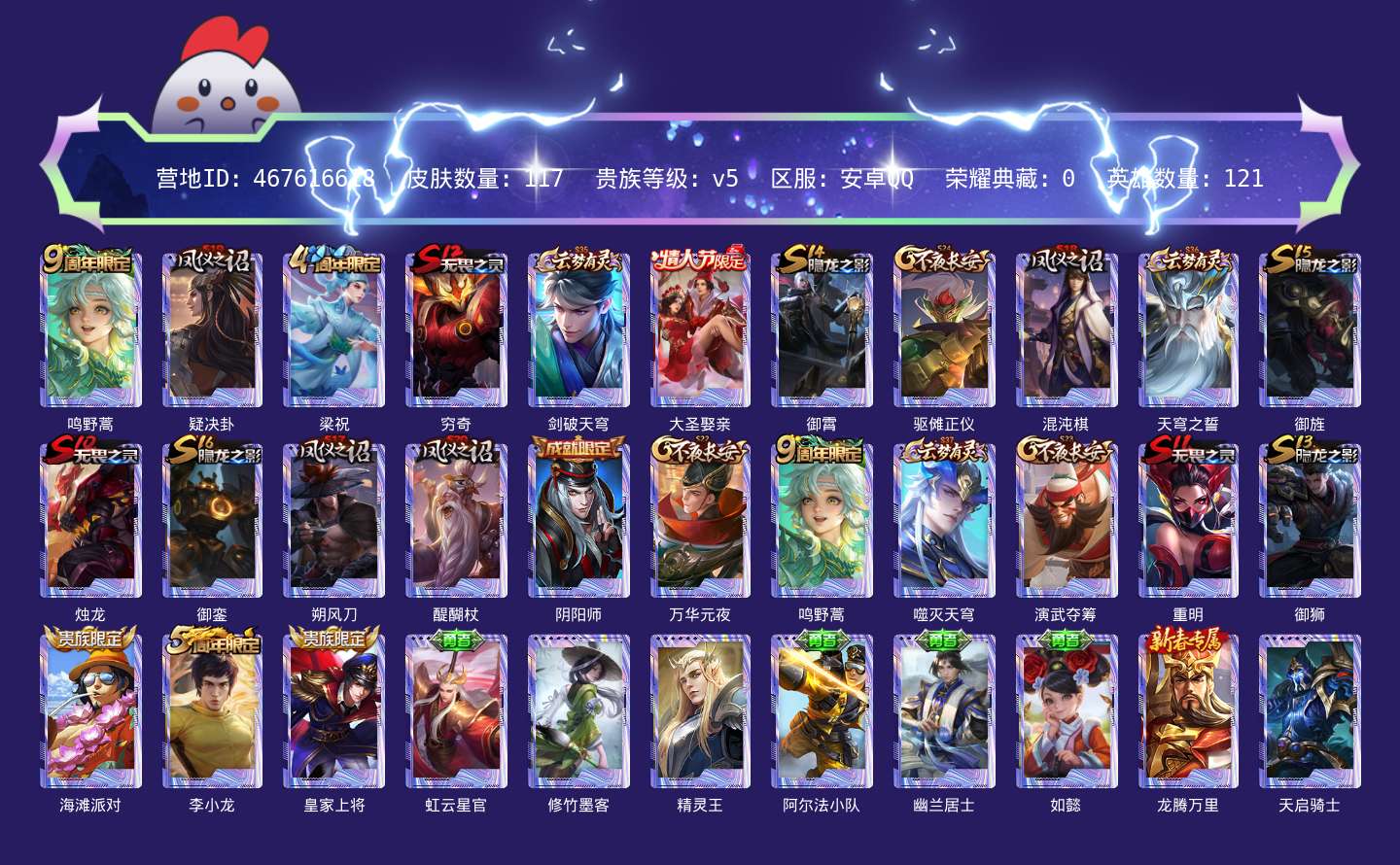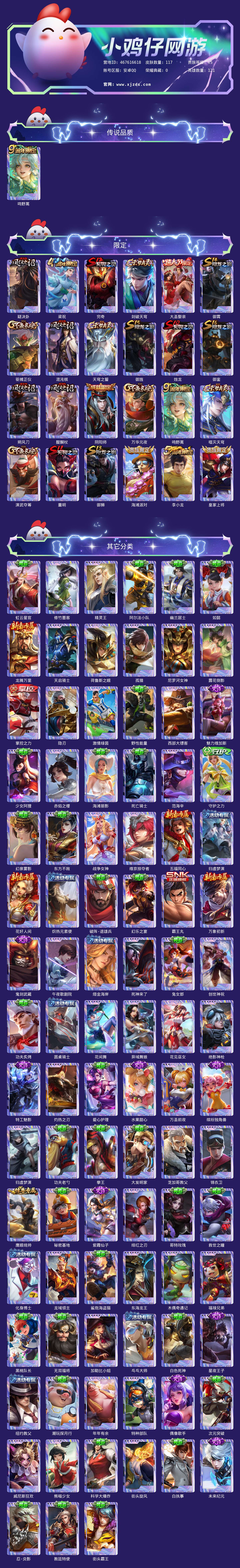 贵族等级:v5皮肤数:117情人节限定1 传说品质1 英雄数:121