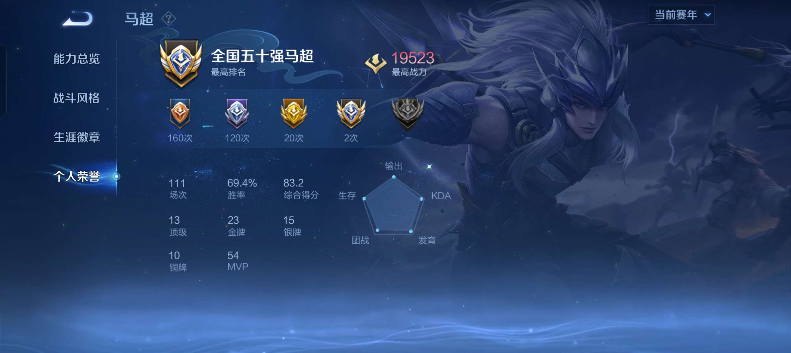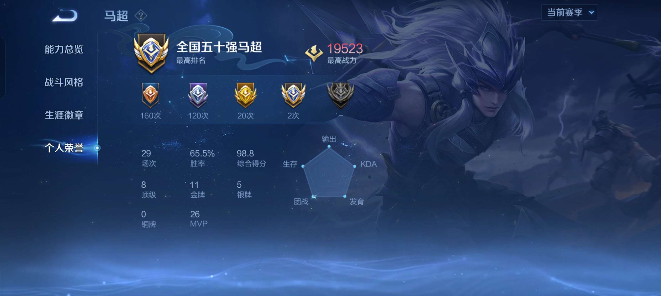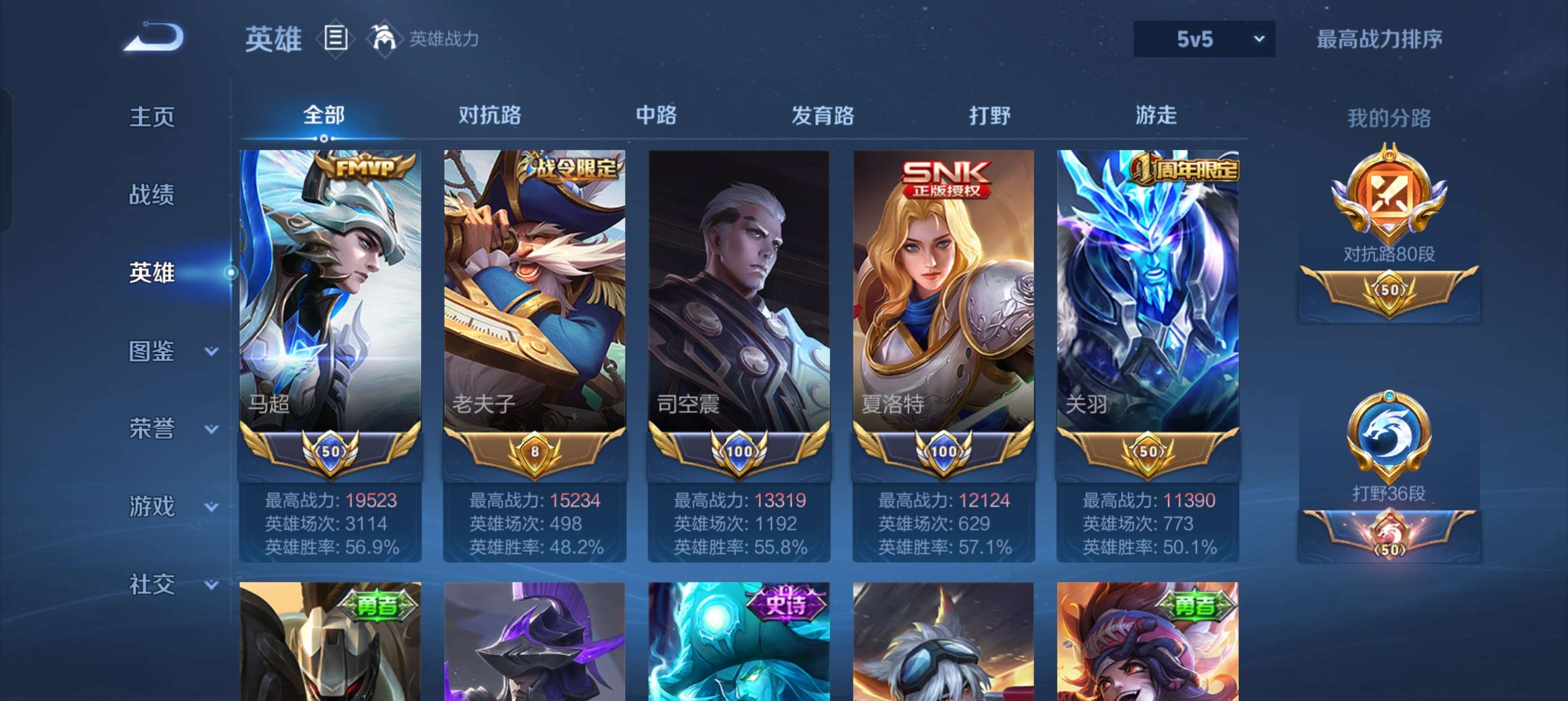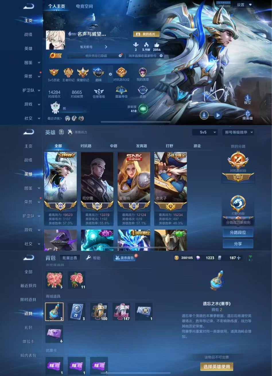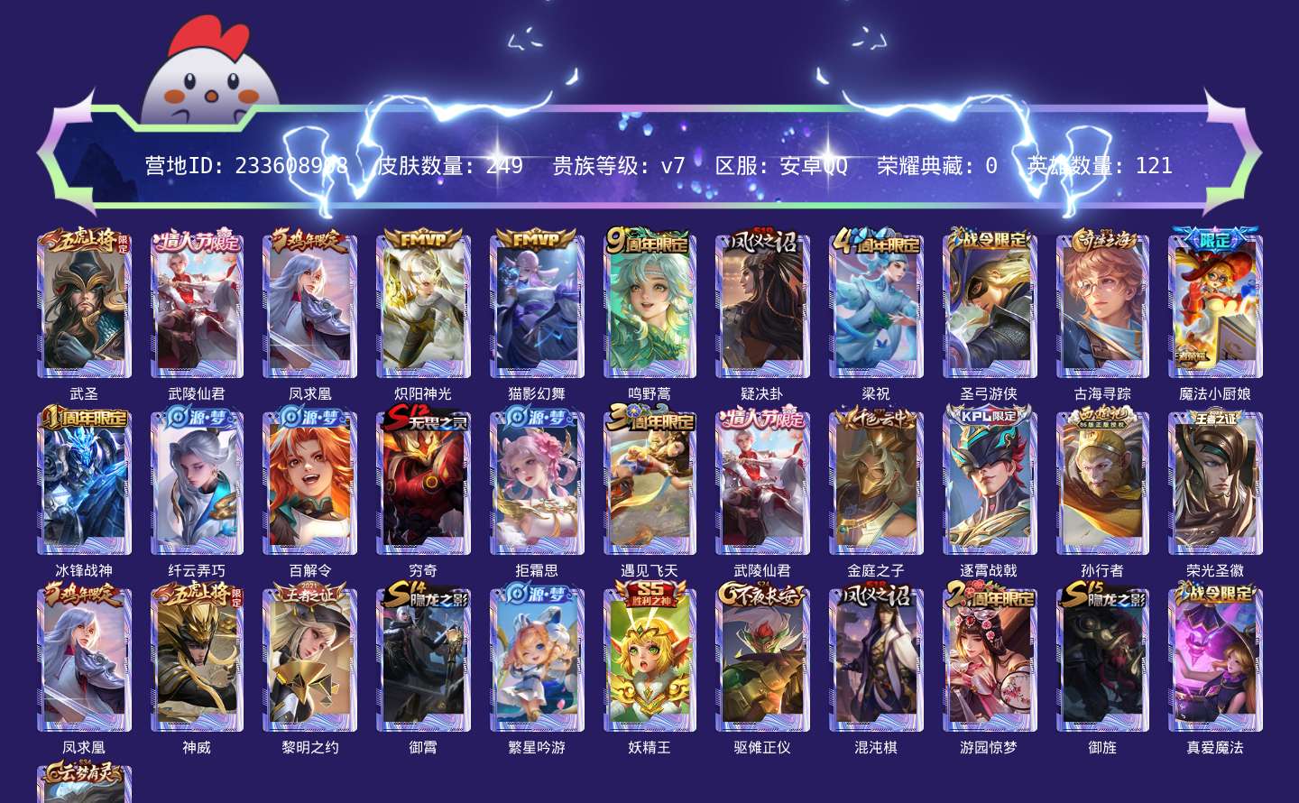 贵族等级:v7皮肤数:249传说品质5 情人节限定1 生肖限定1 英雄数:121