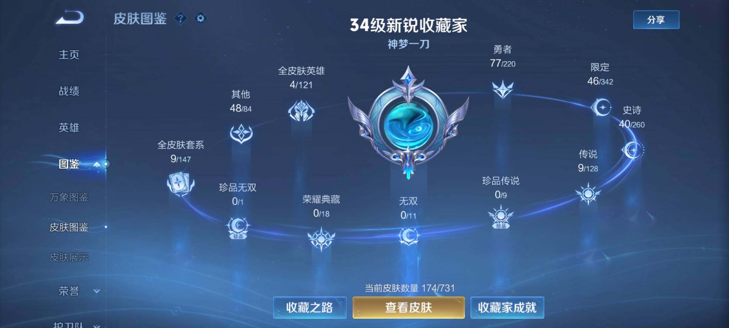 贵族等级:v9皮肤数:370传说品质39 情人节限定2 生肖限定18 荣耀典藏1 英雄数:123